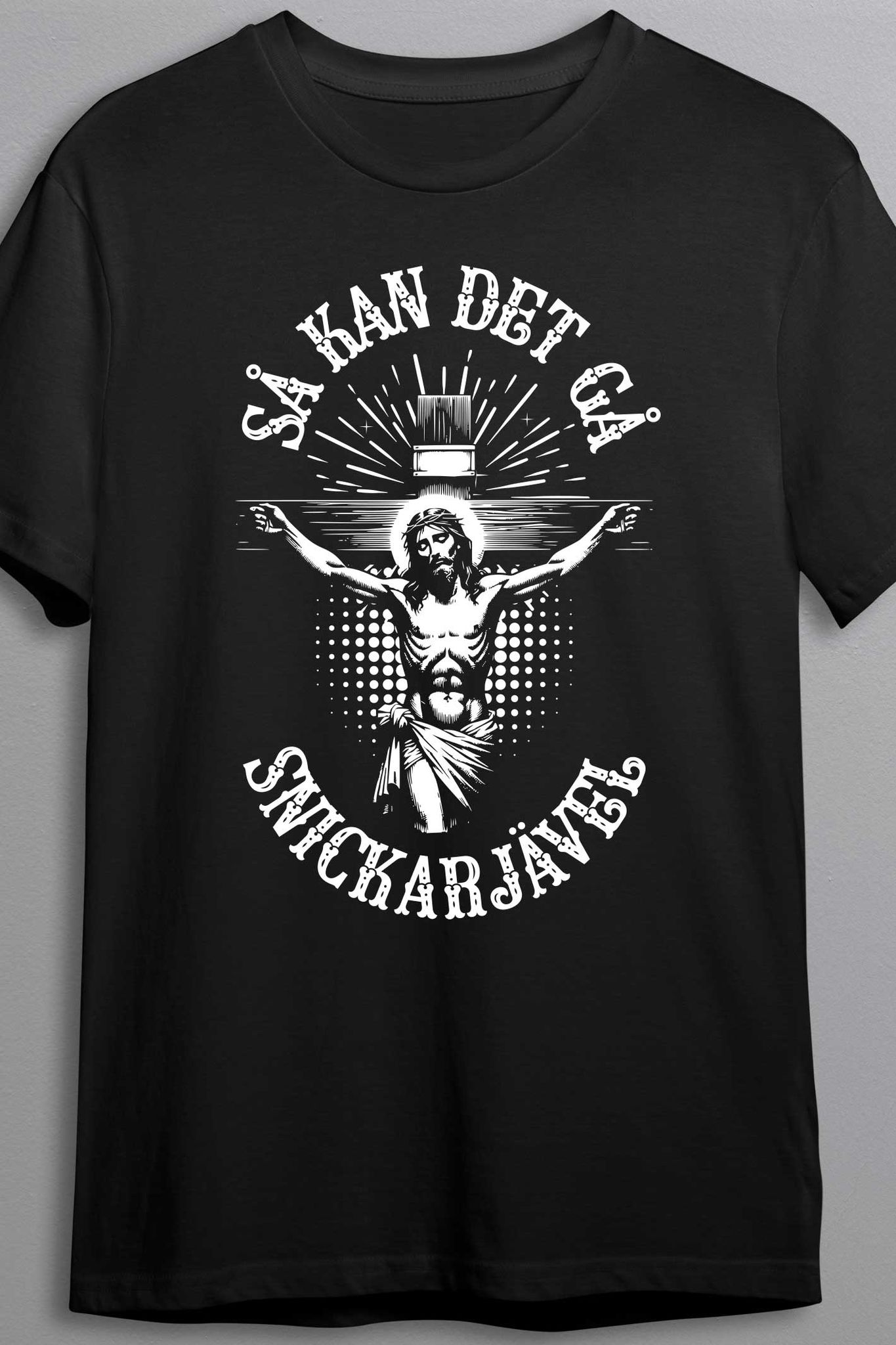 Med texten ”Så kan det gå, snickarjävel” och en grafisk bild av korsfästelsen får du ett plagg som garanterat väcker både skratt, höjda ögonbryn och kanske en och annan diskussion vid middagsbordet. Perfekt för dig som gillar att tänja på gränserna, kombinera humor med provokation och inte är rädd för att sticka ut i mängden.