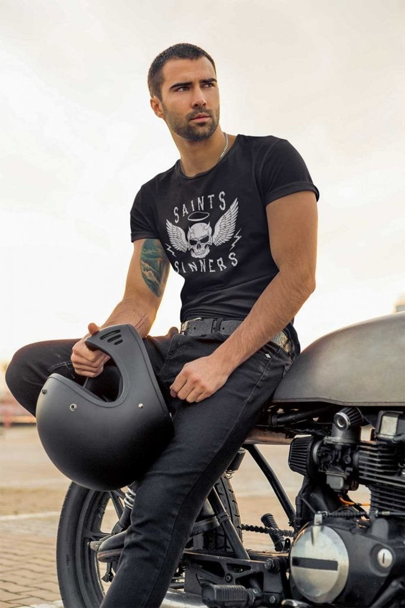 Denna Saints and Sinners T-shirt kombinerar stil och komfort på ett unikt sätt. Tillverkad av högkvalitativ bomull, erbjuder tröjan både mjukhet och hållbarhet, vilket gör den perfekt för dagligt bruk. Designen är inspirerad av motorcykelkultur och rock'n'roll-estetik, vilket gör den till ett utmärkt val för dem som vill uttrycka en rebellisk och modig stil.
