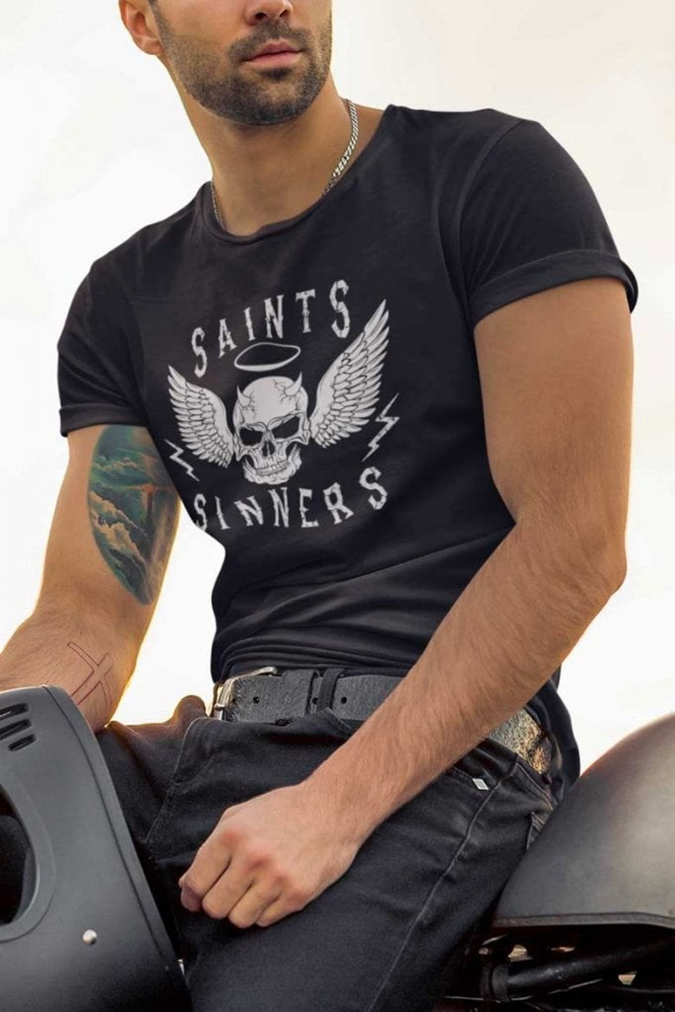 Tröjan är svart och har ett vitt tryck med texten "Saints" ovanför och "Sinners" nedanför en central dödskalle med vingar och en gloria ovanpå huvudet. Den är kortärmad med uppvikta kanter för en avslappnad look och har en rund hals för en klassisk passform.