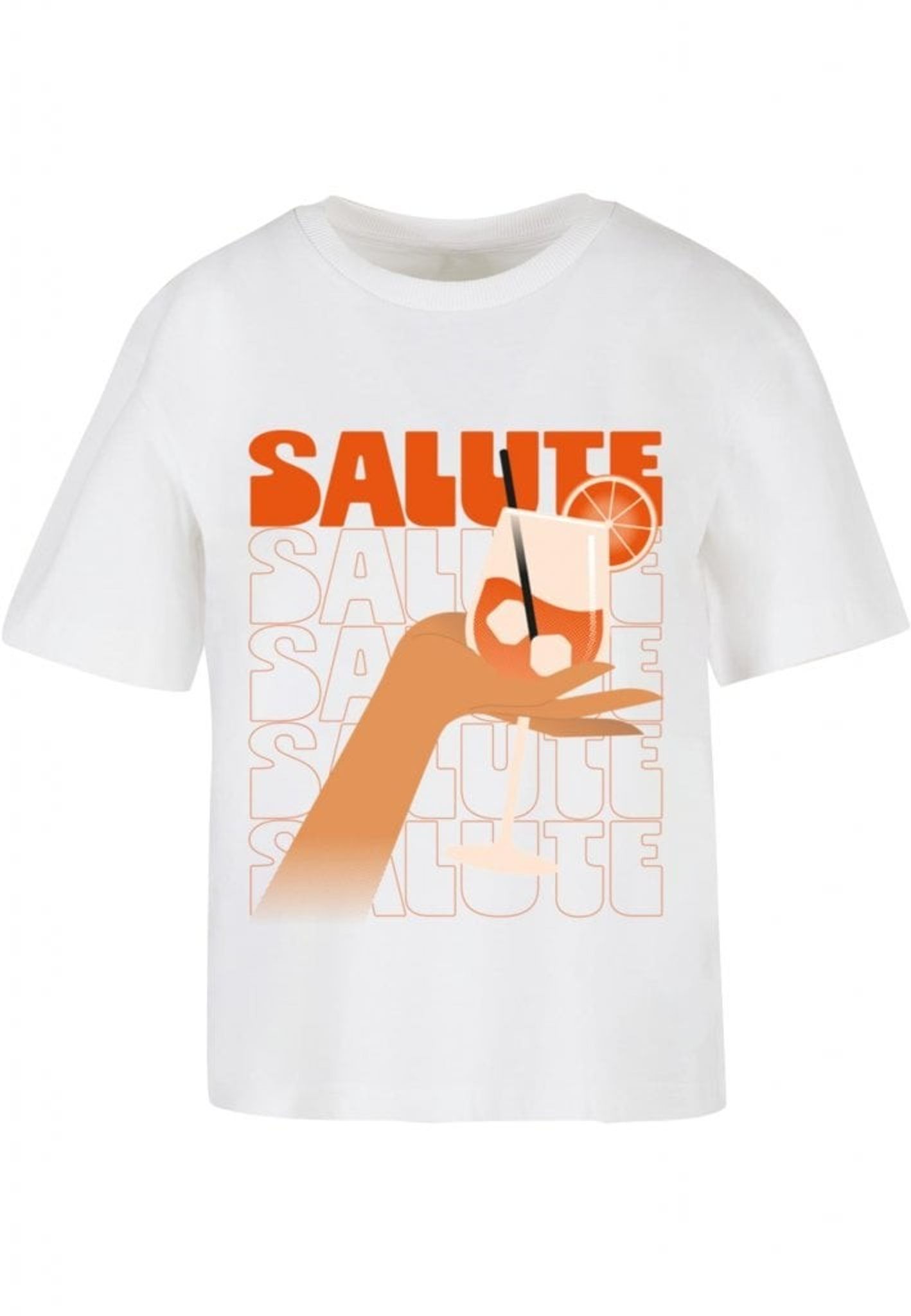 Denna oversized t-shirt är perfekt för alla kvinnor som älskar att skåla i en god drink! Motivet på plagget visar en hand som håller ett vinglas med en uppfriskande drink, komplett med isbitar och en apelsinskiva på kanten. Bakom handen och glaset står ordet "SALUTE" flera gånger i olika storlekar och nyanser av orange.