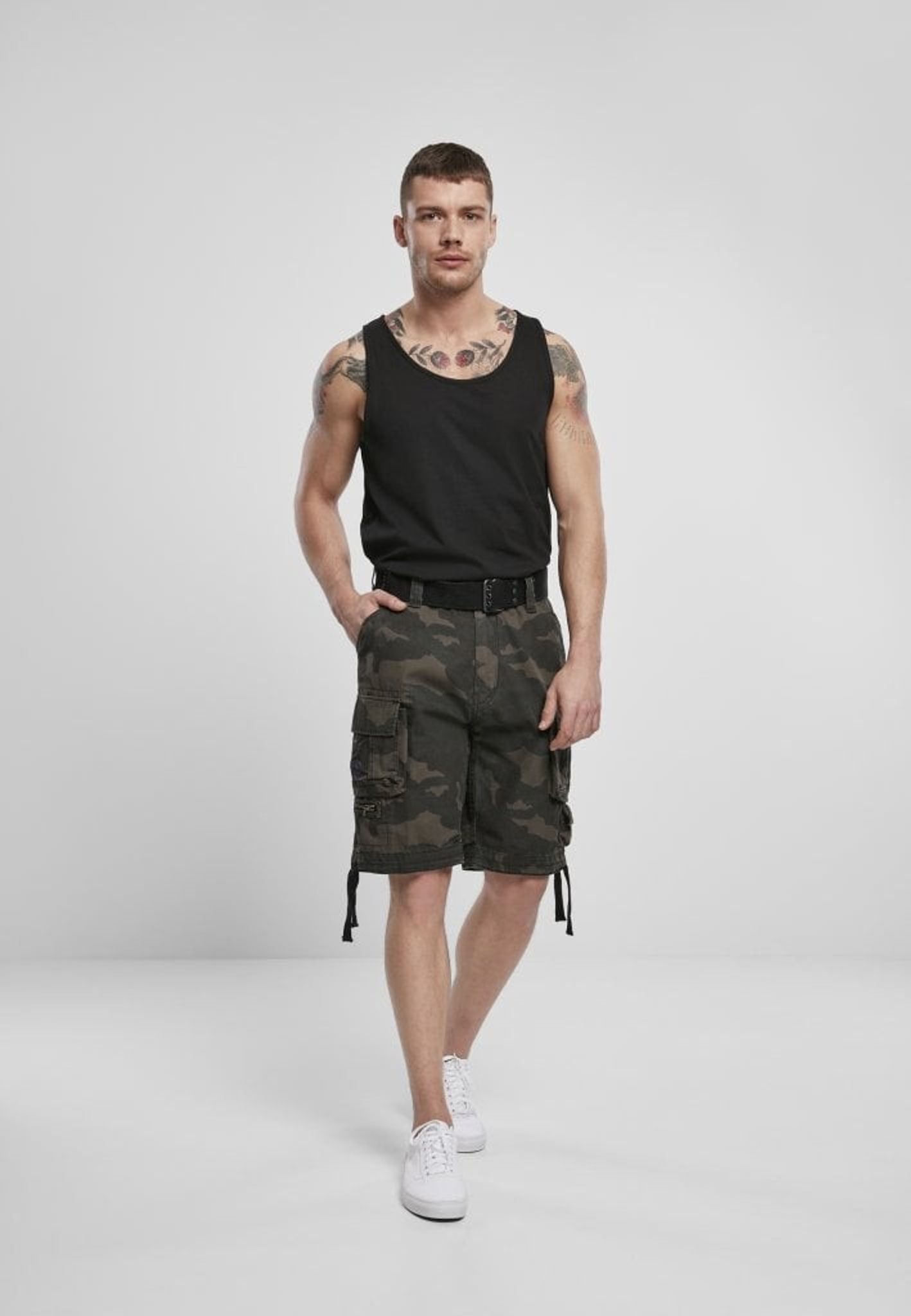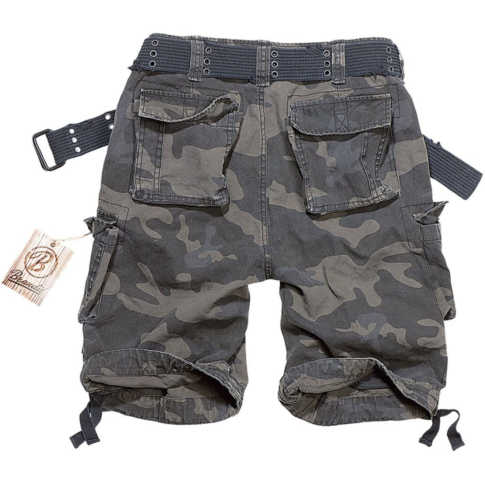 Cargoshorts i mörk kamouflage. Shortsen har breda ben som kan spännas åt nere vid byxslutet.