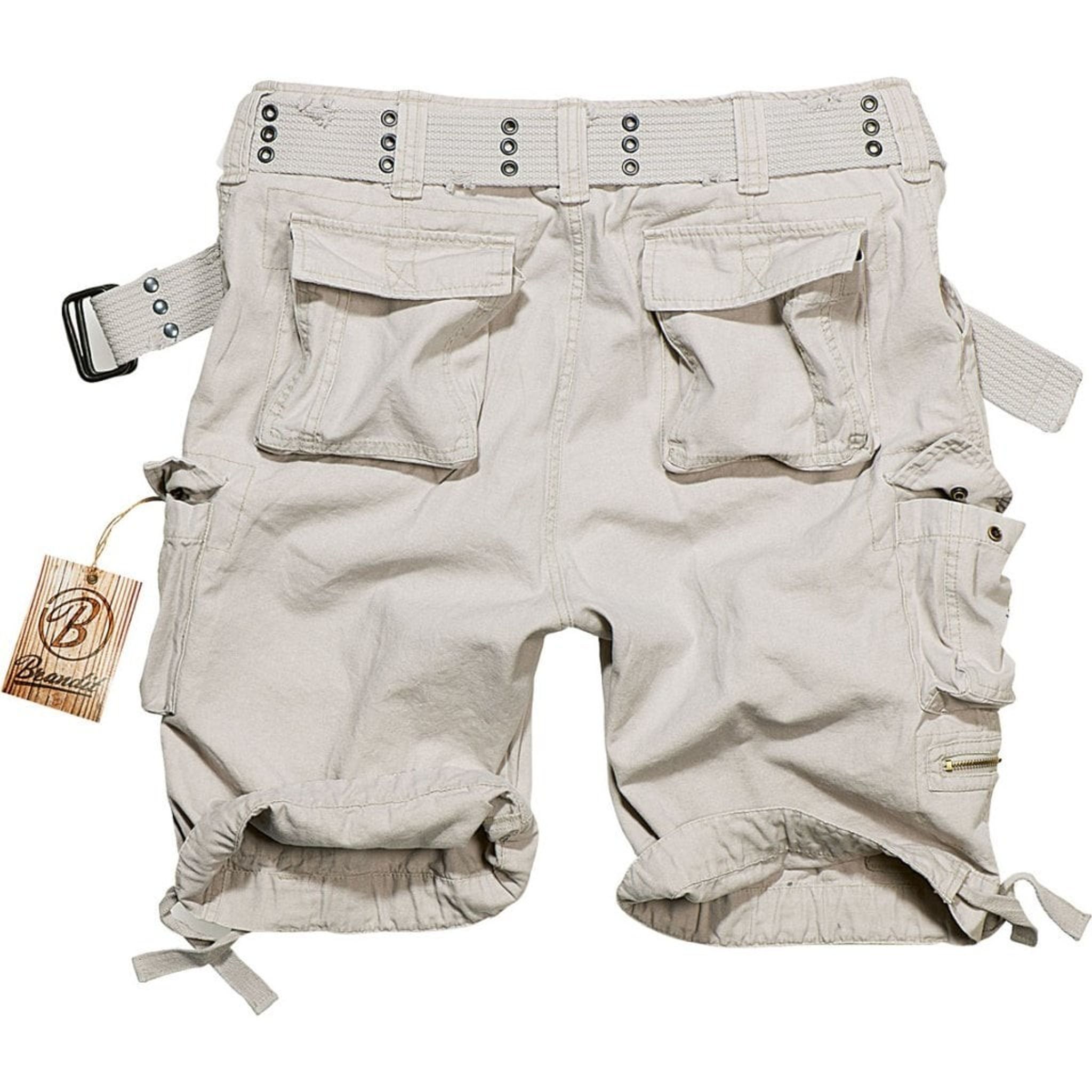 Dessa vita cargoshorts är tillverkade av ett tvättat tyg som ger dem en vintage-inspirerad look. Byxorna har en gammalvit färg som bidrar till det rustika utseendet och benen har flera fickor i olika former för att ge extra förvaringsutrymme. Det medföljande bältet är utformat för att matcha shortsen och ger en extra detalj till outfitten.