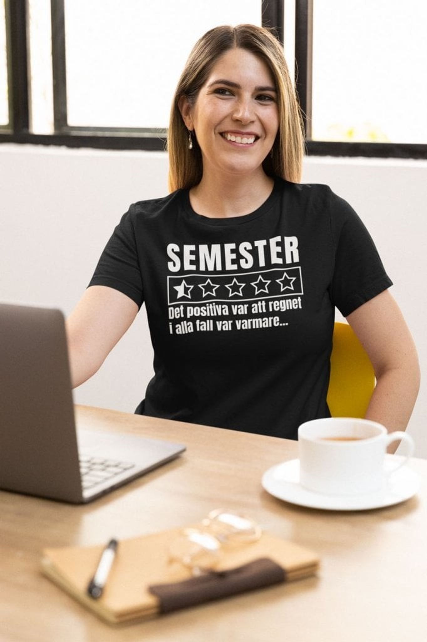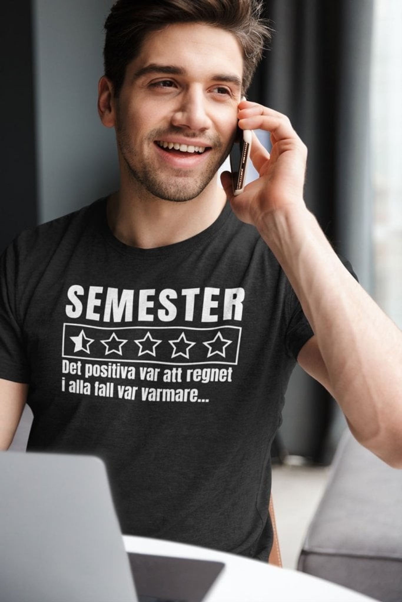 Denna T-shirt fångar semesterhumor på ett träffsäkert och roligt sätt! På framsidan står det "SEMESTER" följt av en rad med stjärnor, där endast en stjärna är ifylld. Under stjärnorna finns texten "Det positiva var att regnet i alla fall var varmare...". Denna recension påminner oss om de gånger när semesterplanerna inte går som förväntat, men man ändå försöker se det positiva i situationen.