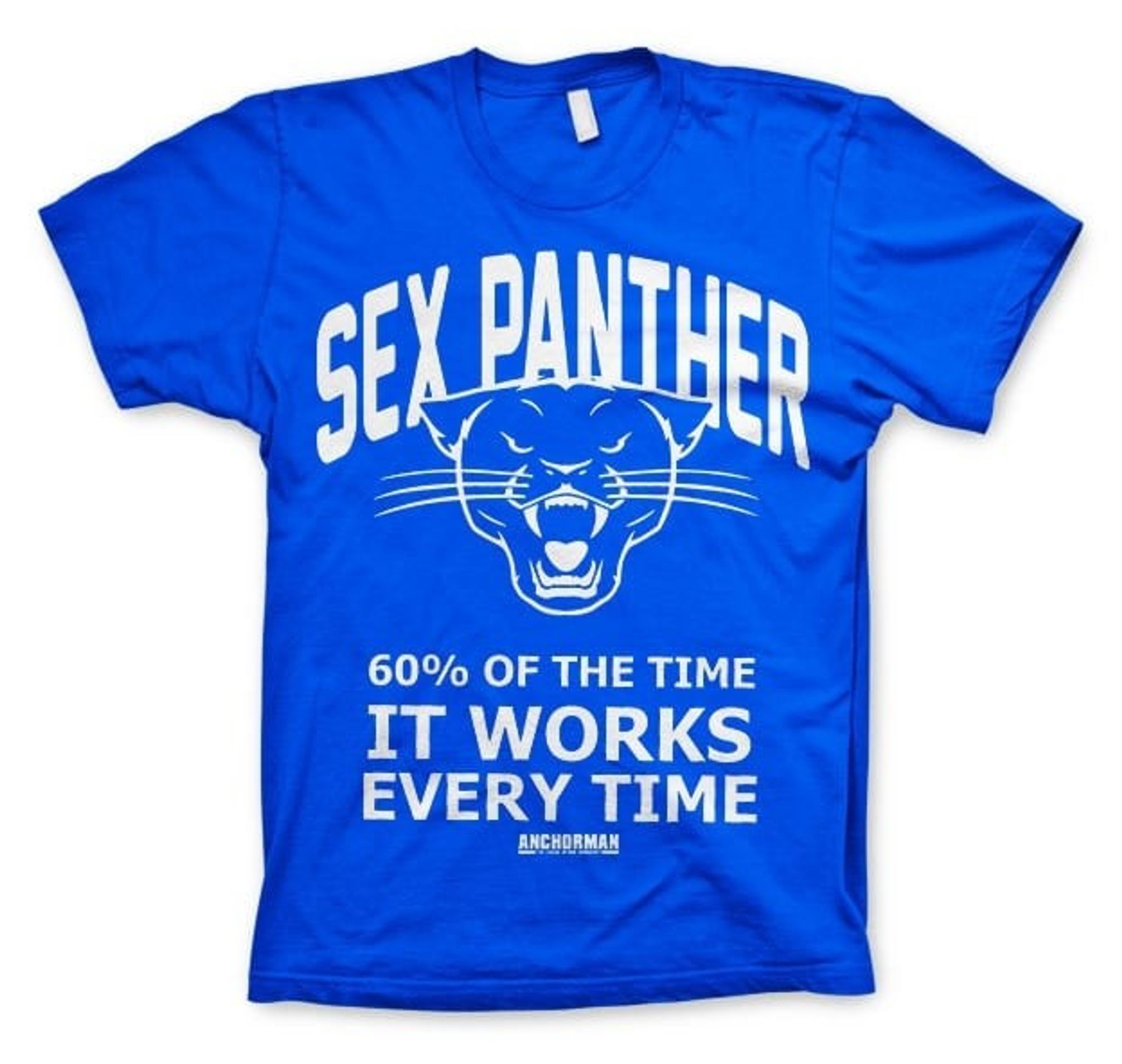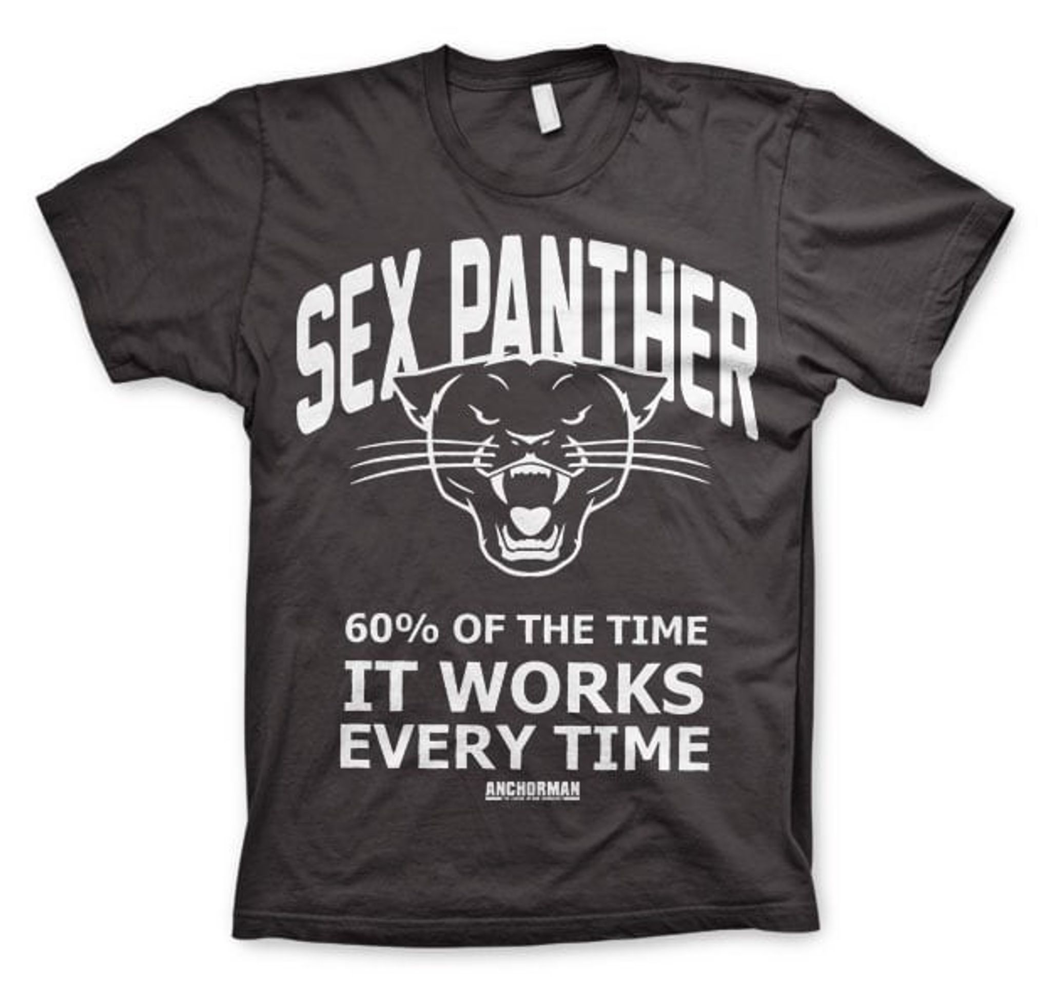 Sex Panther T-Shirten hyllar på ett ironiskt sätt en av filmhistoriens mest humoristiska påståenden. Med den dominerande texten "SEX PANTHER" får den omedelbart uppmärksamhet och leder tankarna till den fiktiva och tveksamt effektiva parfymen med samma namn. Nedanför pryder en matematiskt omöjlig men oemotståndligt rolig procentandel: "60% OF THE TIME IT WORKS EVERY TIME," en självmotsägande fras som blivit lika legendarisk som filmen den kommer ifrån. Ett vilt morrande panterhuvud, komplett med blixtrande ögon och skarpa tänder, ger motivet en aura av fara och absurditet. Denna kombination av text och bild sammanfattar den komiska andan av "Anchorman" där logik tar baksätet och humor regerar suveränt.