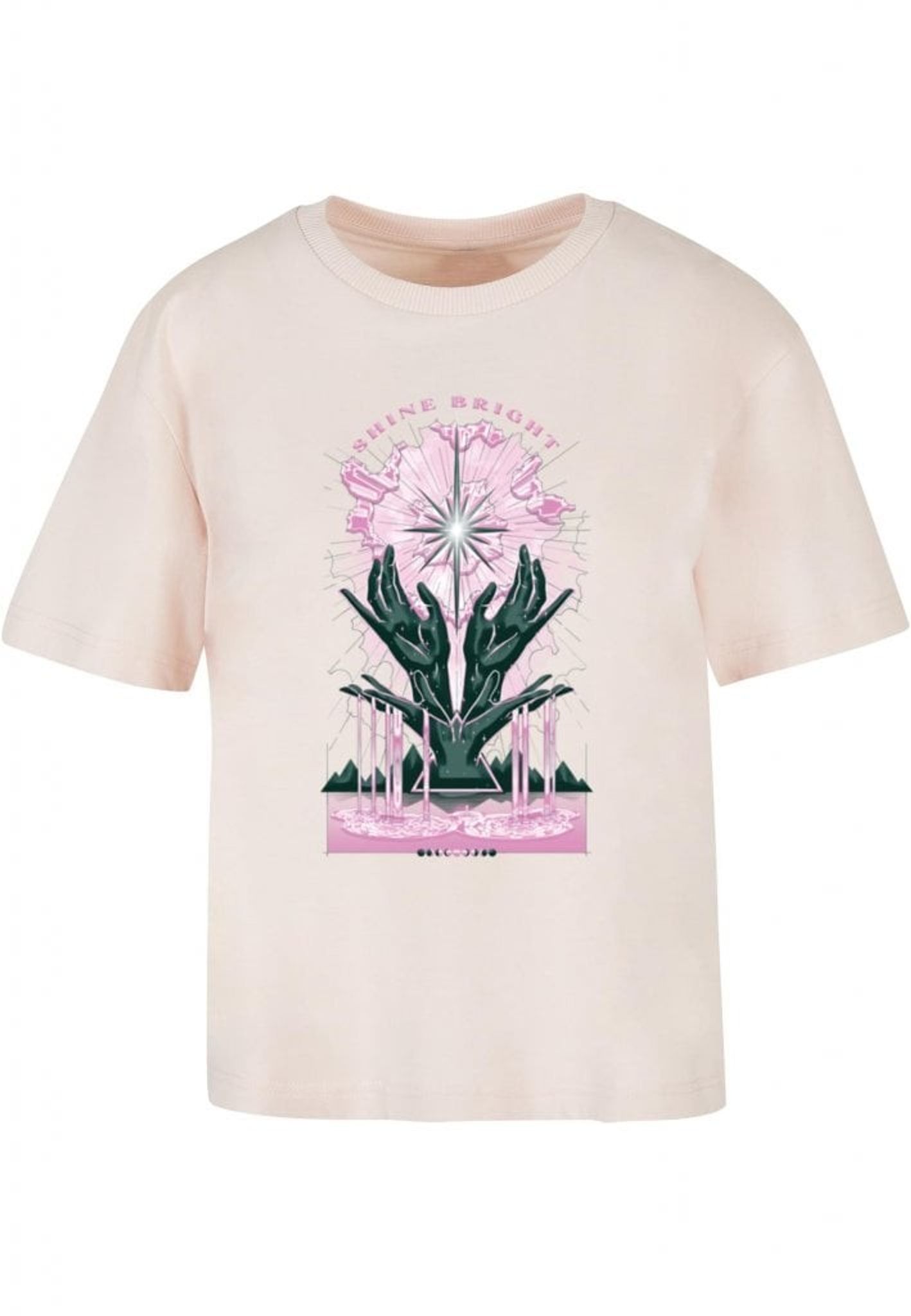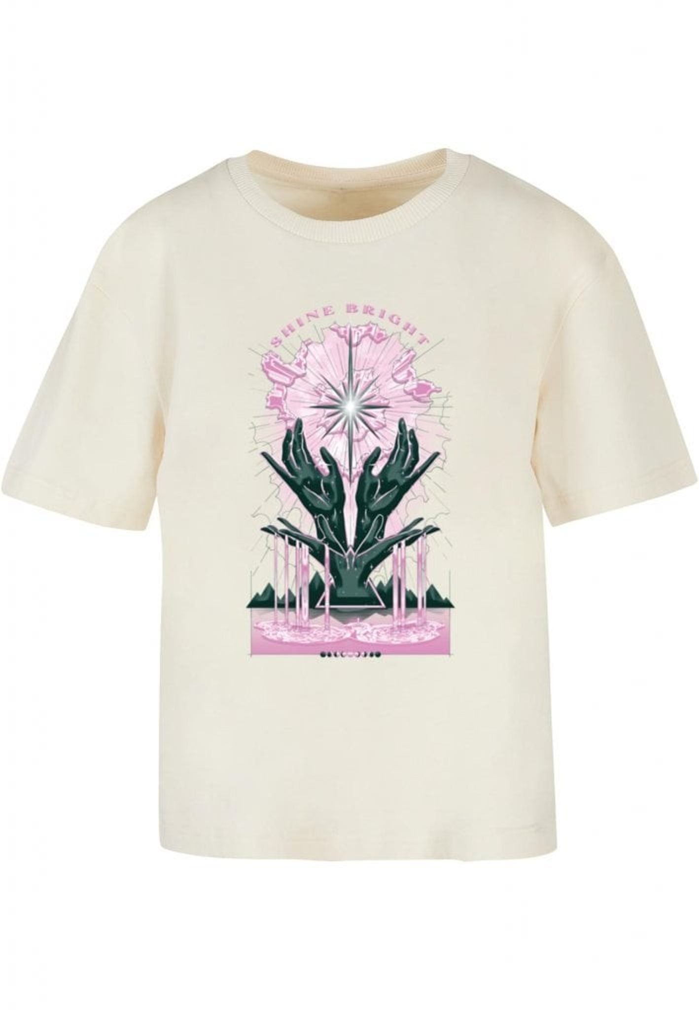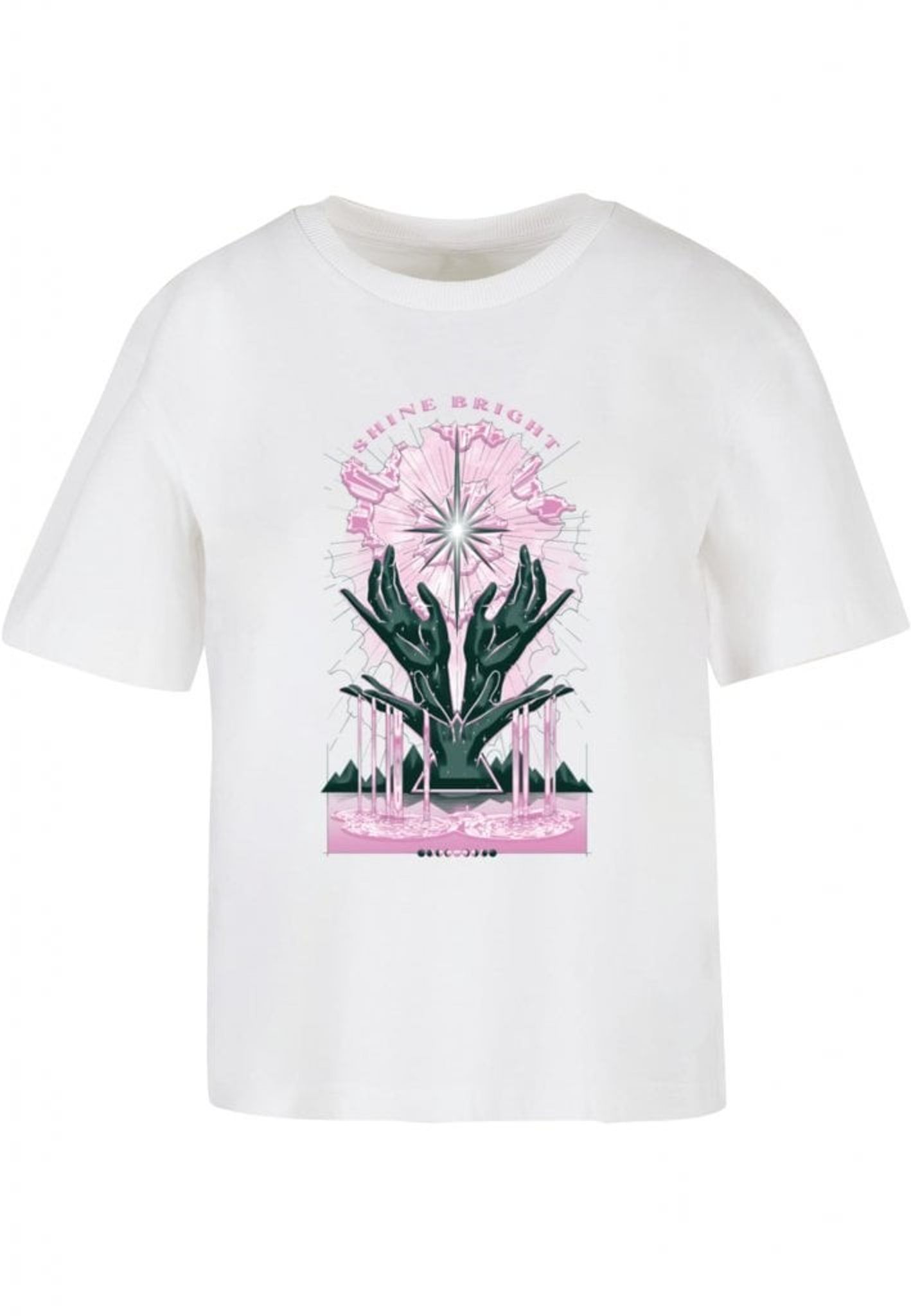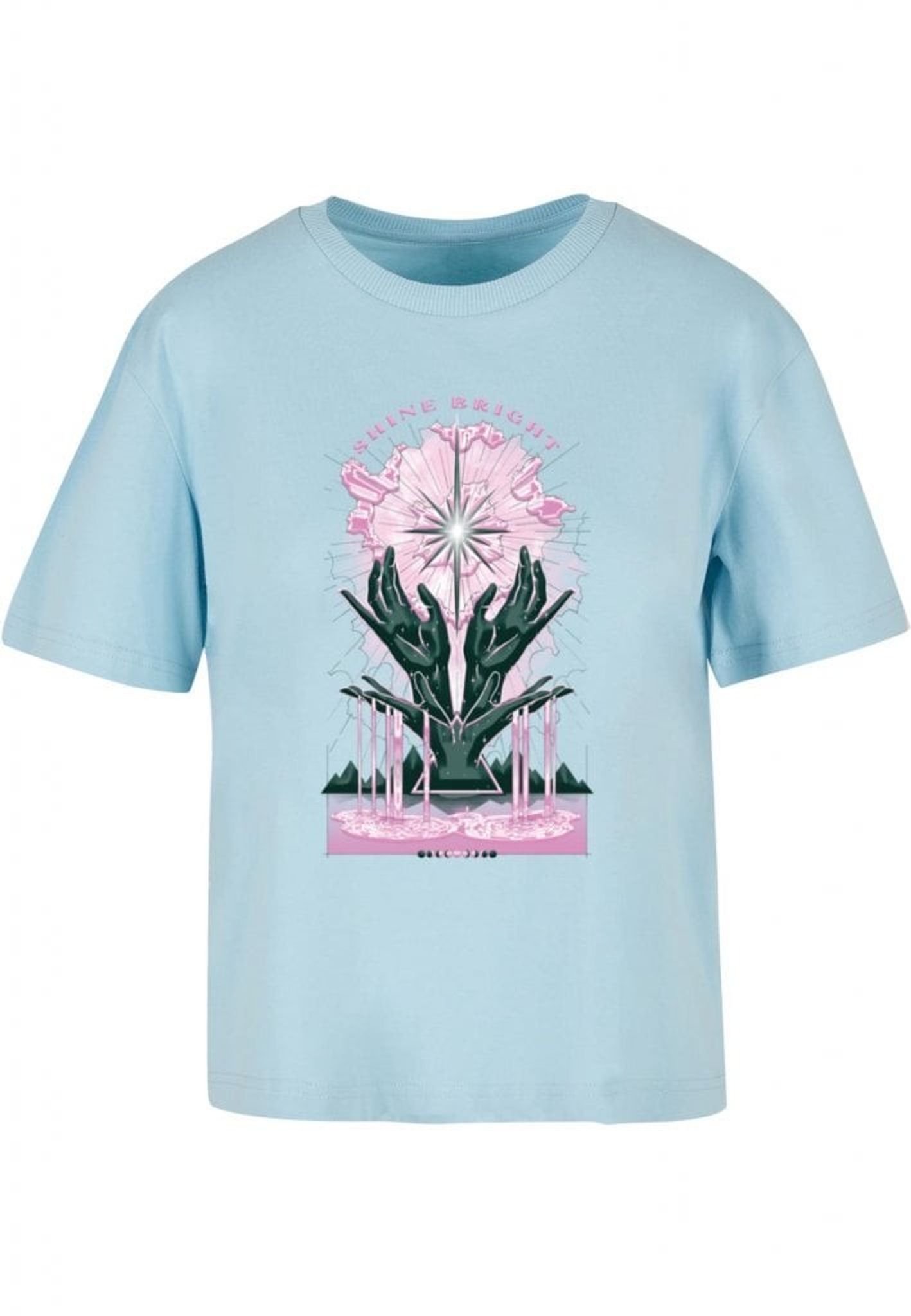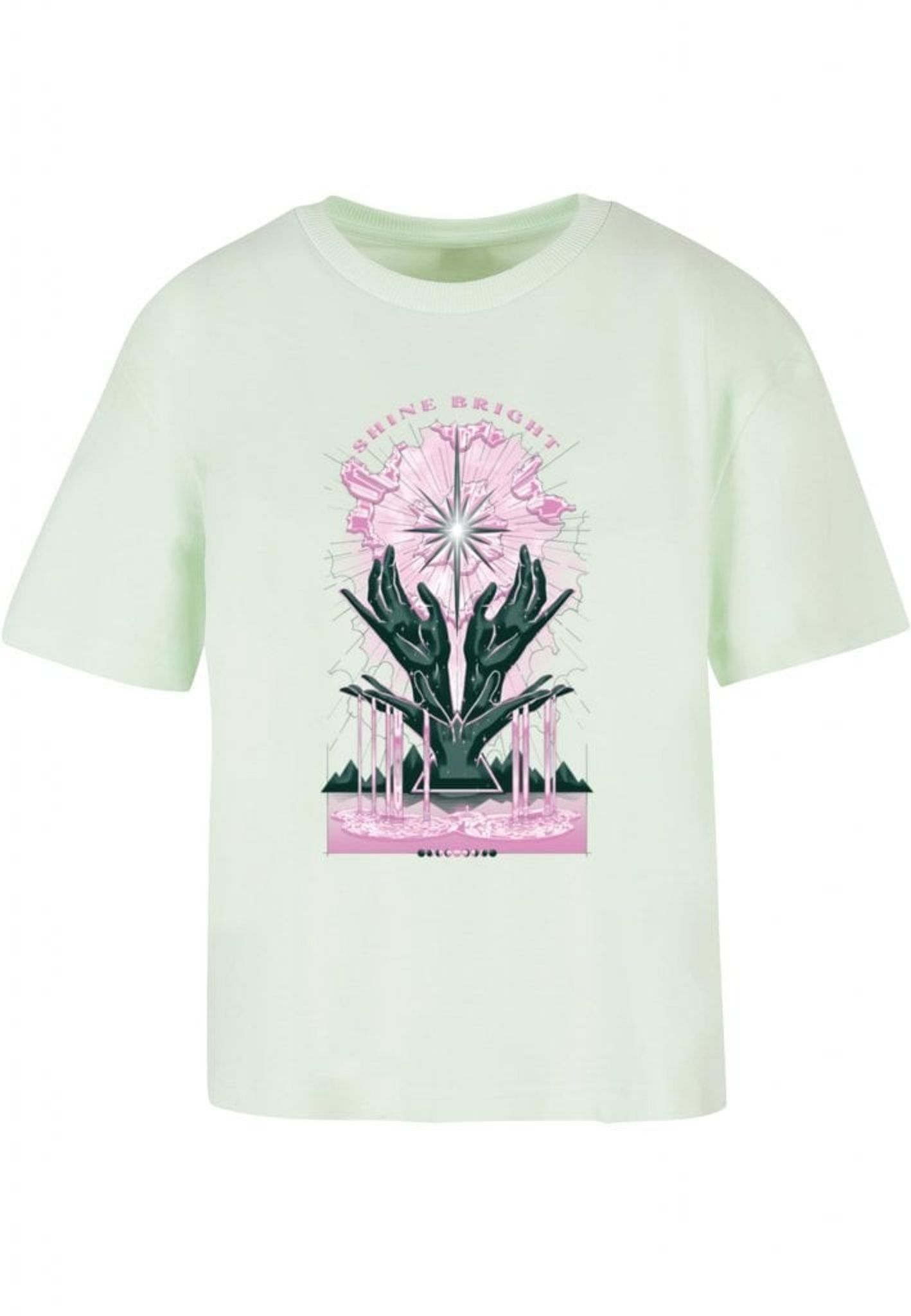 Plagget med motivet "SHINE BRIGHT" visar en stiliserad stjärna som strålar ljus, omgiven av rosa och svarta moln. Under stjärnan syns två gröna händer som verkar hålla upp stjärnan, som om de själva är stjärnans största fans. Det är som om stjärnan är en rockstjärna på scen och händerna är dess hängivna publik.