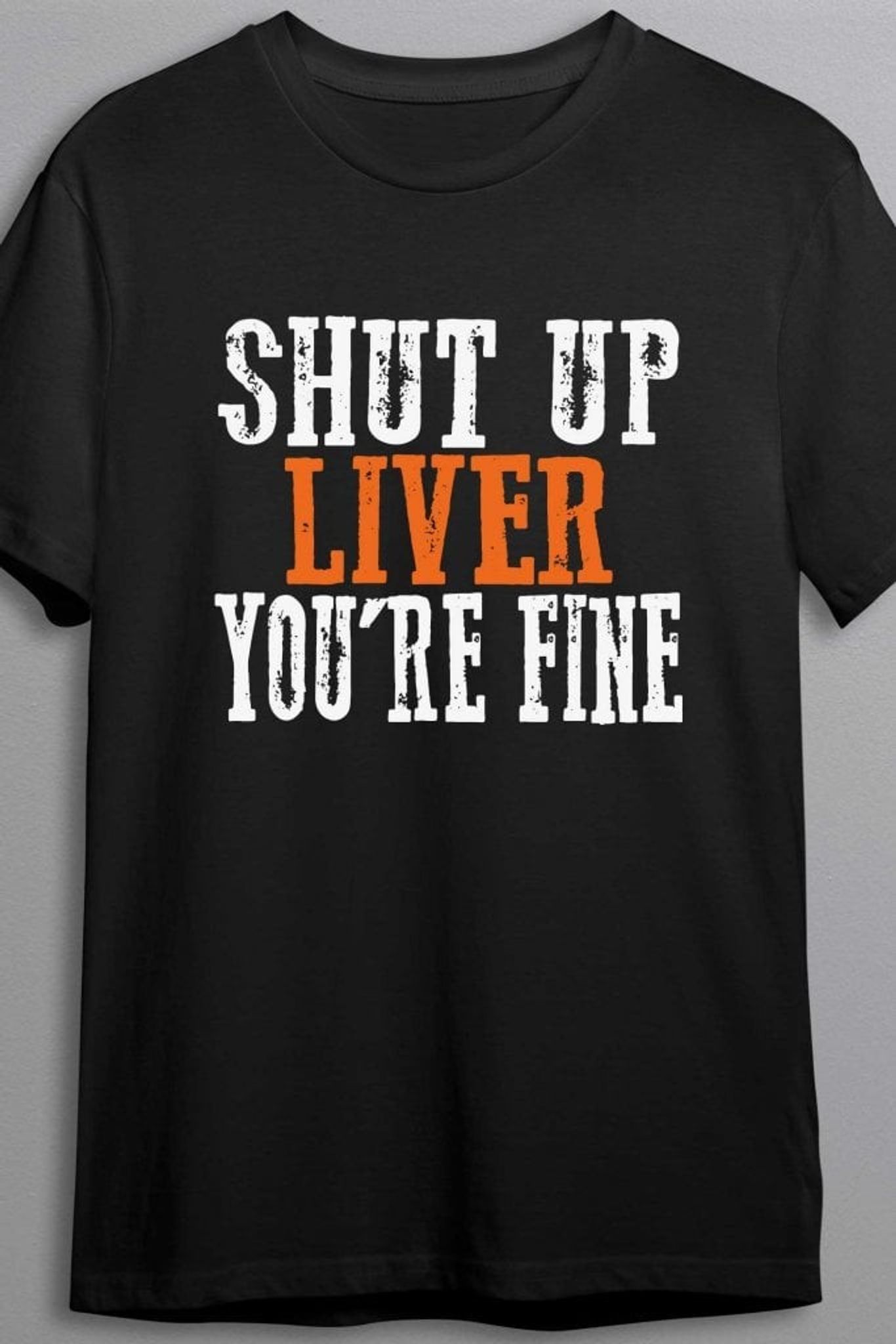 Men oroa dig inte, den klarar sig nog! Med budskapet "Shut up liver, you're fine" är den här T-shirten den perfekta uniformen för barhäng, festivaler och alla tillfällen där logik får stå tillbaka för ett gott skratt.