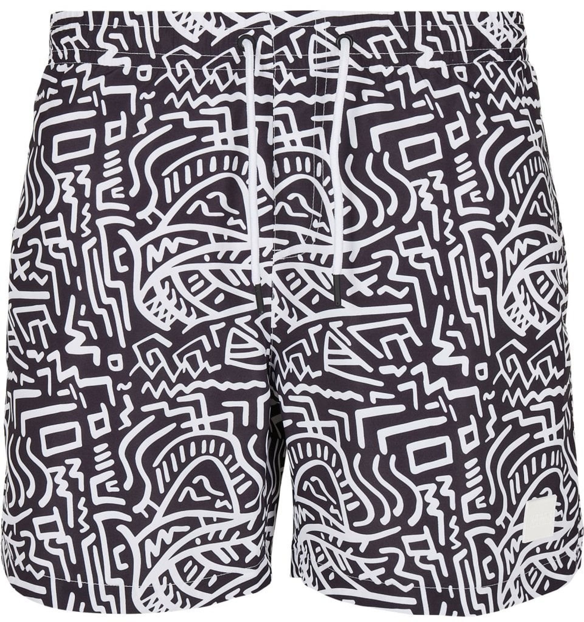 Ett par badshorts med ett helgalet mönster. Mängder av symboler har tryckts ihop och bildar nu ett dekorativt mönster i vitt mot den svarta bakgrunden.