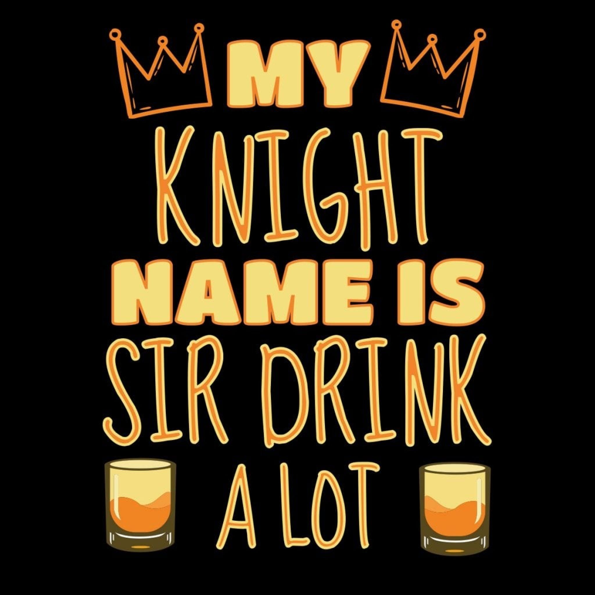 Denna svarta T-shirt med den humoristiska texten "My knight name is Sir Drink A Lot" är den perfekta gåvan till den "riddare" som föredrar att höja sitt glas snarare än sitt svärd. Den är utformad med en modern vinkling på det klassiska medeltida temat, komplett med en prålig krona och två brusande bägare.