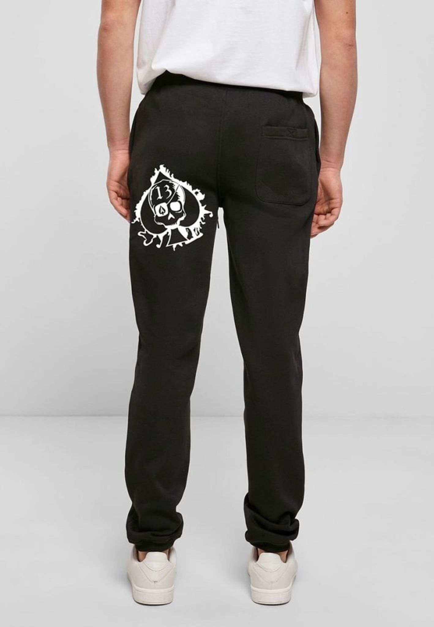 Ett par sköna joggingbyxor med bred mudd i midjan och mudd i bensluten. På vänster baksida så finns konturerna av ett spader och ovanpå finns en skalle med siffran 13.