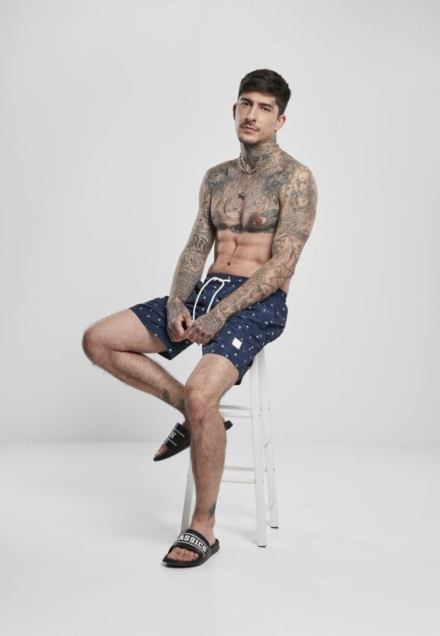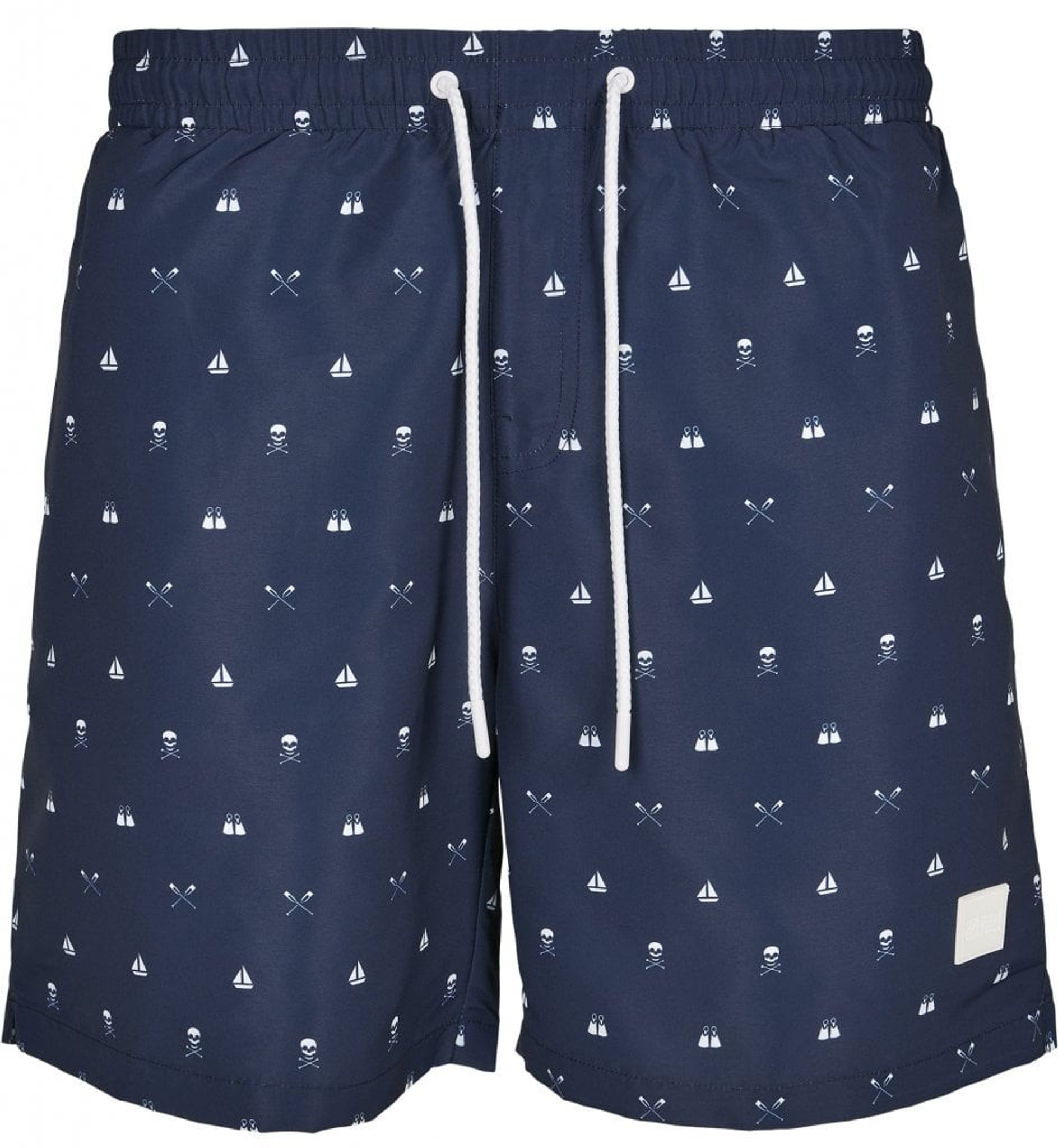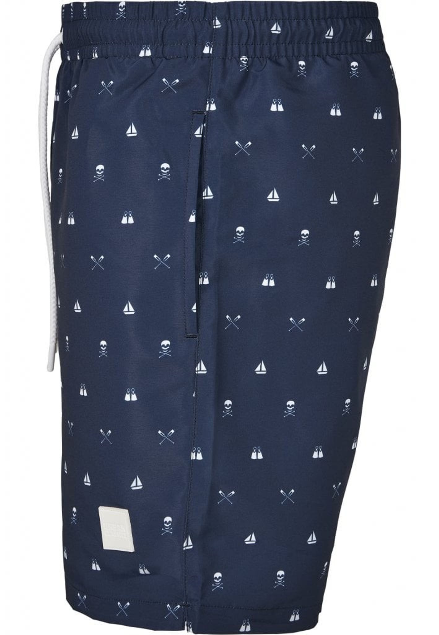 Stilrena badshorts där marinblått tyg fyllts utav små båtar, döskallar, åror och simfötter.