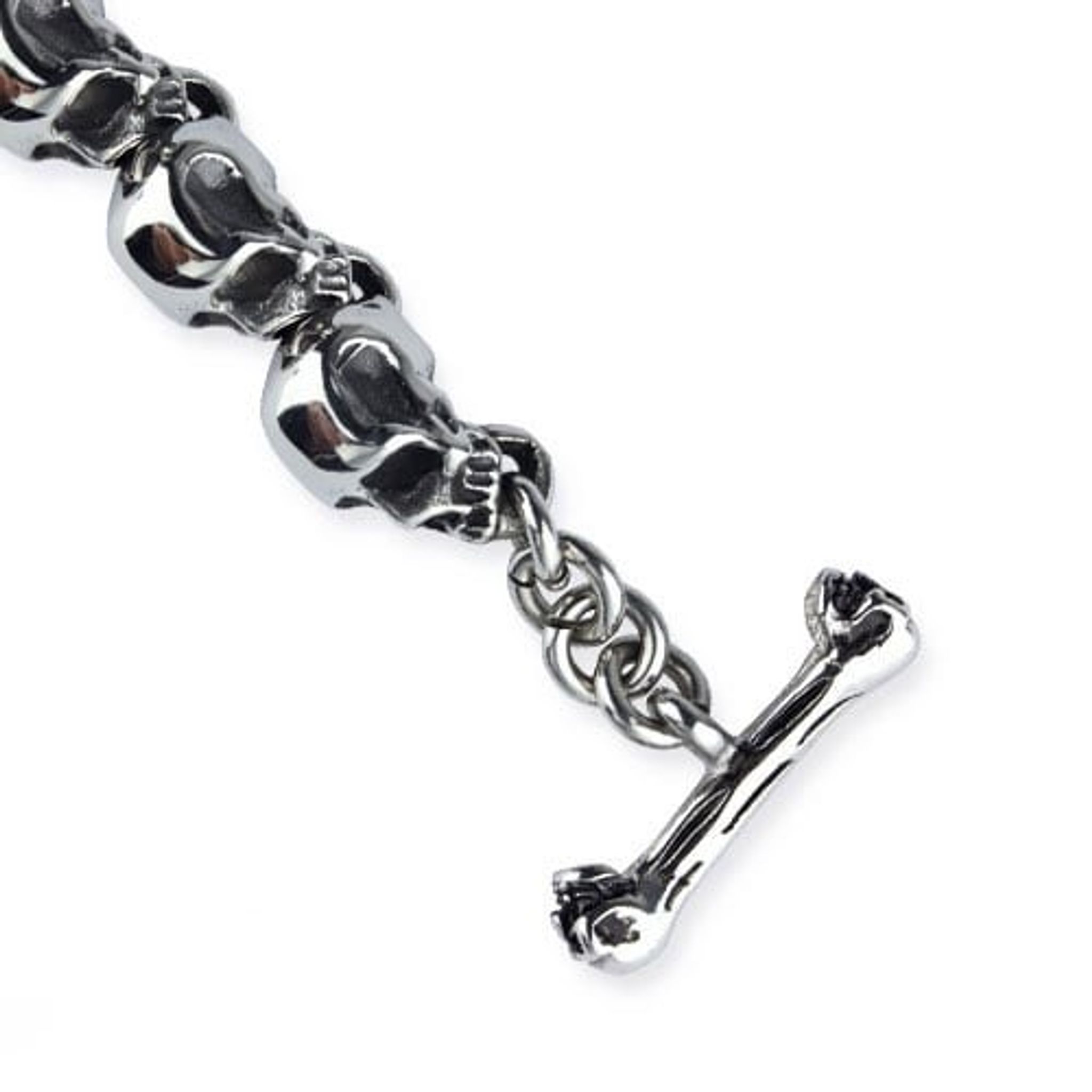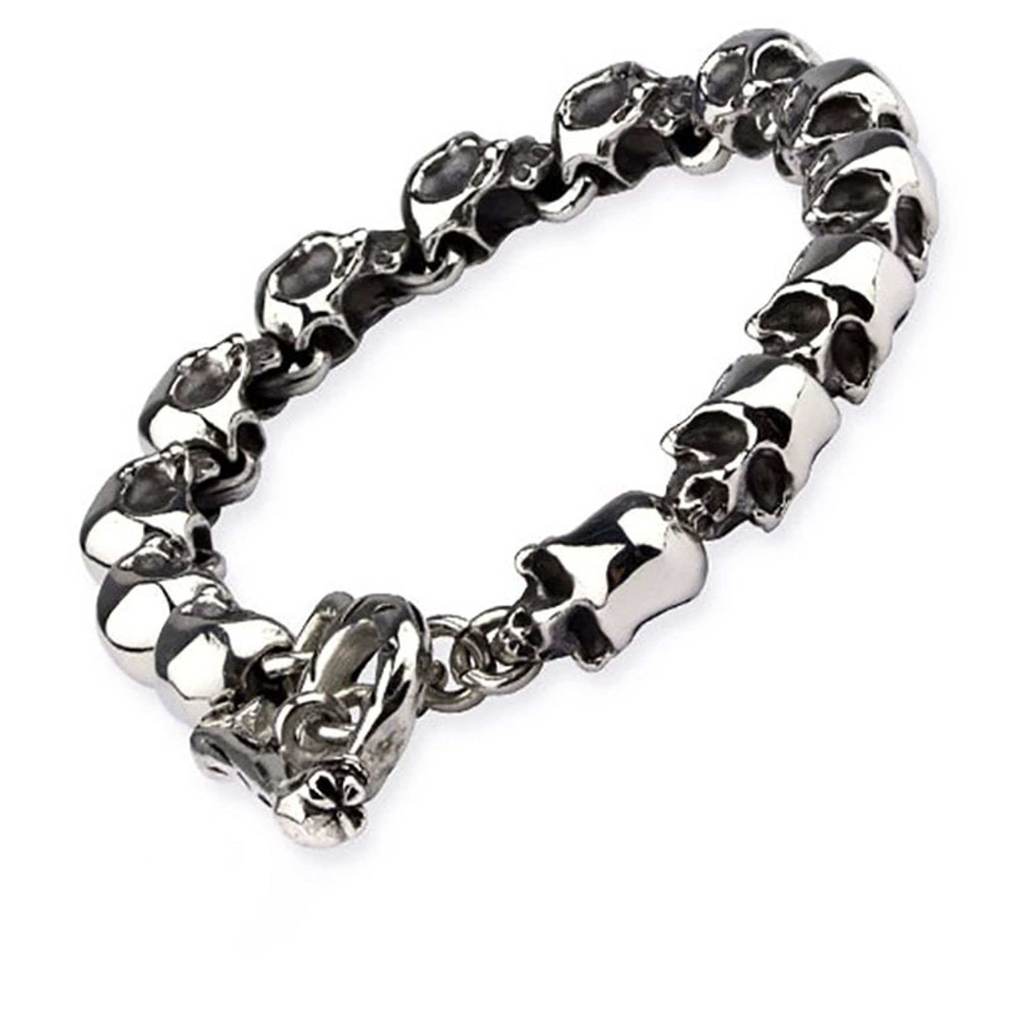 Ett armband fyllt av döskallar där varje skalle är vävd samman med precision för att skapa en sömlös och imponerande länk, vilket ger en känsla av samhörighet med det gåtfulla och det oförutsägbara. Oavsett om du bär det som ett uttryck av din egen individualitet eller som en symbol för styrka och mod, kommer detta armband säkerligen att vara en konversationsstartare och en riktigt stilsättare.