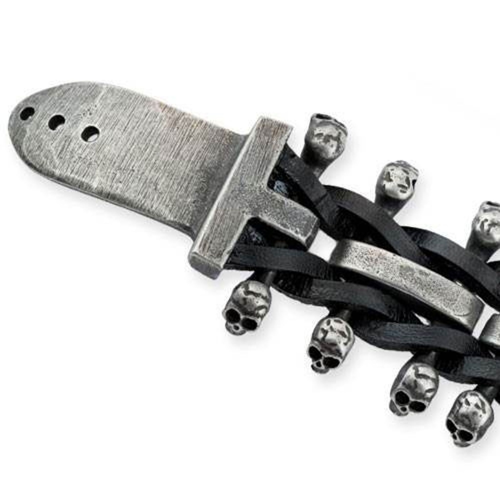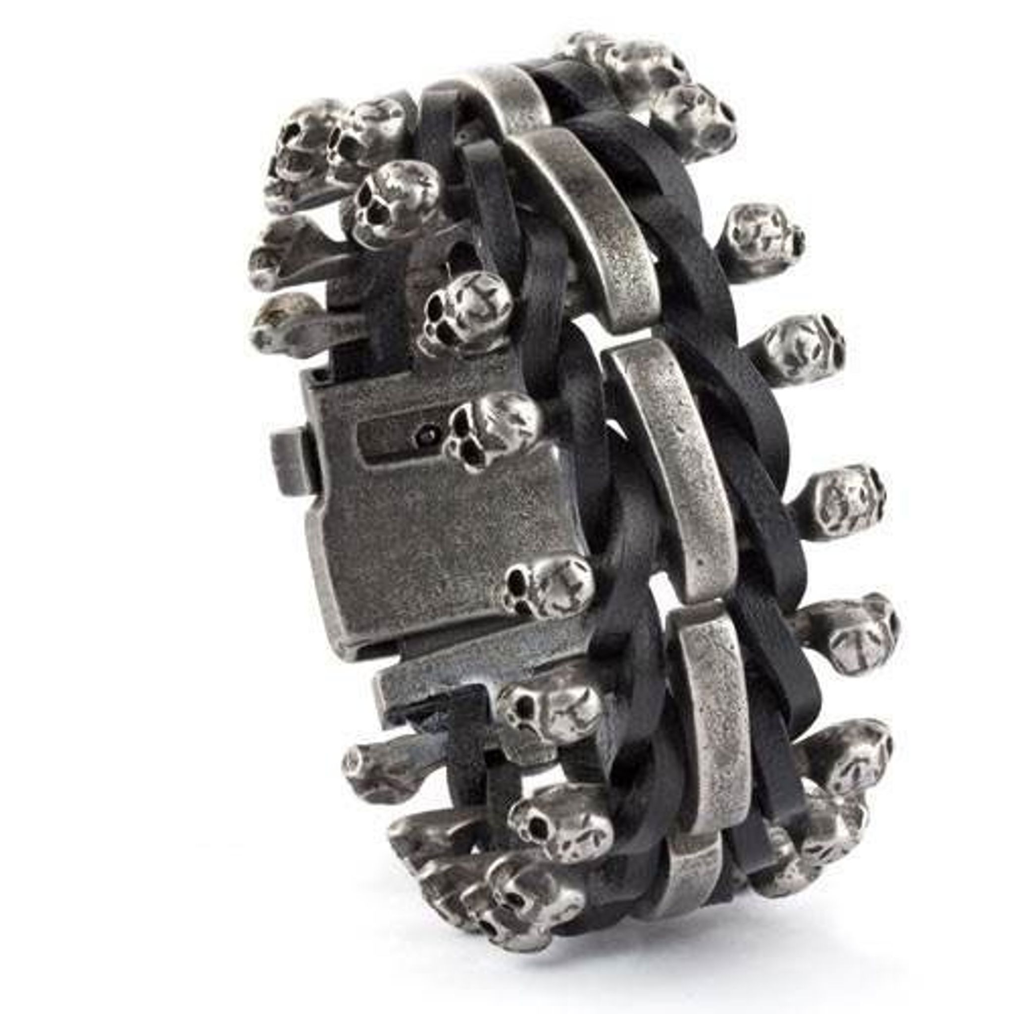 Ett riktigt läckert armband i rostfri stål med döskallar som sitter sammanflätade med svarta läderband.