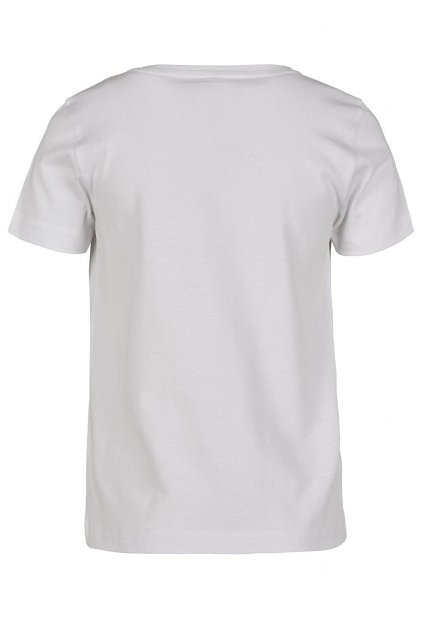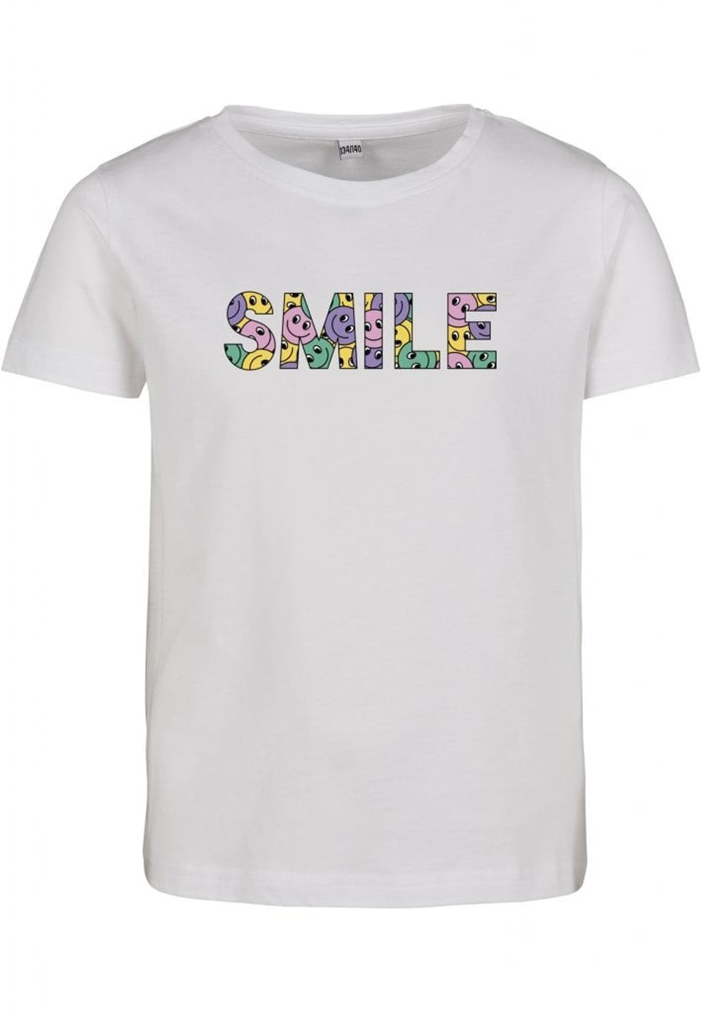 En vit t-shirt med många glada gubbar som bildar SMILE i stora bokstäver.