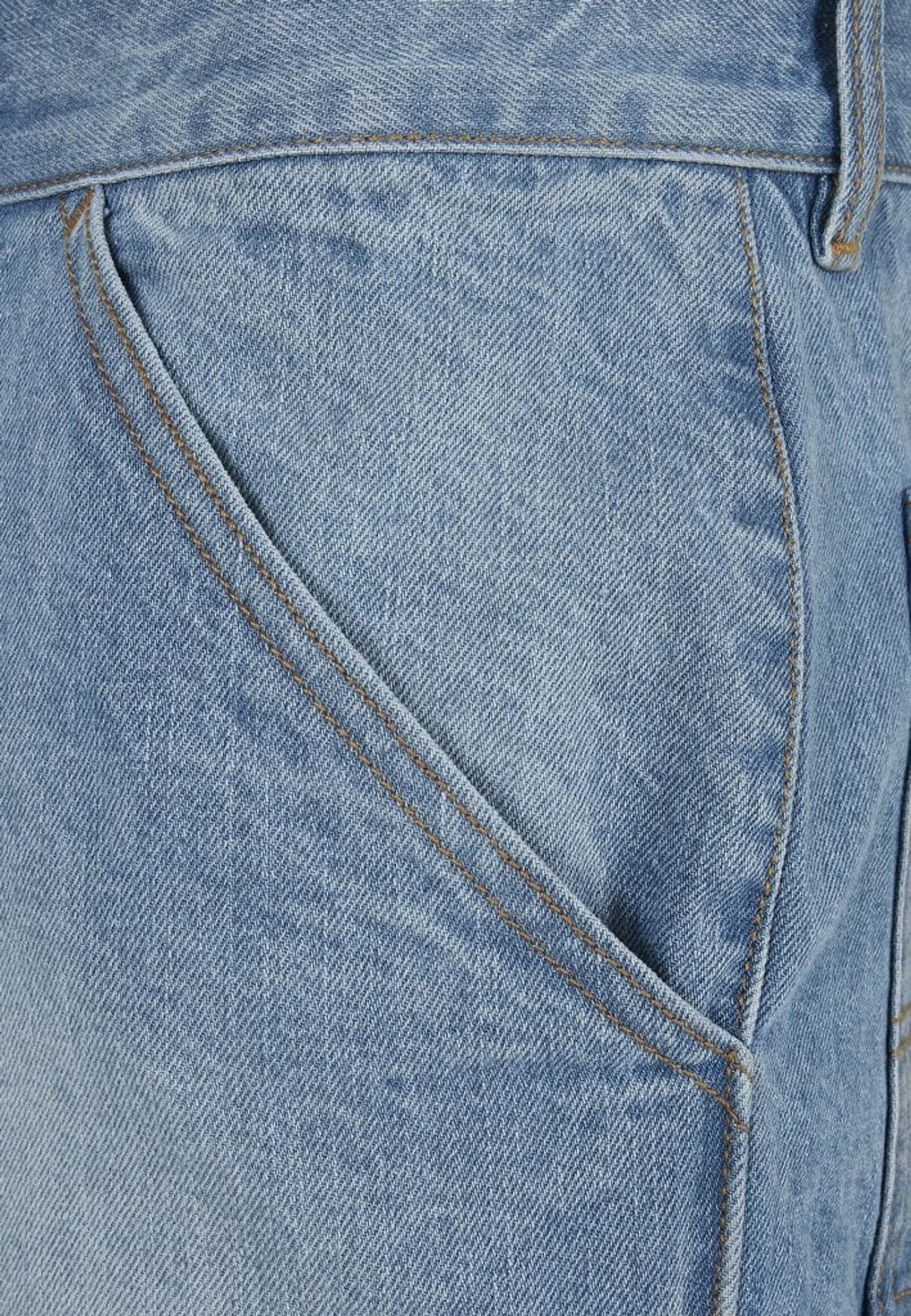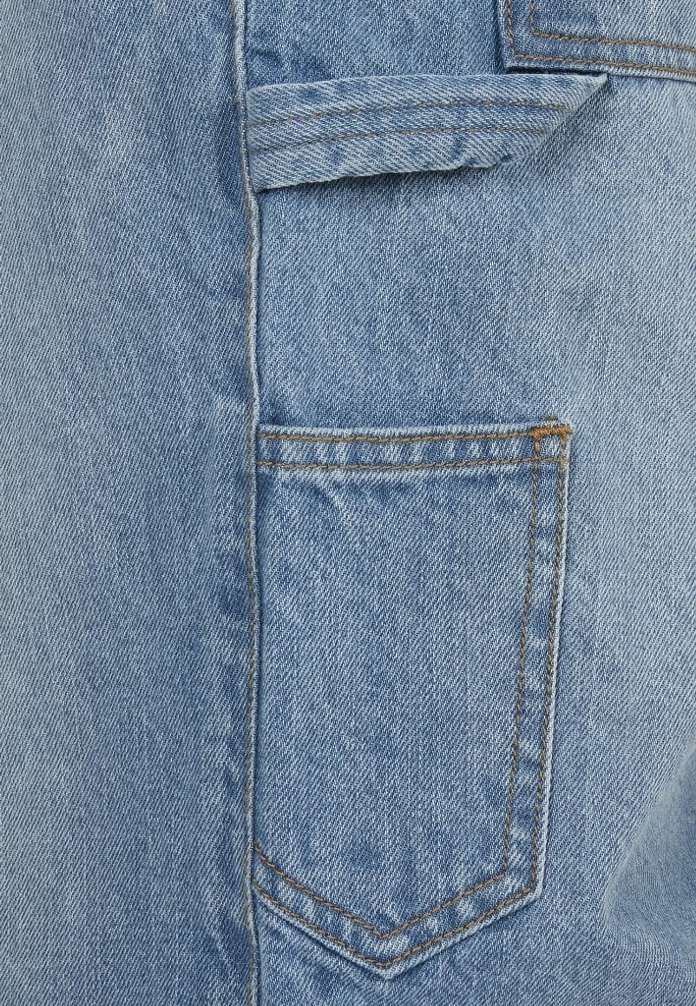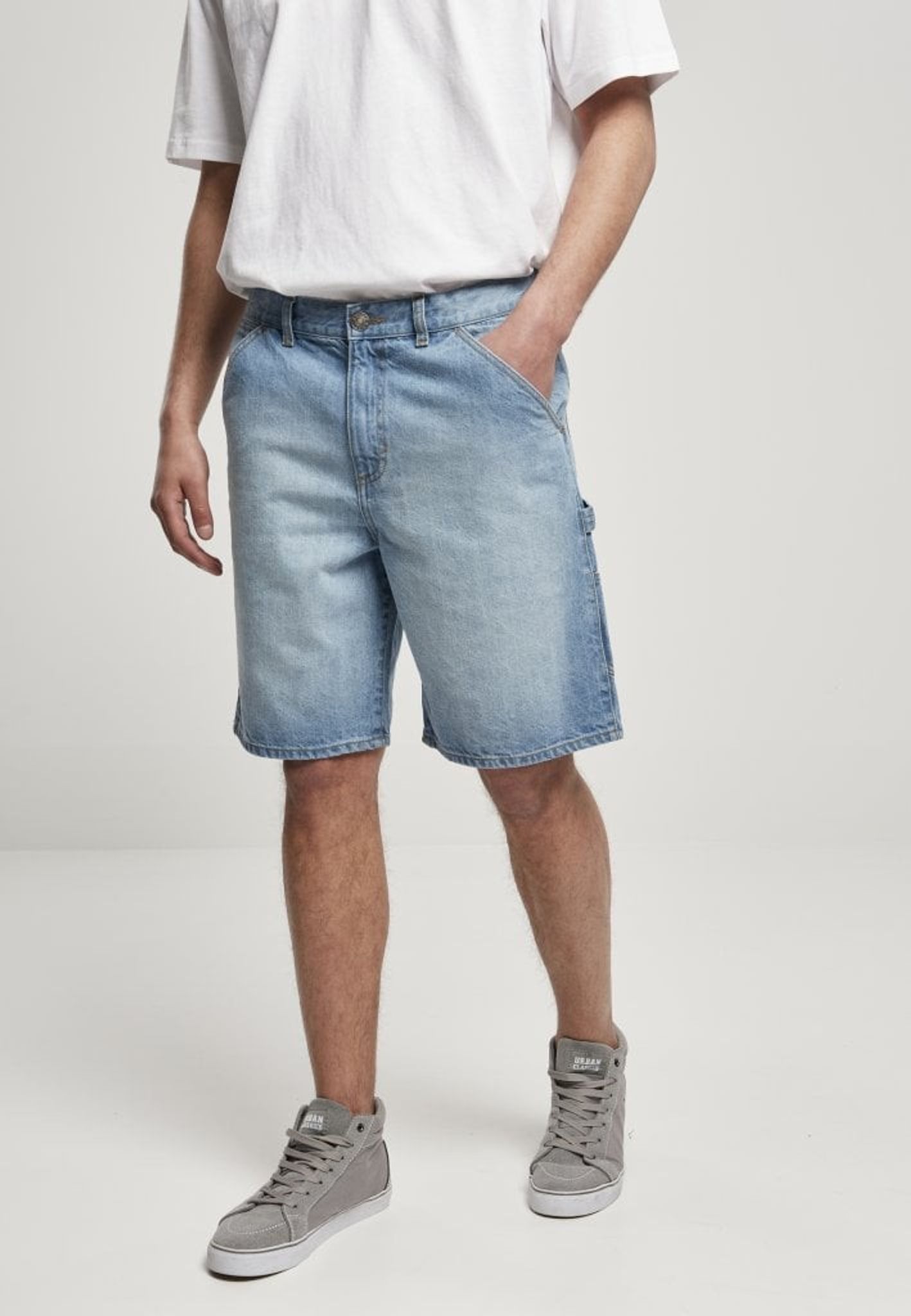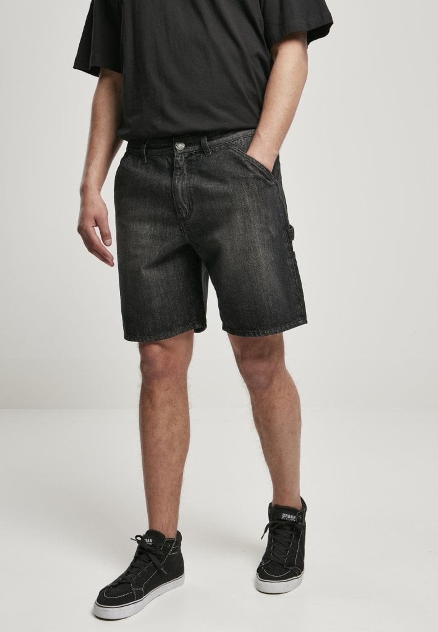Ett par knälånga jeansshorts med loose fit. Shortsen har flertal fickor och ögla för hammare.