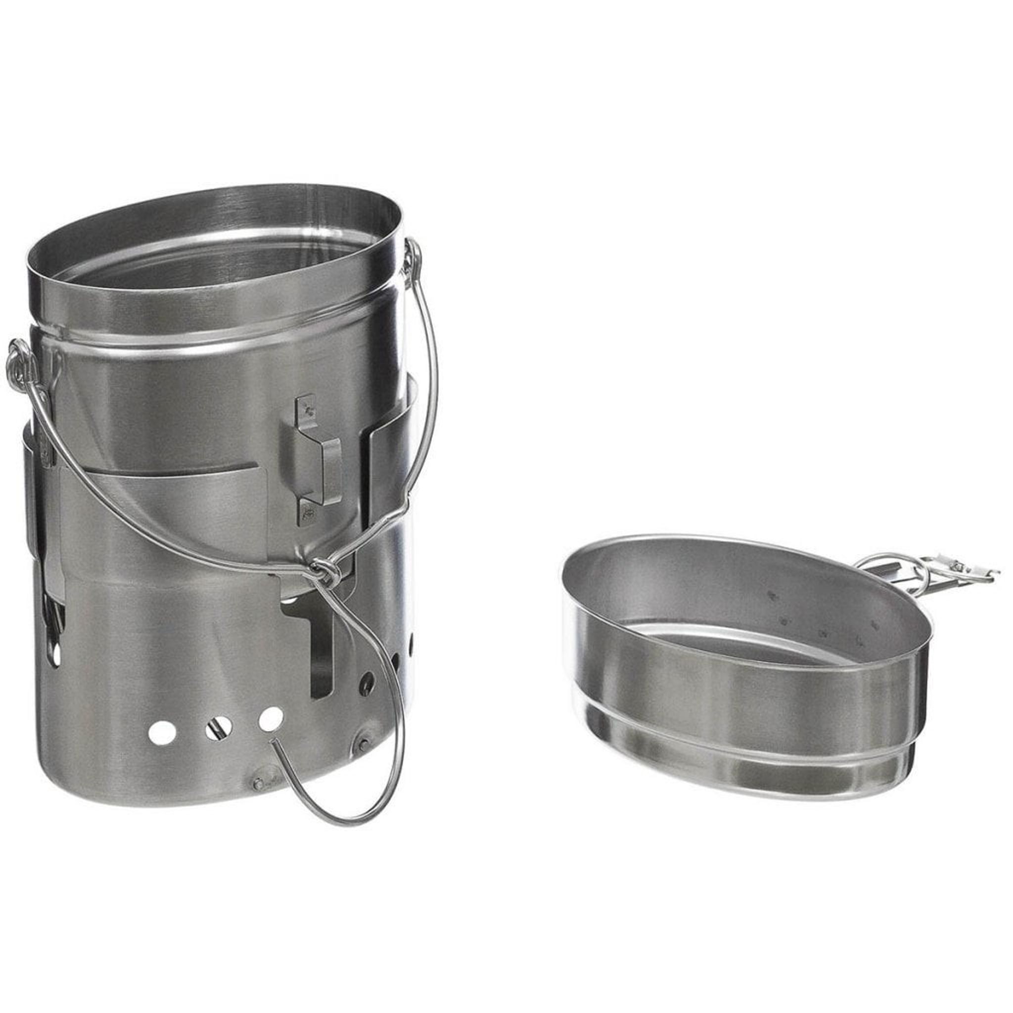 Konstruerad för robusthet och funktion, erbjuder detta fältkök en exceptionell hållbarhet och är tillräckligt mångsidigt för att användas över öppen eld, vilket gör det till en ovärderlig del av utomhusköket. Kokkärlet, komplett med kastrull och lock, är designat för att vara en grundläggande komponent i din matlagningsutrustning, medan vindskyddet och ställningen tillhandahåller skydd och stabilitet under tuffa förhållanden.
