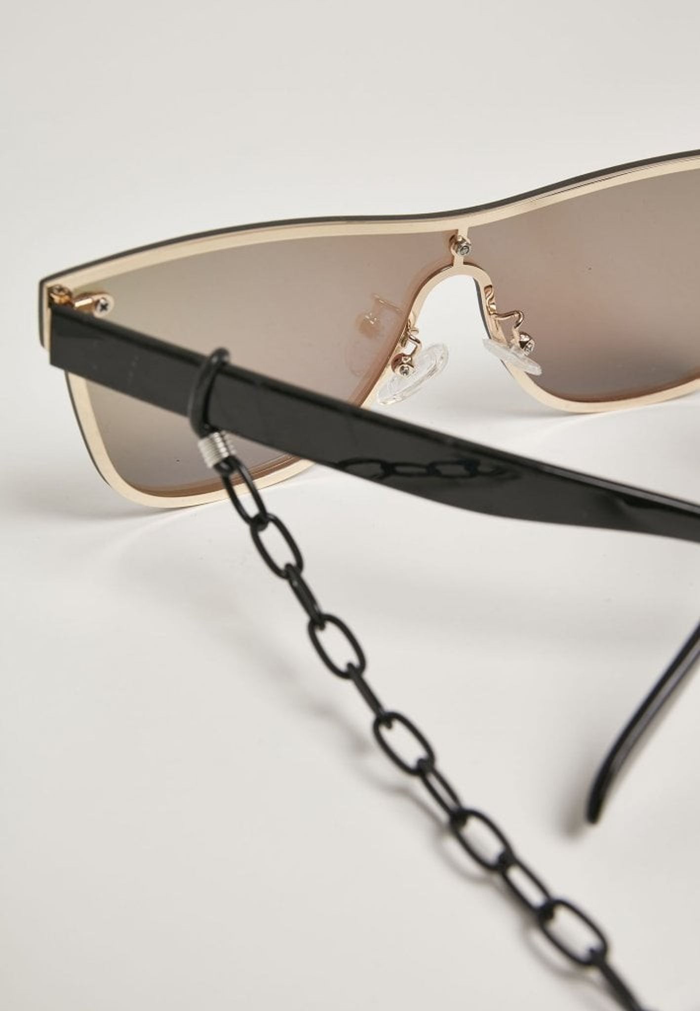 Solglasögon med spegelglas som sträcker sig över hela framsidan, utan någon ram runt.