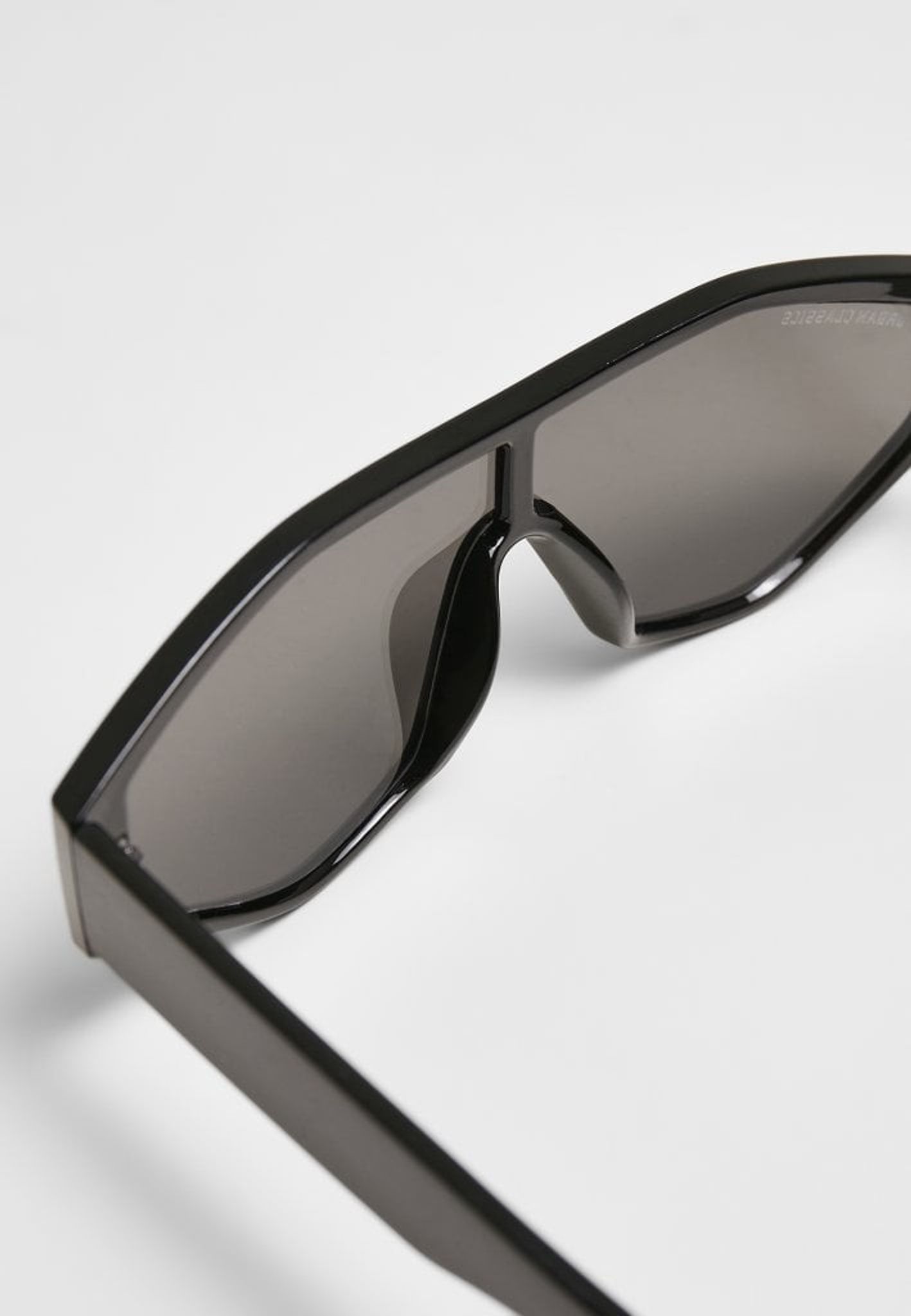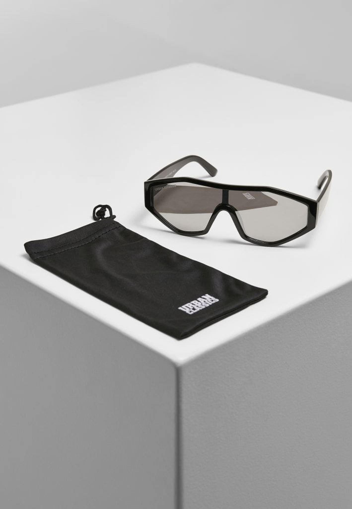 Glasögonen är lite kantiga och har en jämntjock svart kant runt glasen.