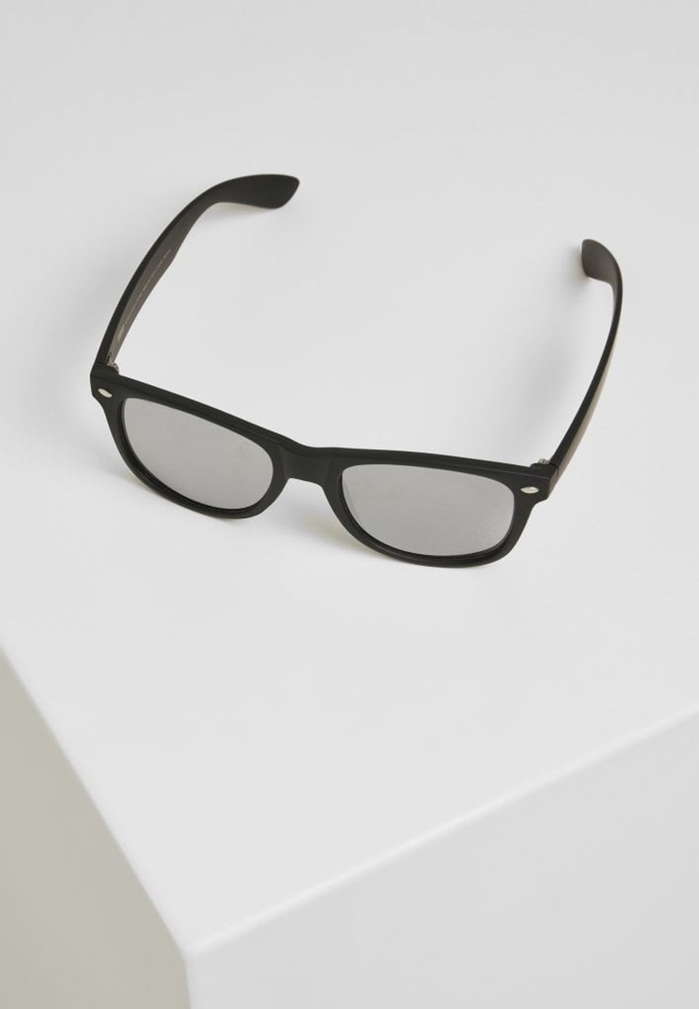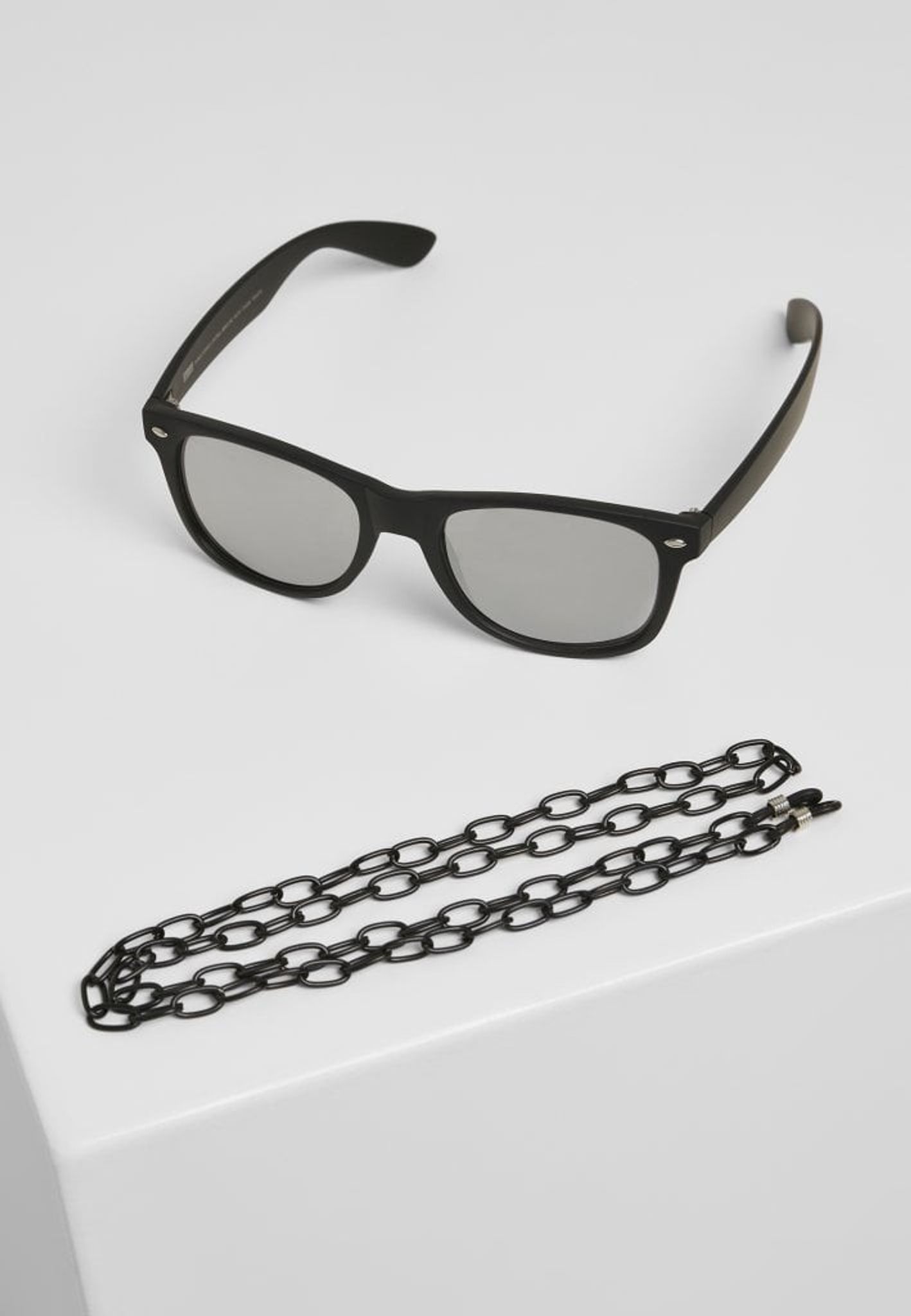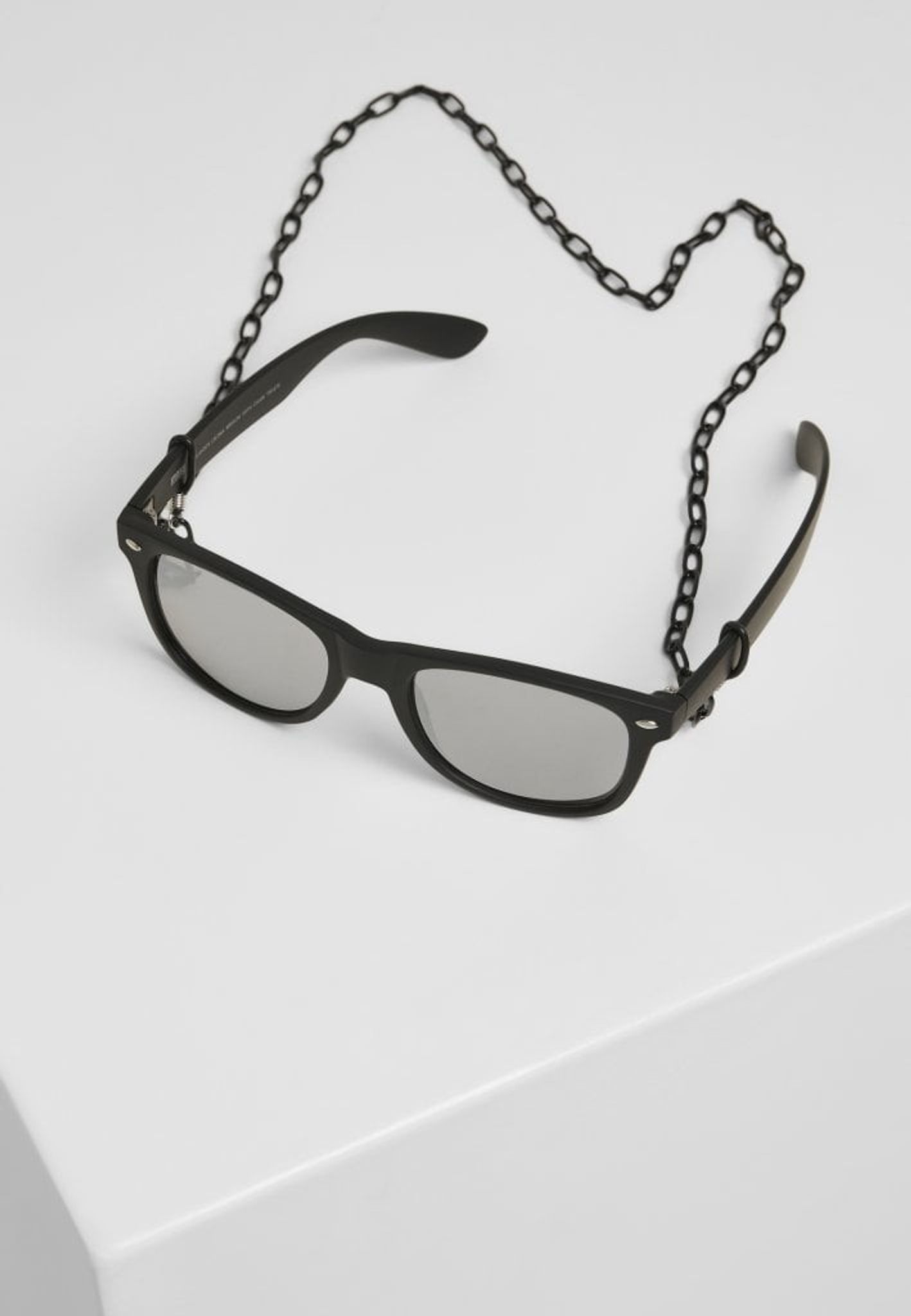 Svarta solglasögon med spegelglas och kedja att fästa runt bågarna.