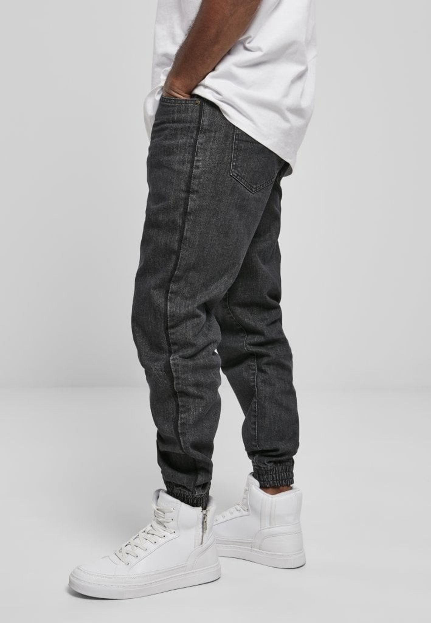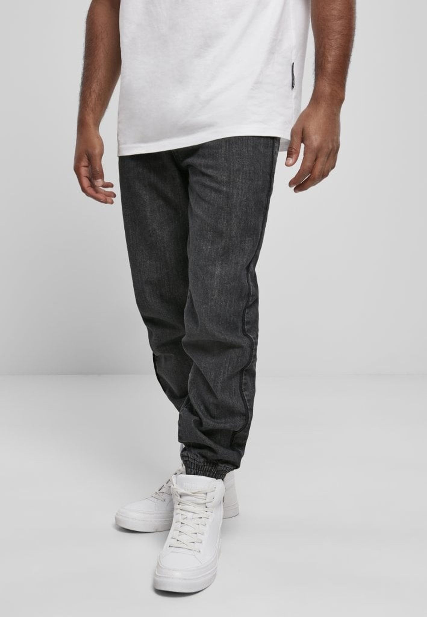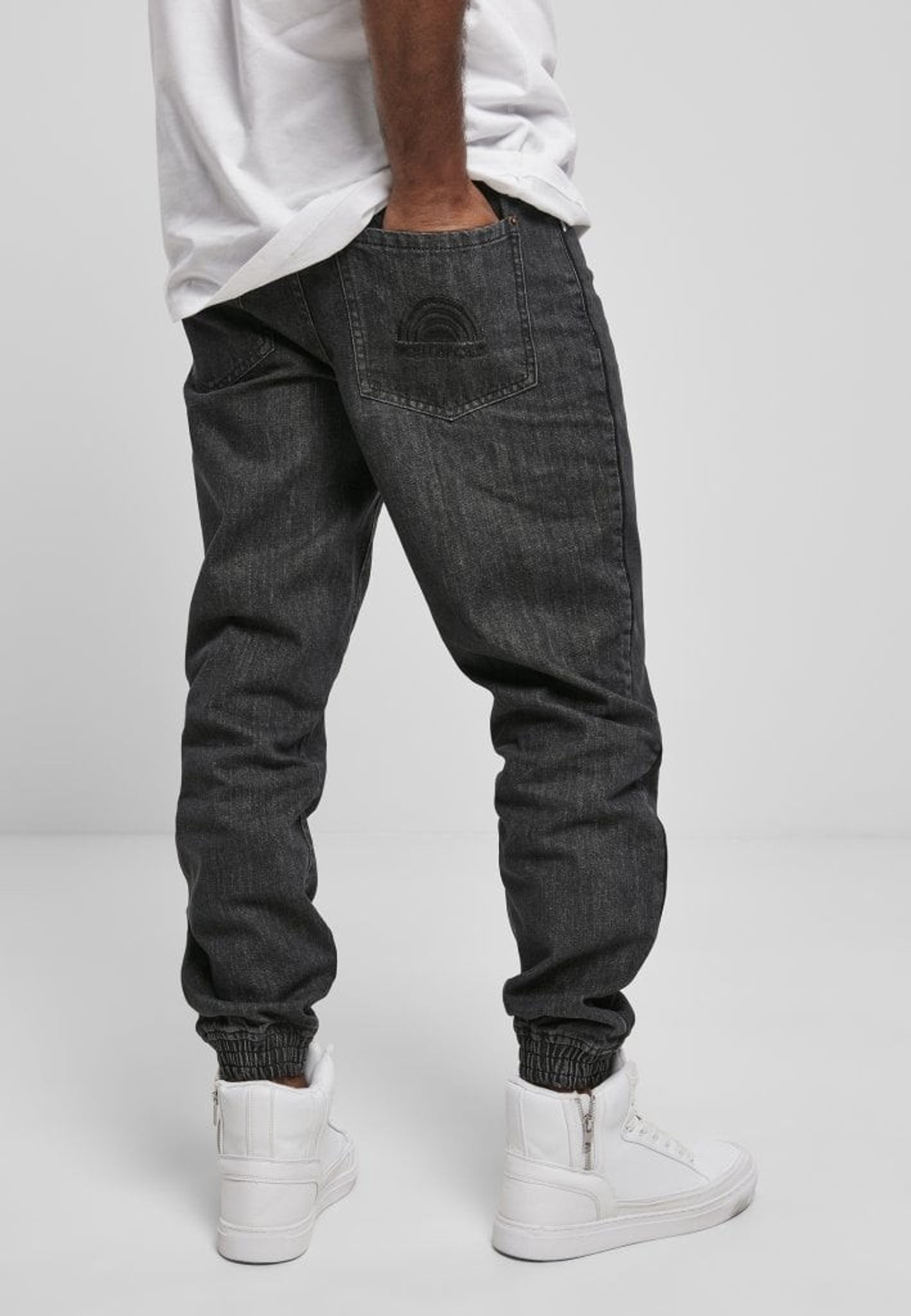 Ett par mörka tvättade jeans från Southpole. Jeansen har rejäla elastiska muddar nedtill på bensluten.