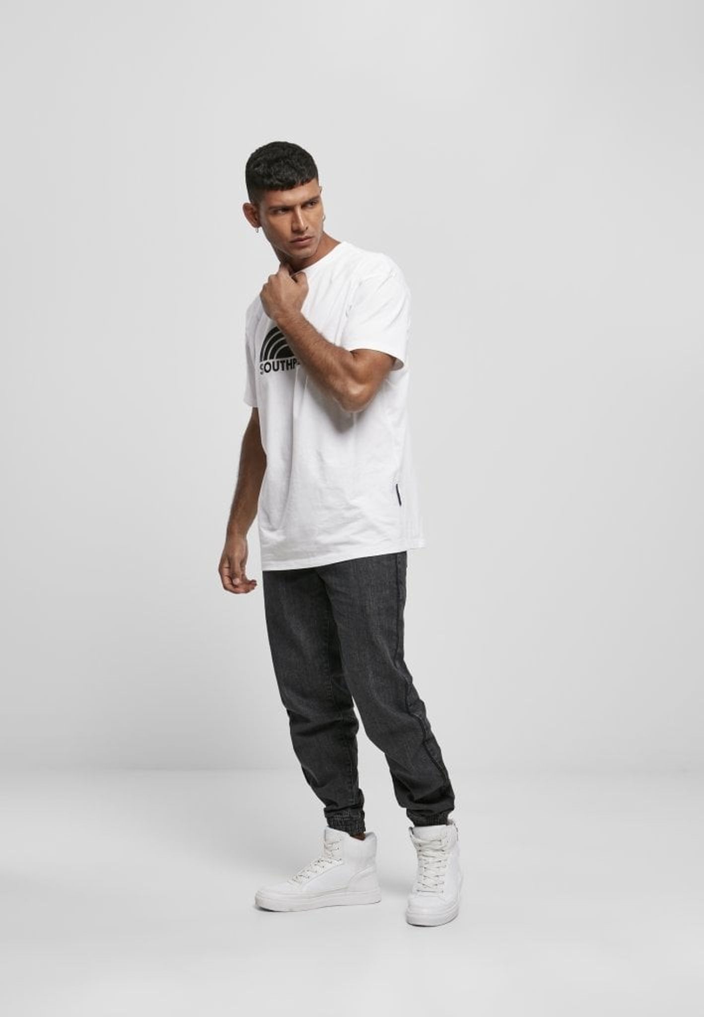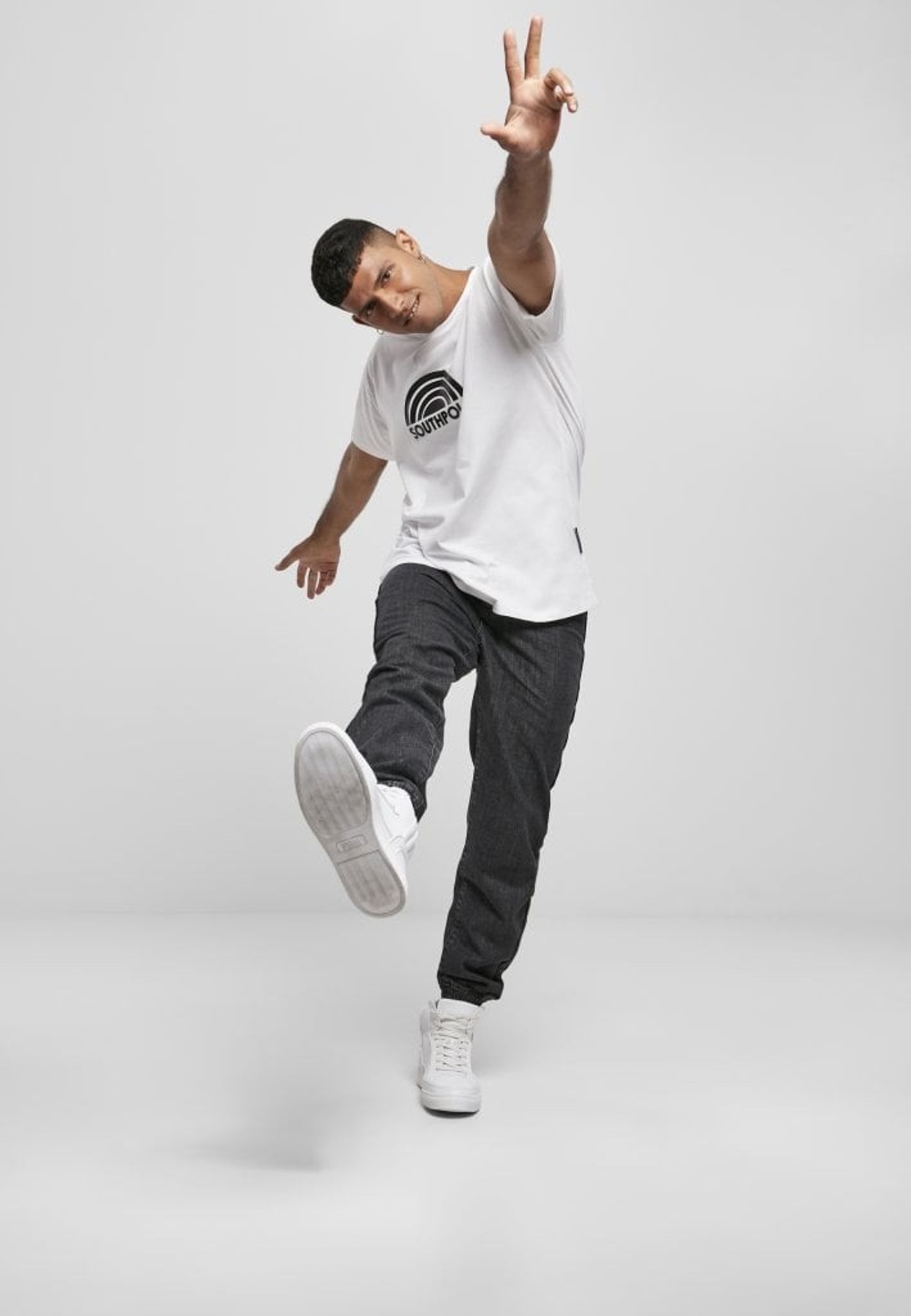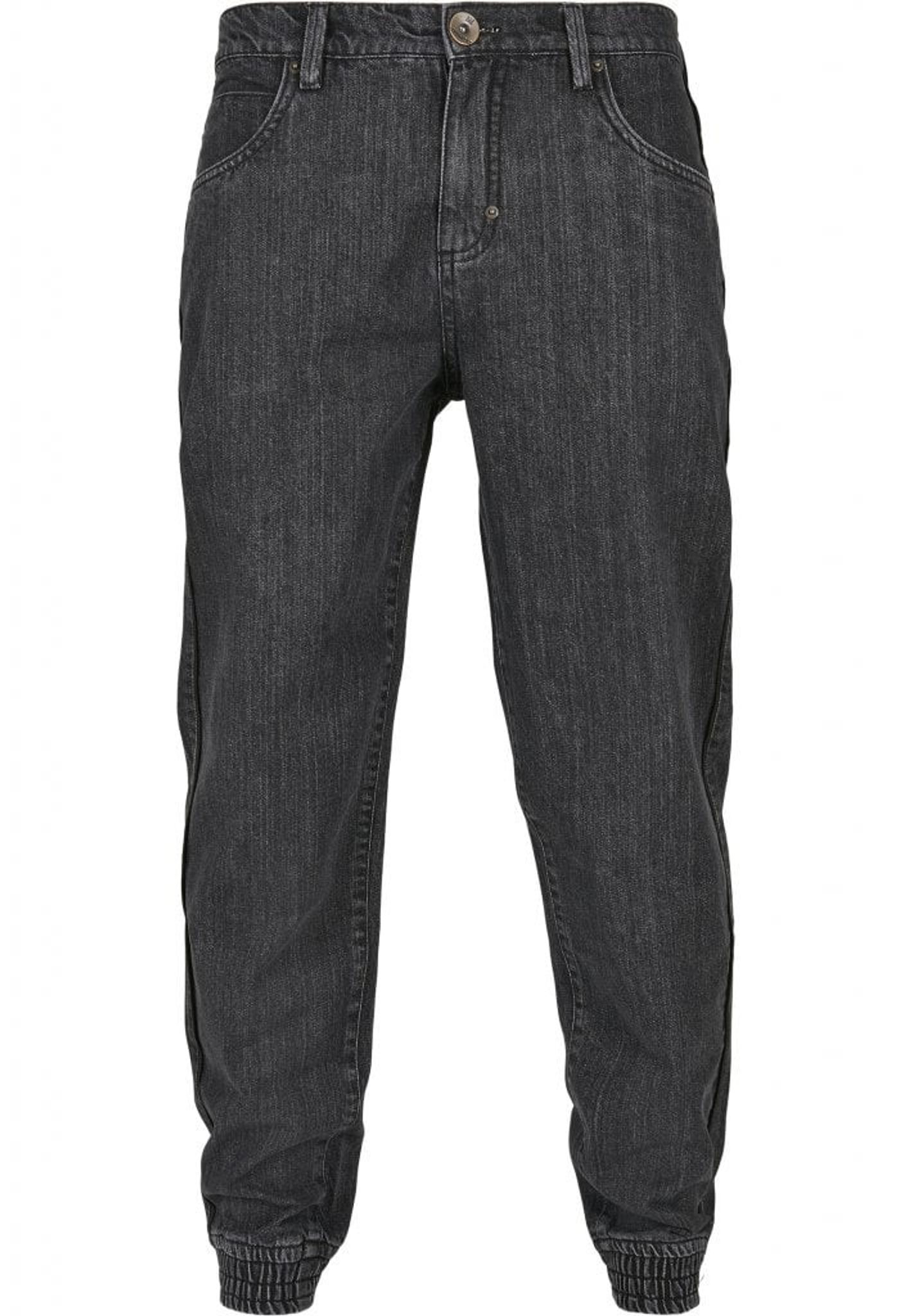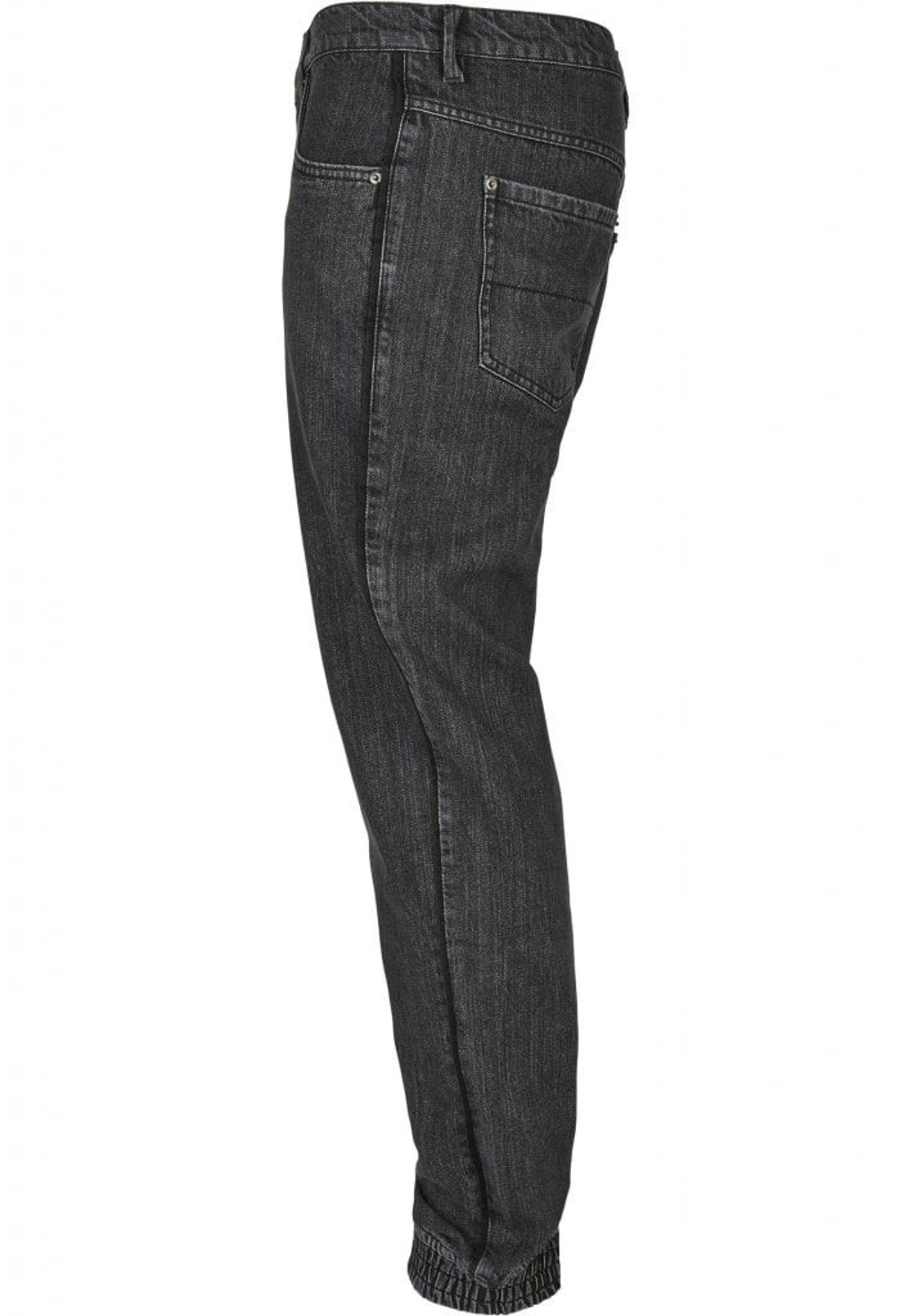 Ett par mörka tvättade jeans från Southpole. Jeansen har rejäla elastiska muddar nedtill på bensluten.