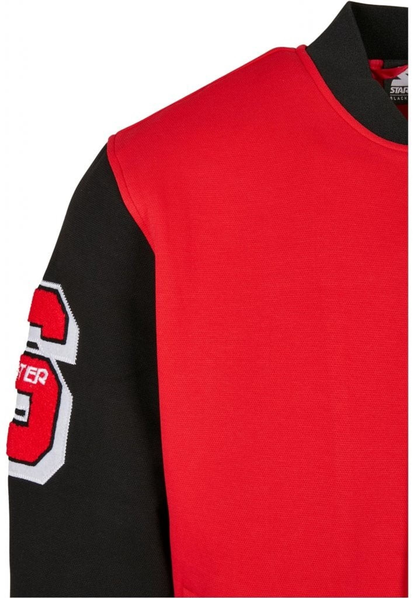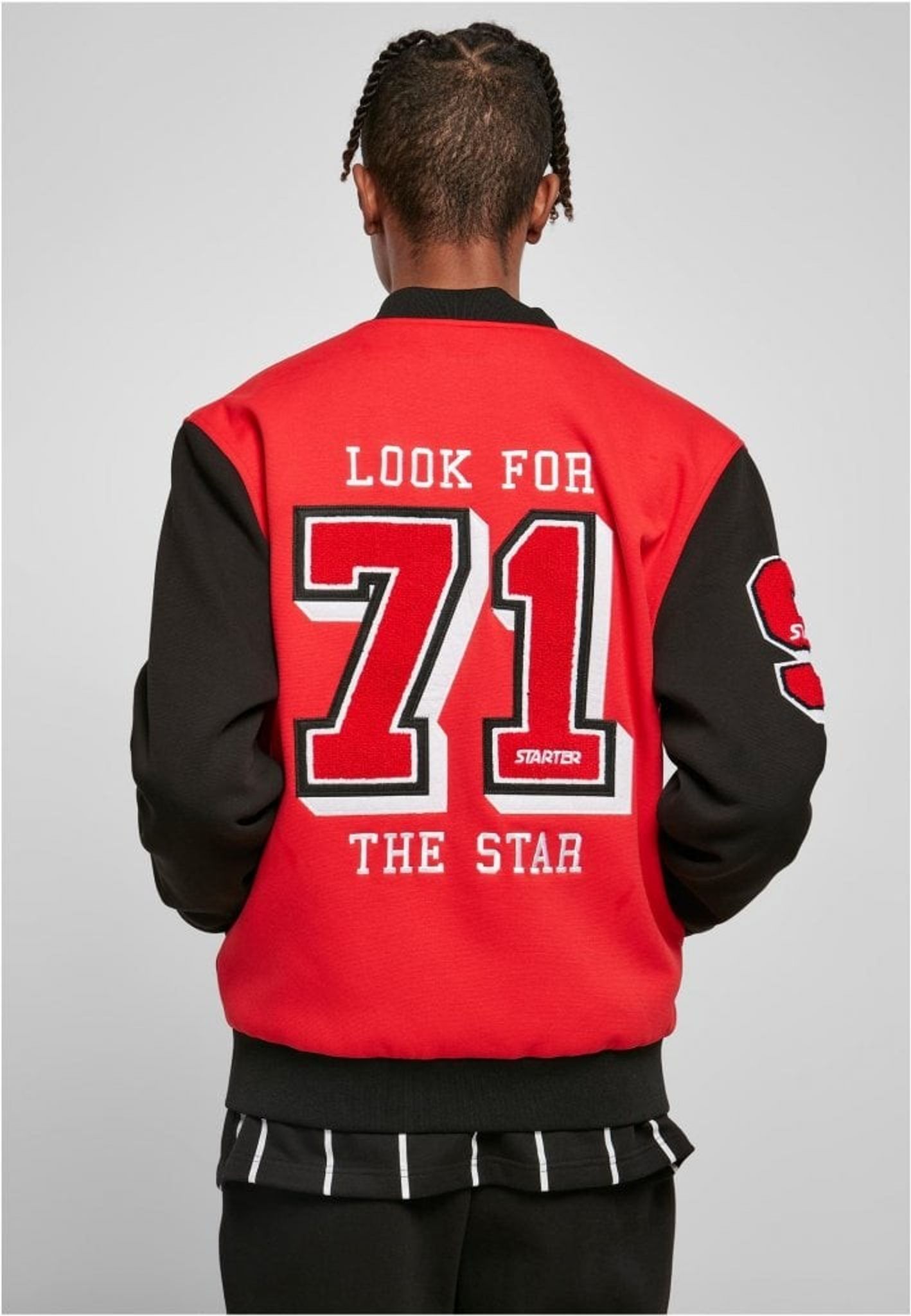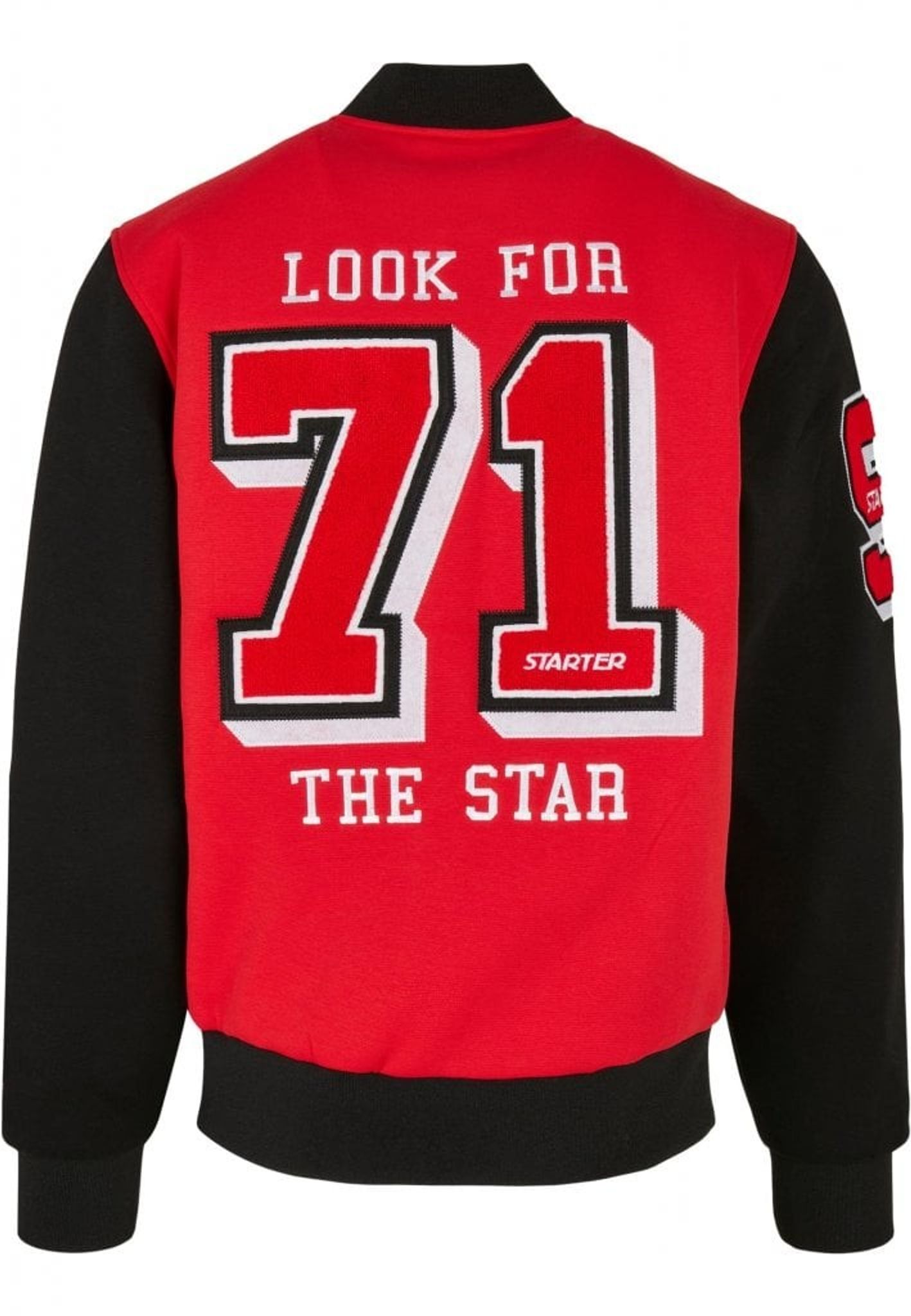 Starter levererar en tuff college-jacka med svarta ärmar och röd kropp. På ryggen finns 71 patchad och brodyr med texten "Look for the star".