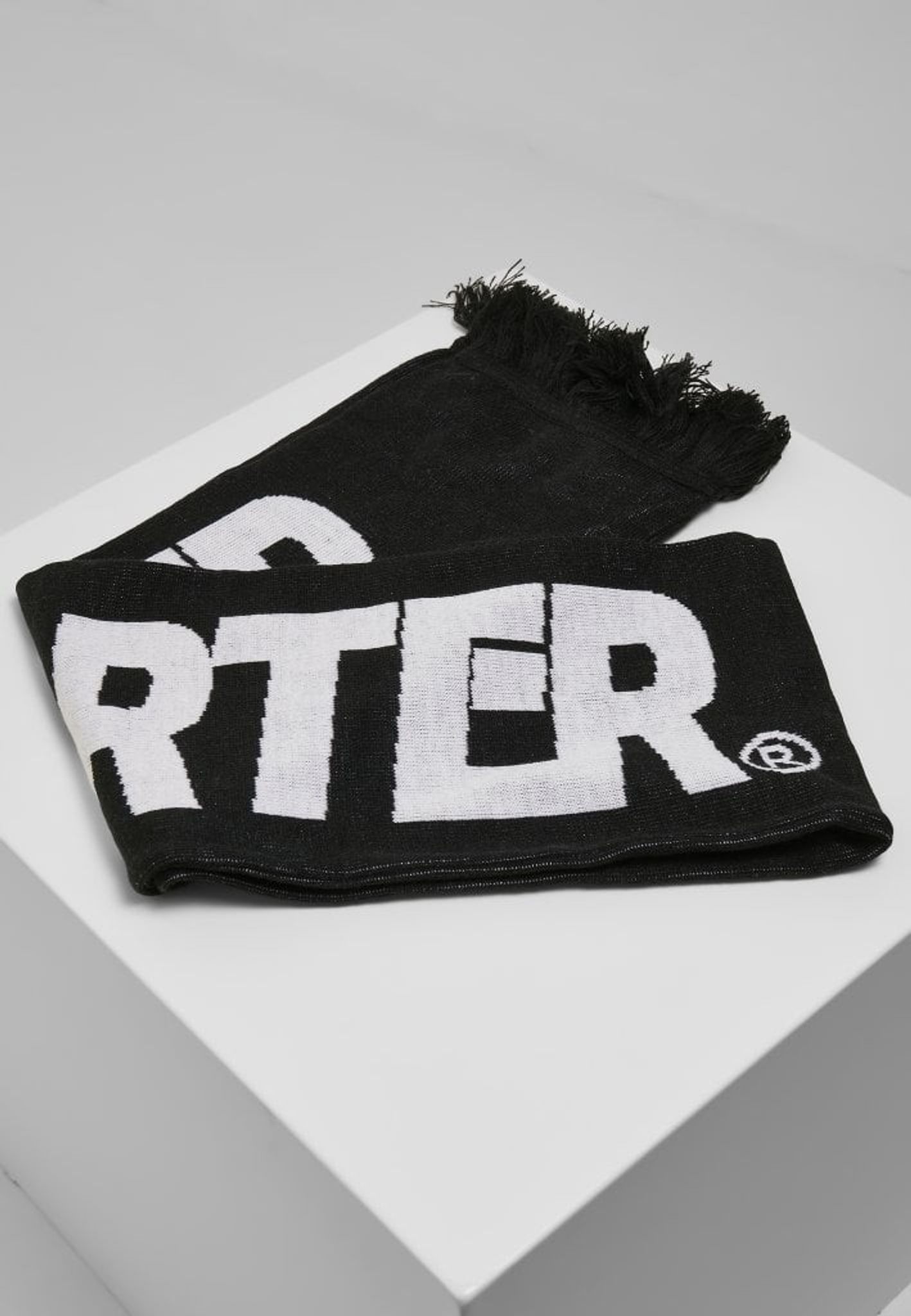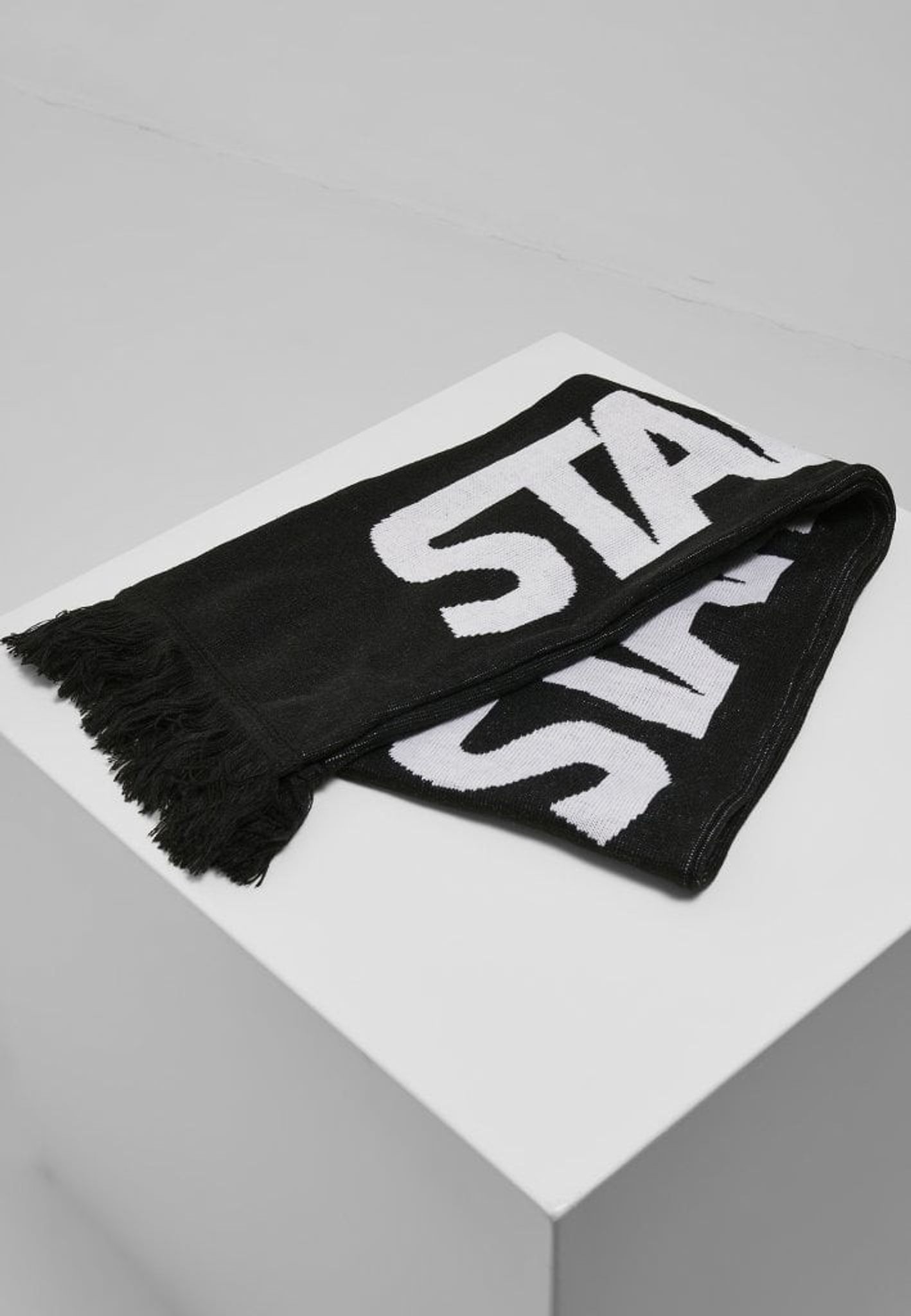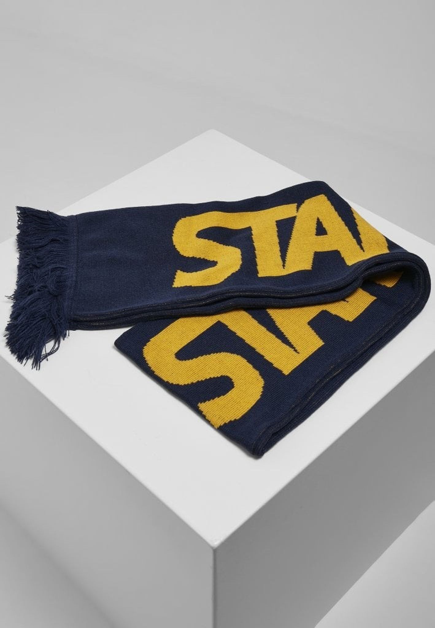 Halsduk från trendiga märket "Starter". Stor iögonfallande logotype med grå text på svart botten eller eller gul text på mörkt blå botten. Det är korta fransar i ändarna och den är gjord i mjuk akryl. Skön, värmande accesorar som lyfter din outfit.