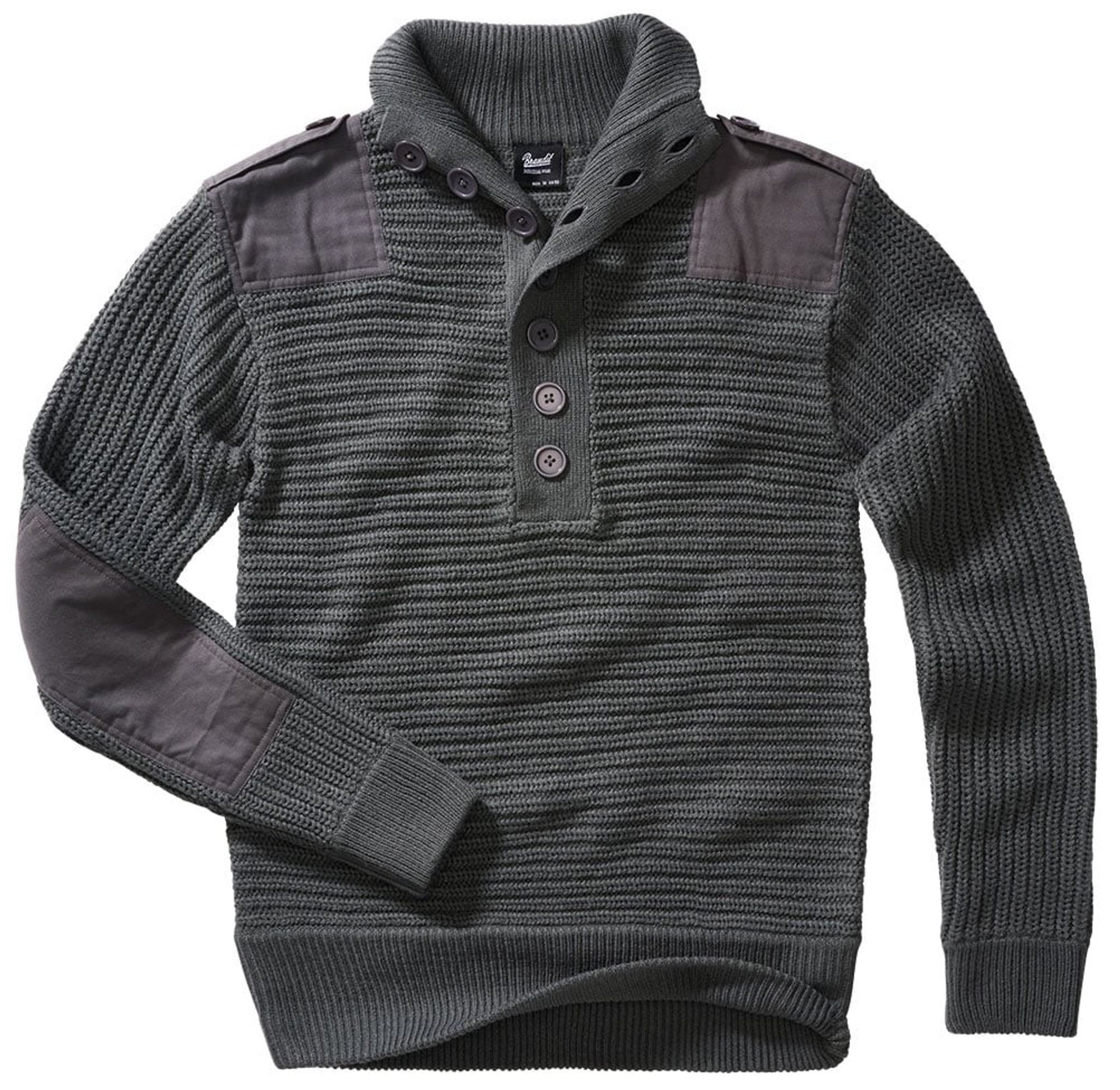 I ärmslut och midja sitter det breda elastiska muddar. Armbågarna och axlarna är förstärkta och axlarna är försedd med klaffar. Den stickade sweatern har en hög hals som knäpps med matchande knappar.