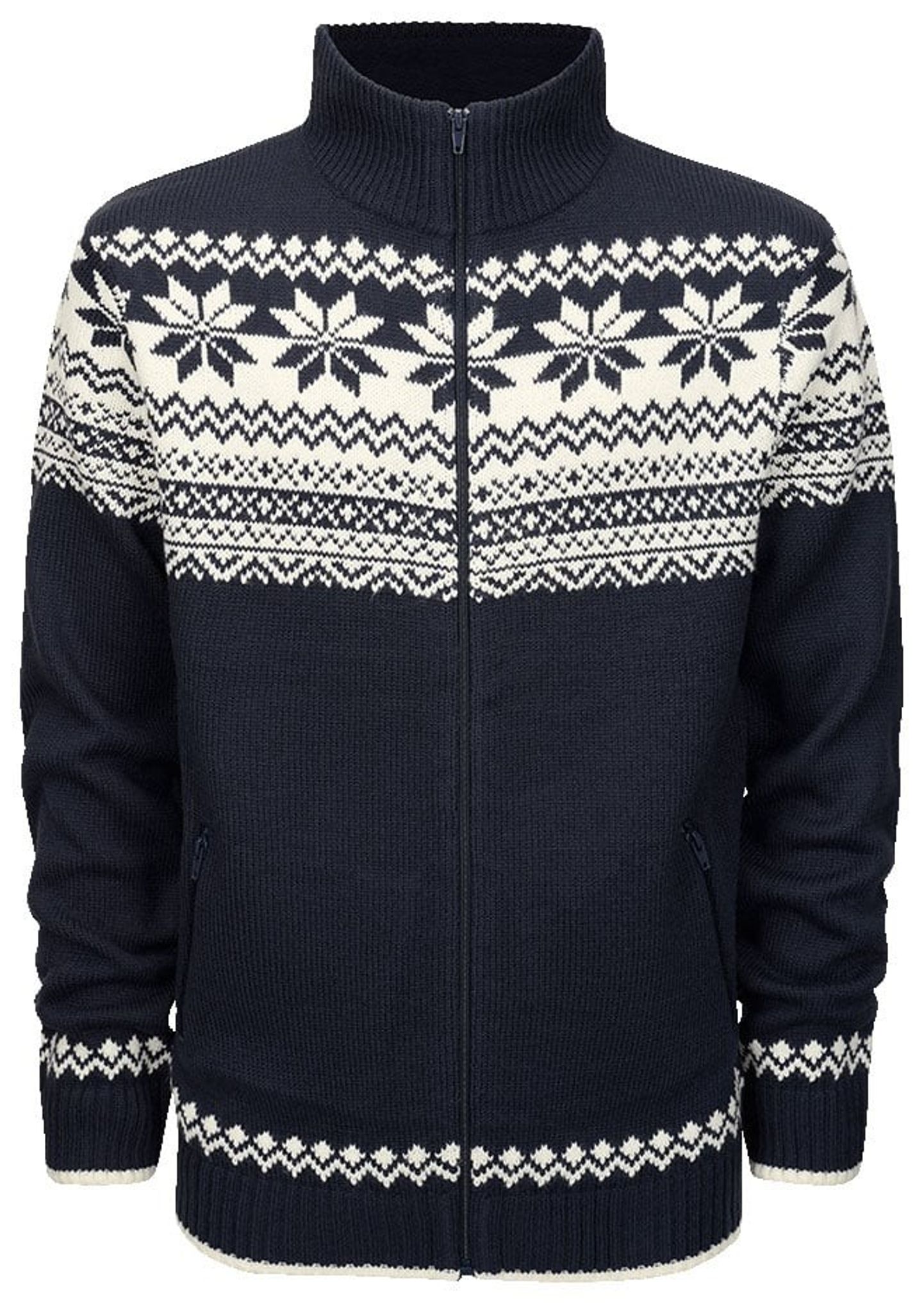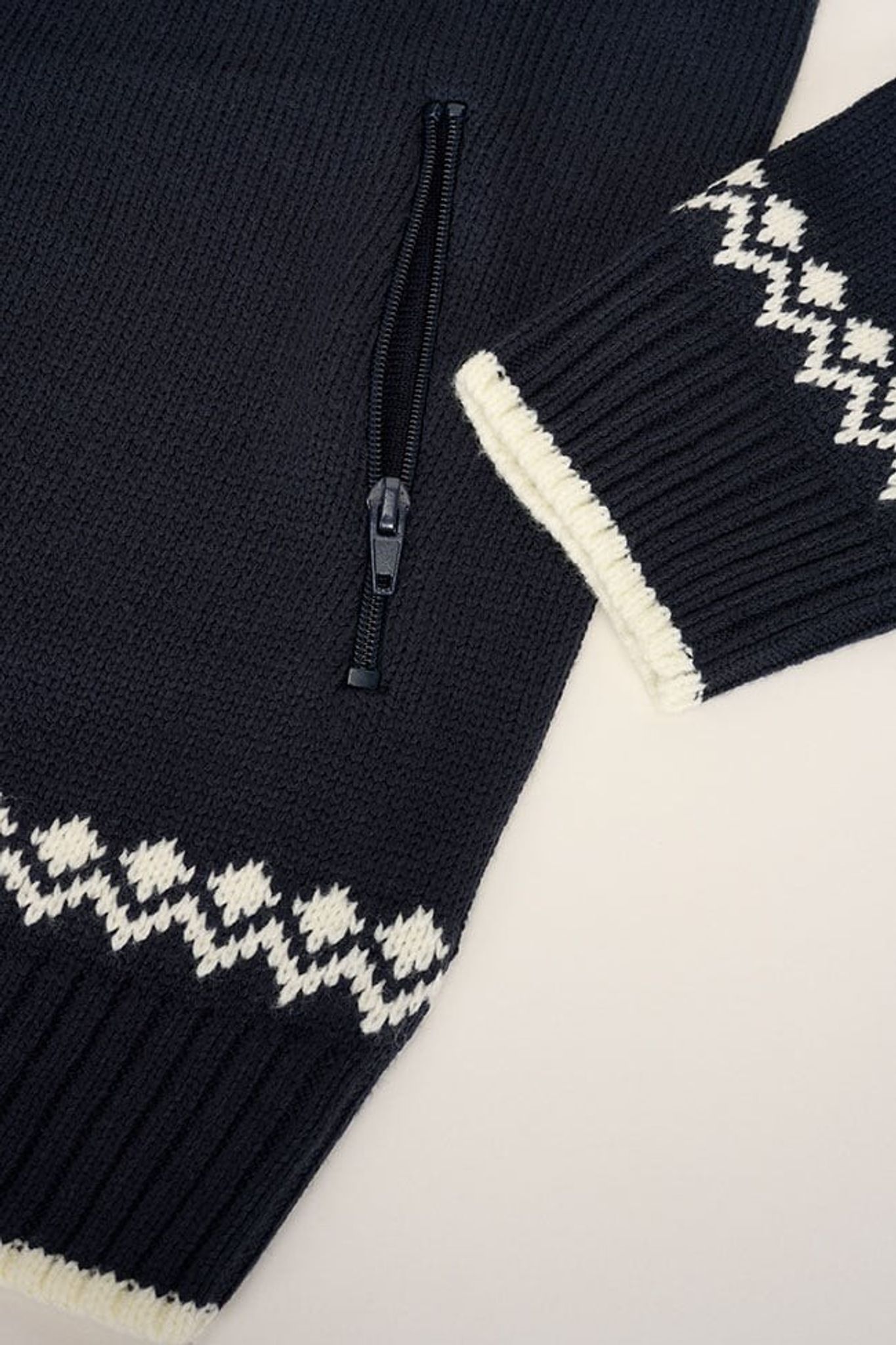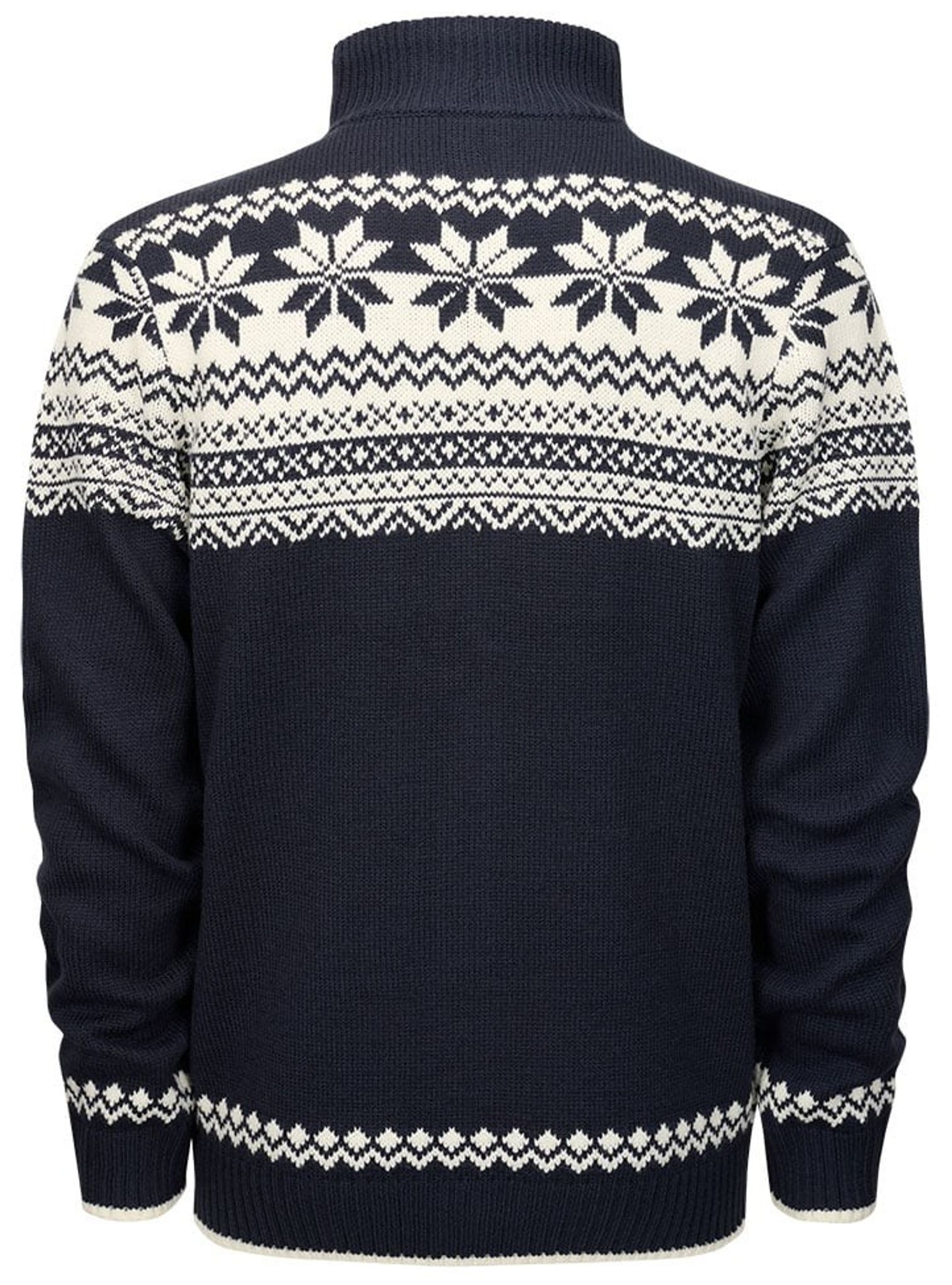 En stickad ziptröja i mörkblått och vitt. Stickningen är gjord i mönter som hämtats från den klassiska norska Lusekoftan. En både tidslös och varm kofta med norsk design.