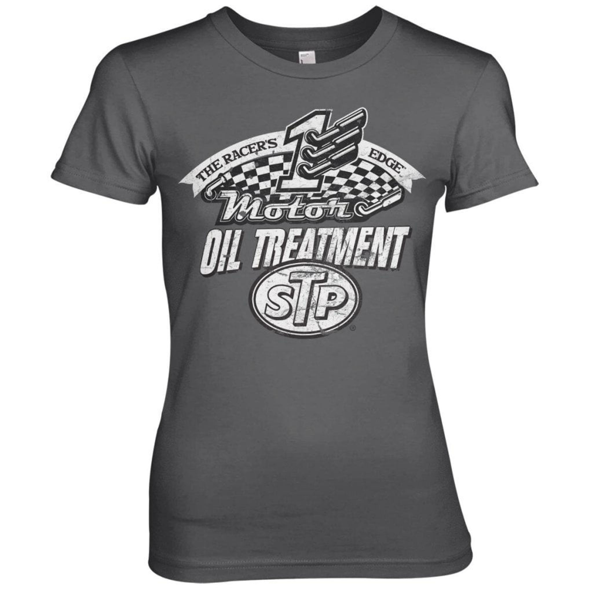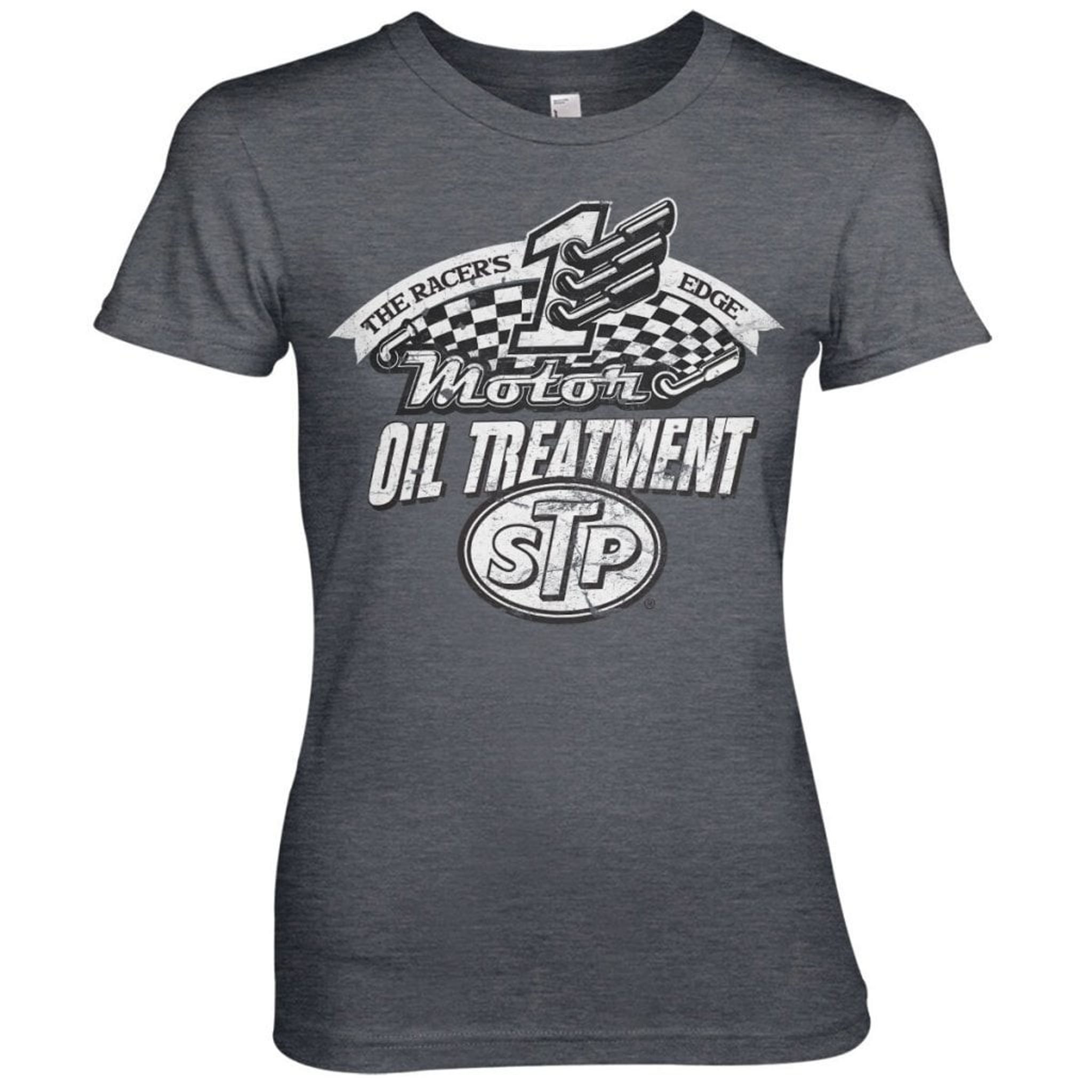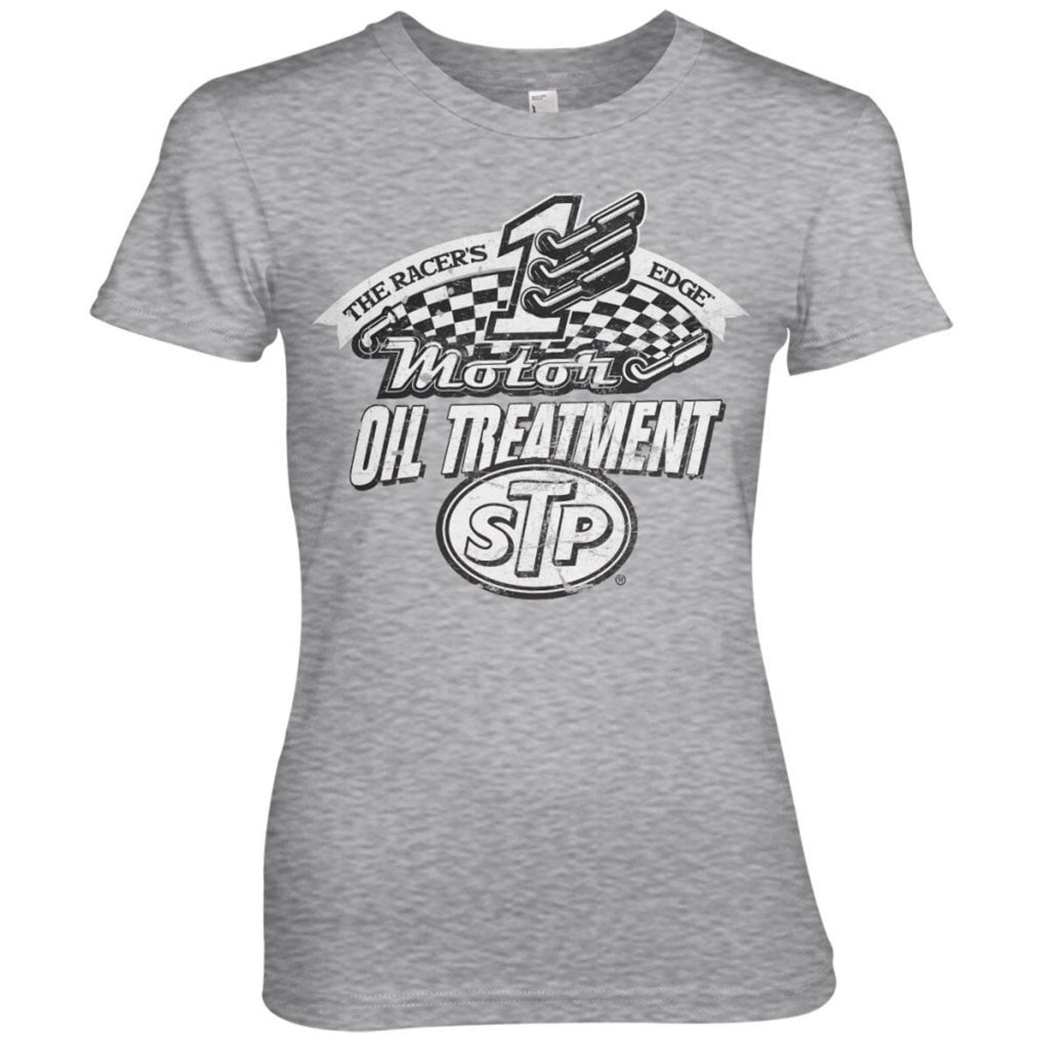 STP-motivet på denna Tjej T-shirt är en hyllning till racingvärlden och högpresterande oljebehandlingar. "The Racer's Edge" skriker fart och adrenalin, med en siffra "1" som symboliserar snabbhet och schackrutemönstret som representerar racing. Under "Motor" finns texten "OIL TREATMENT" som lovar att hålla din motor i toppskick.