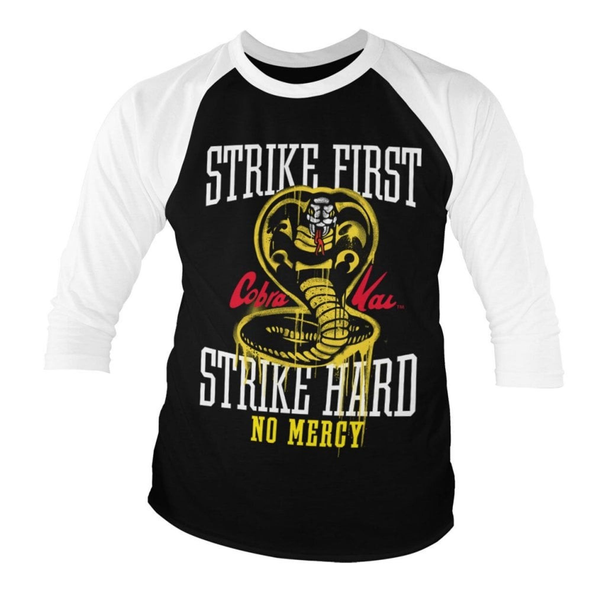 Är du en fan av Karate Kid och Cobra Kai? Då kommer du älska denna Strike First - Strike Hard - No Mercy Baseball 3/4 Sleeve Tee! Med sitt retro-inspirerade design och bekväma passform är denna T-shirt perfekt för att visa upp din kärlek för denna ikoniska film och TV-serie.