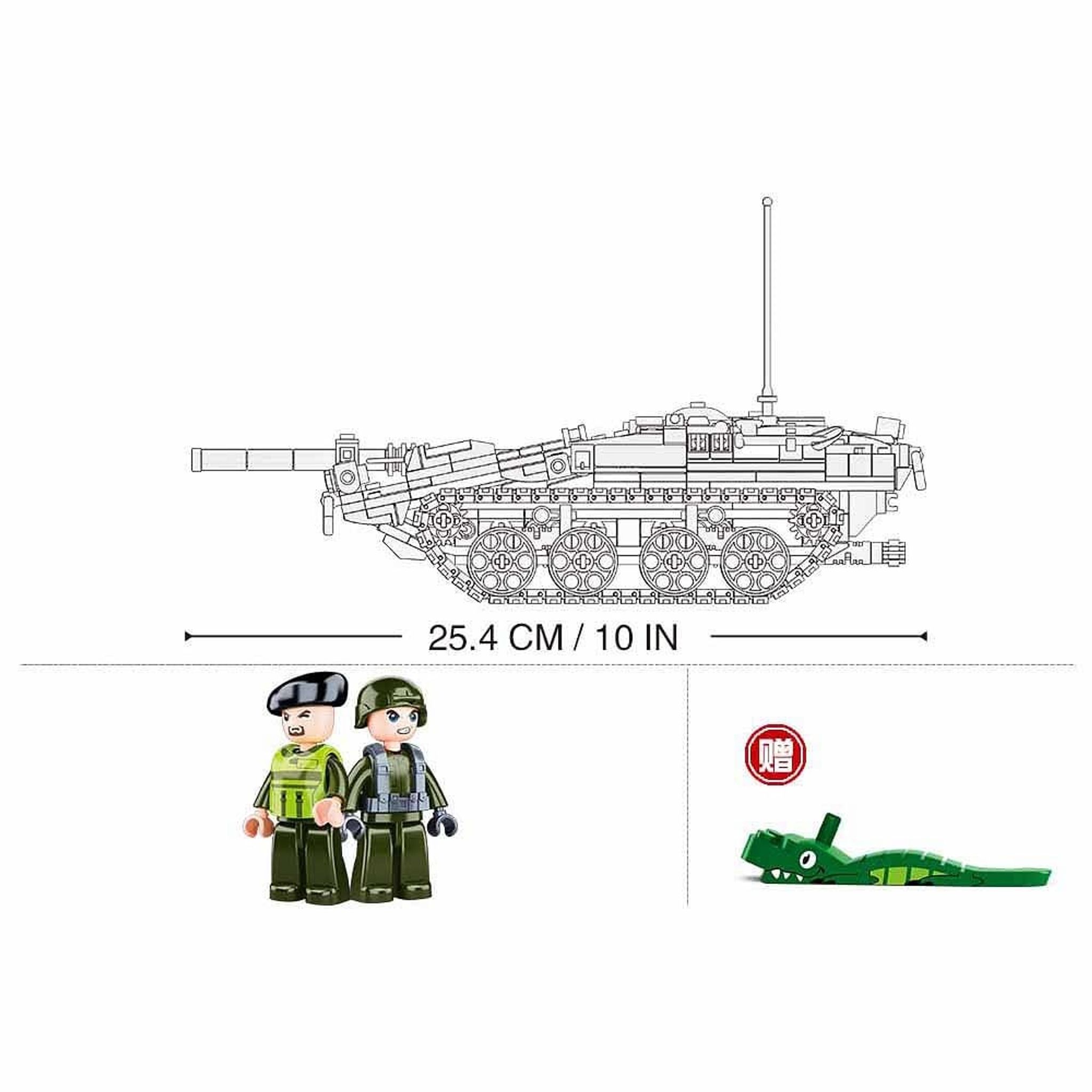 - Modellstorlek: Stridsvagnen mäter 25,4 cm (10 tum) i längd.
