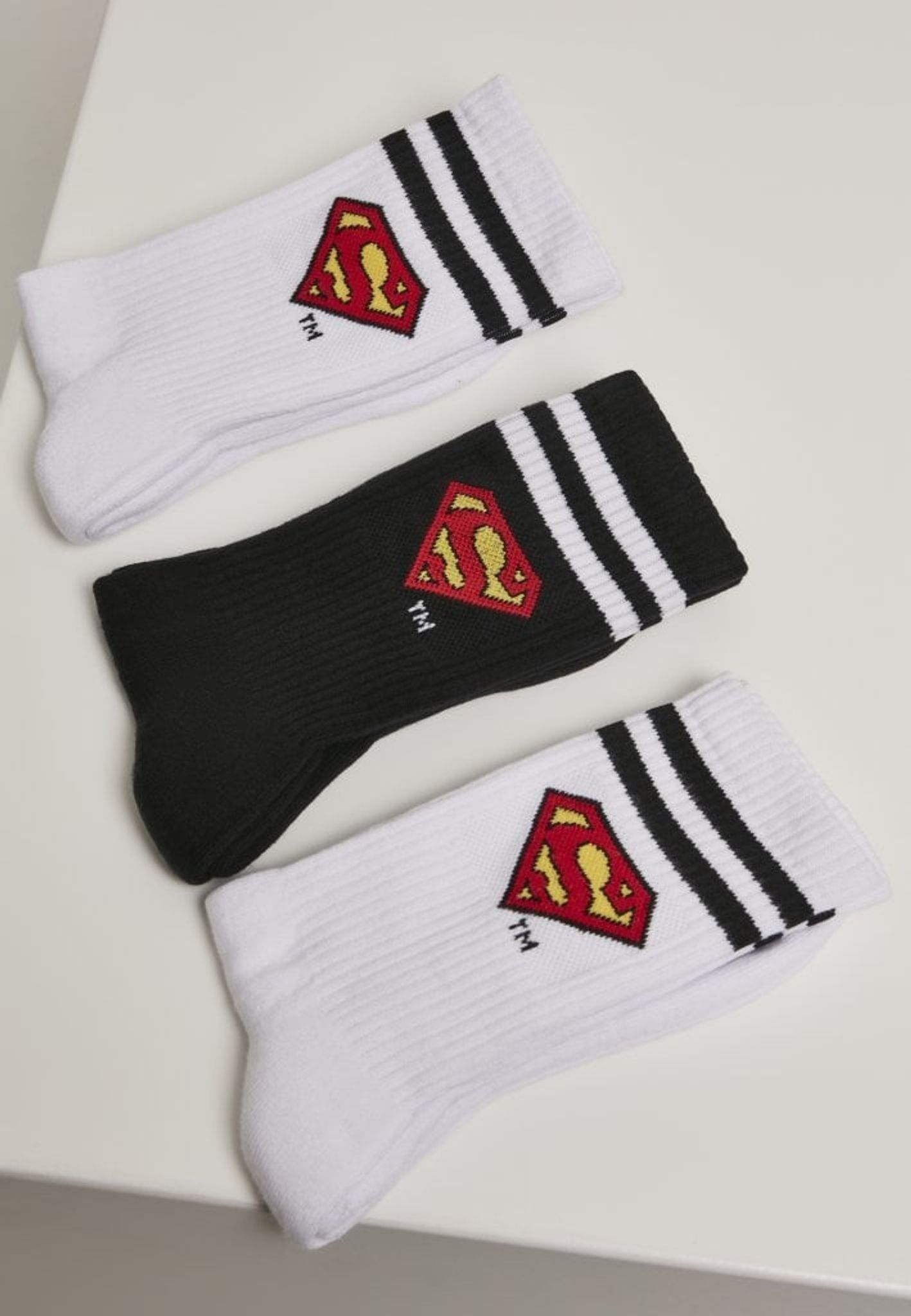 Tre stycken par strumpor med Supermans logotyp på halsen.