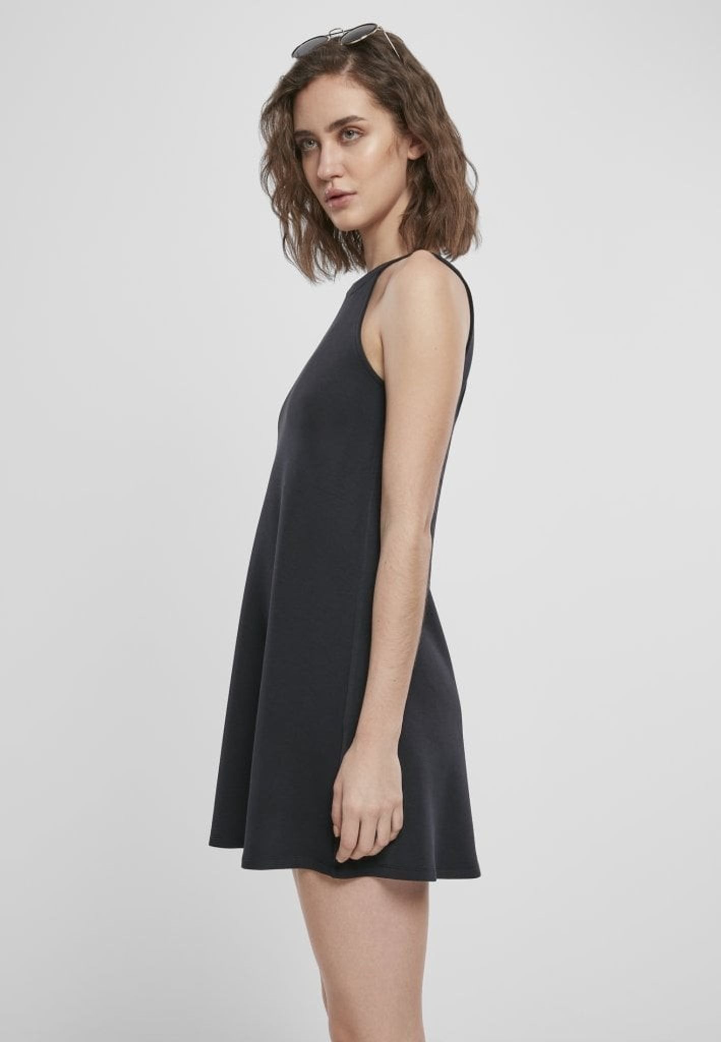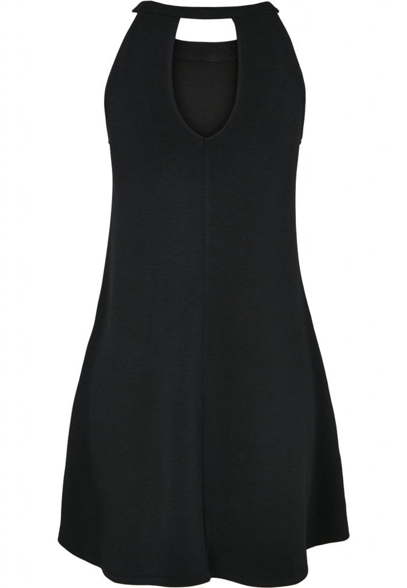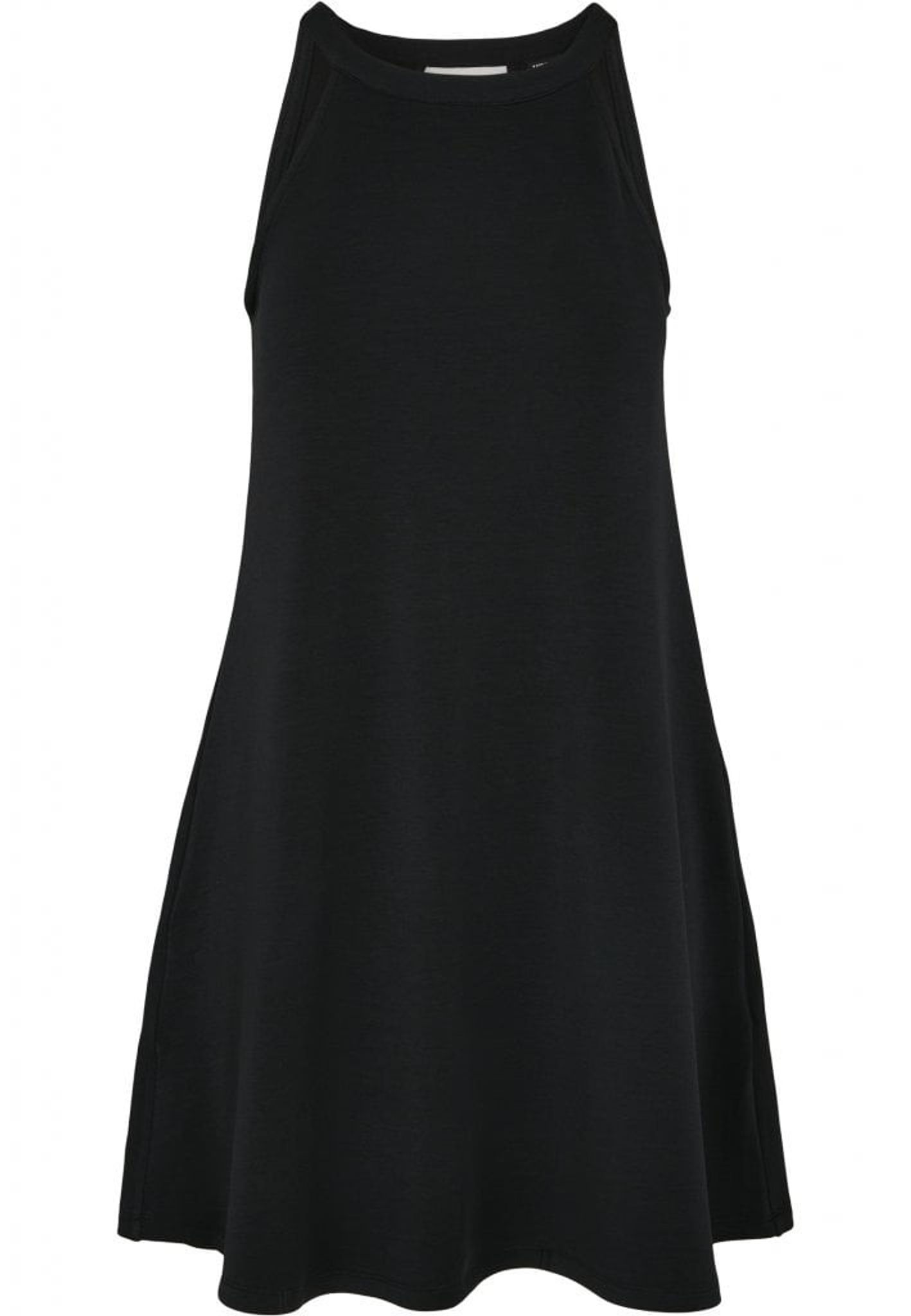 En svart klänning med en elegant halsringning. Klänningen har inga armar och en båthals med en detalj i nacken.