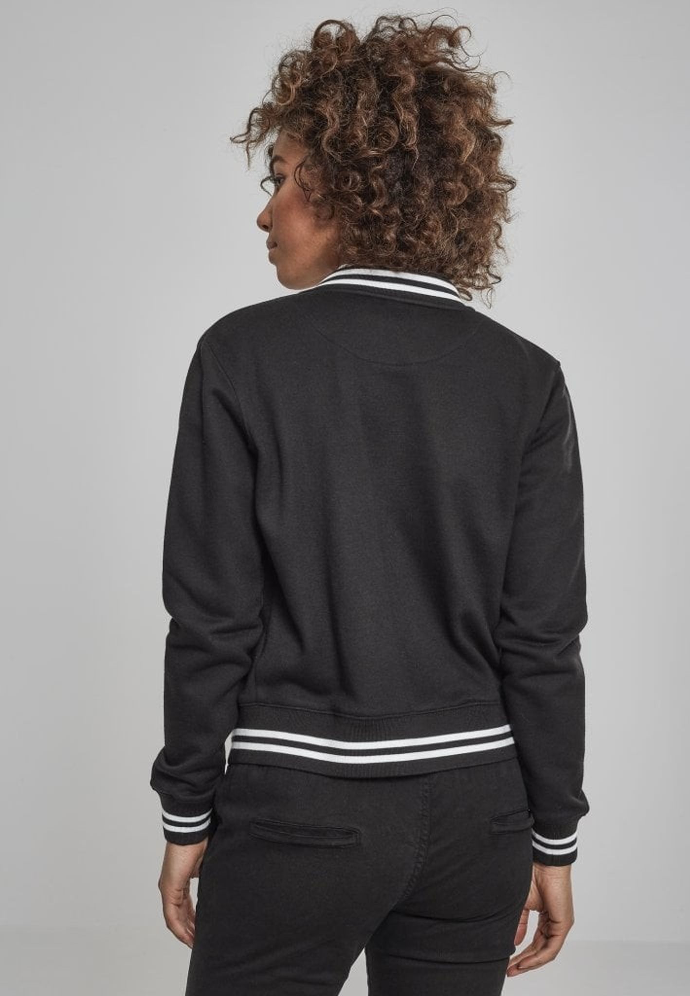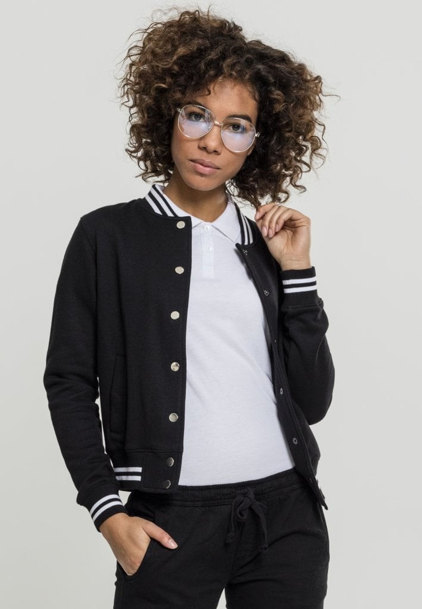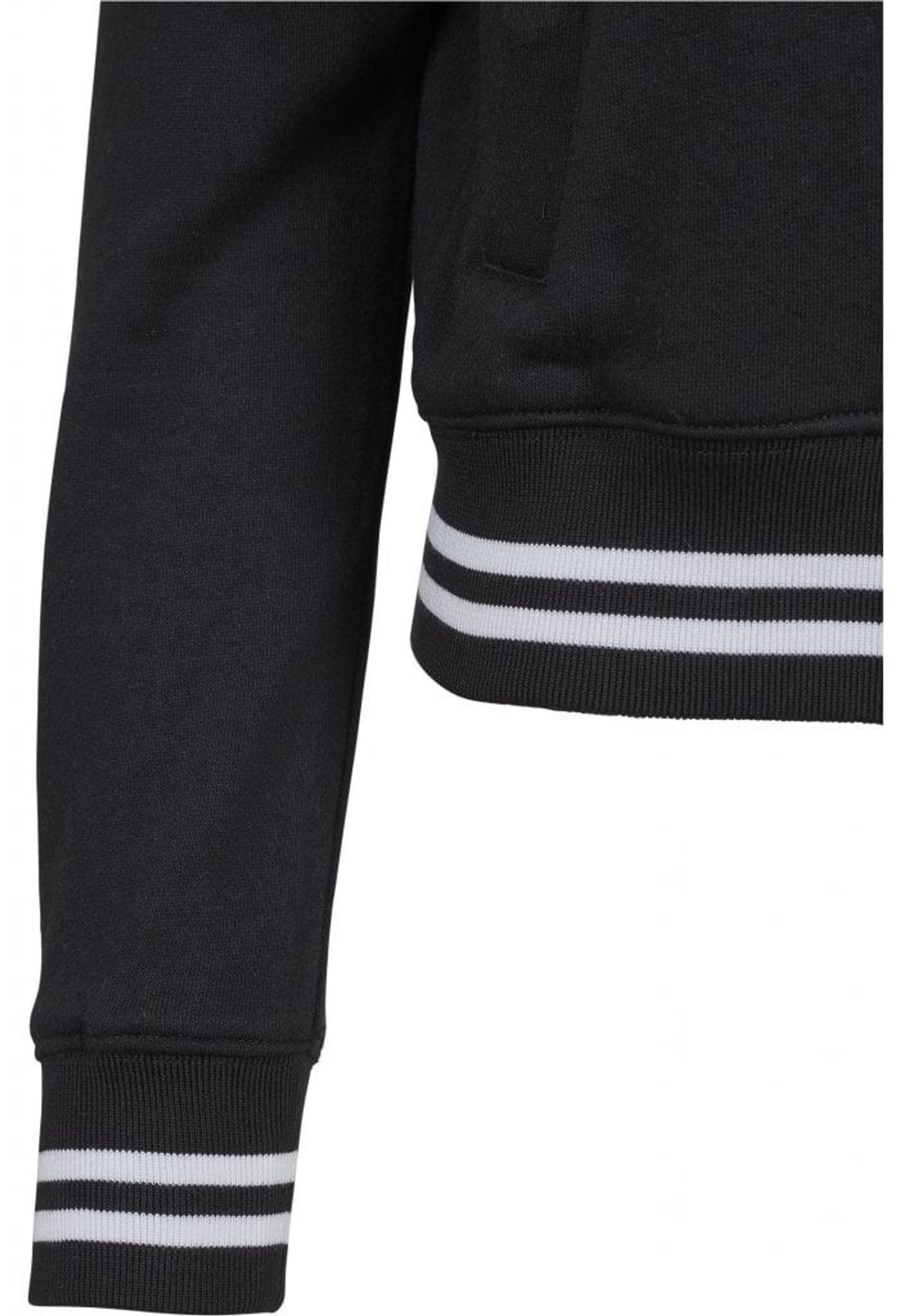 Detta är en jacka i klassisk collegestil med svart och vit randiga muddar.
