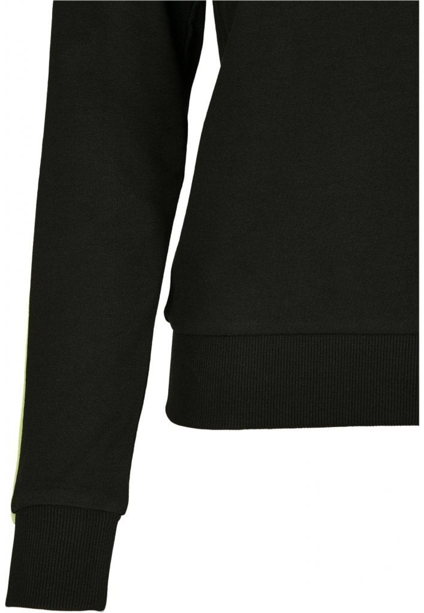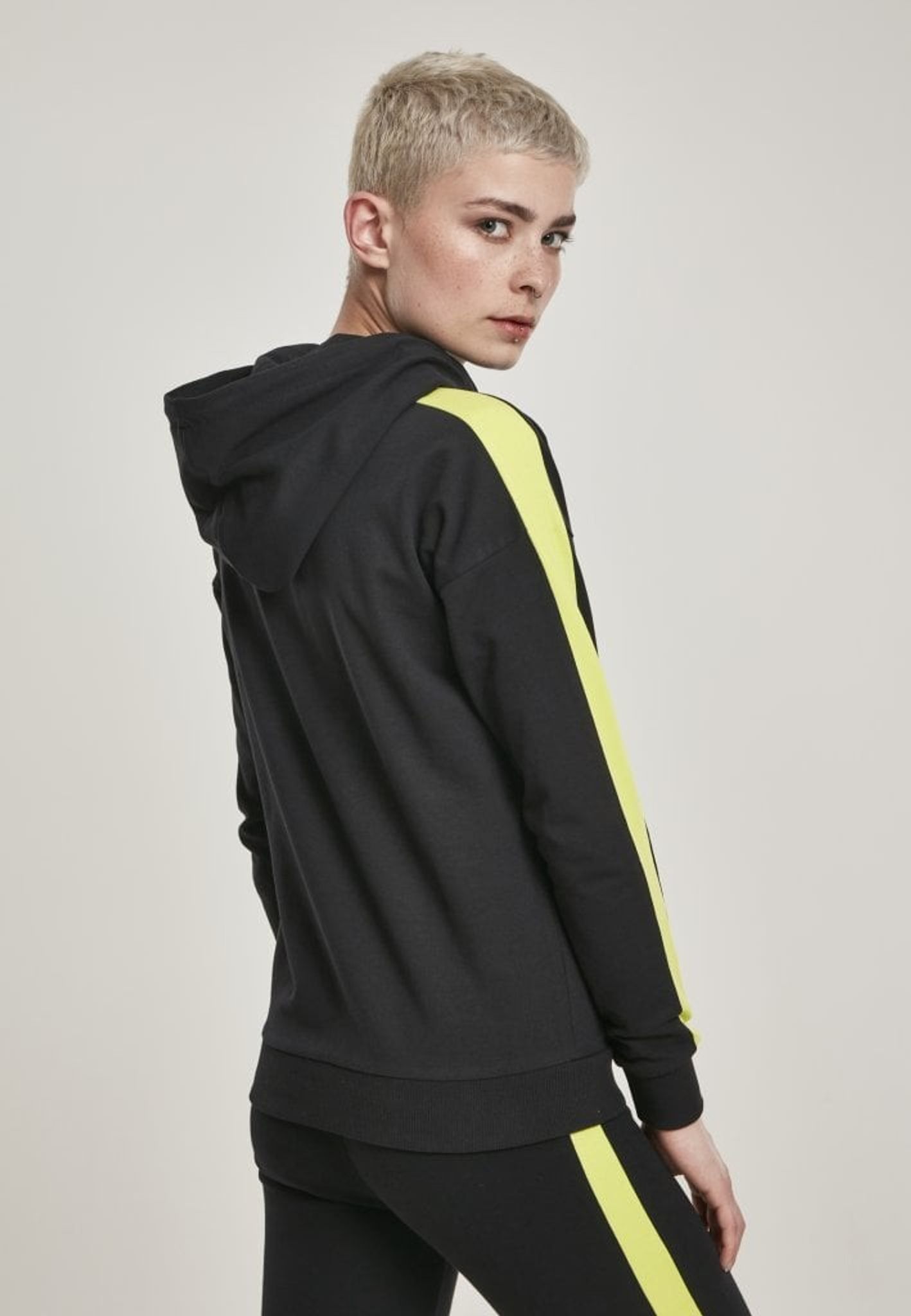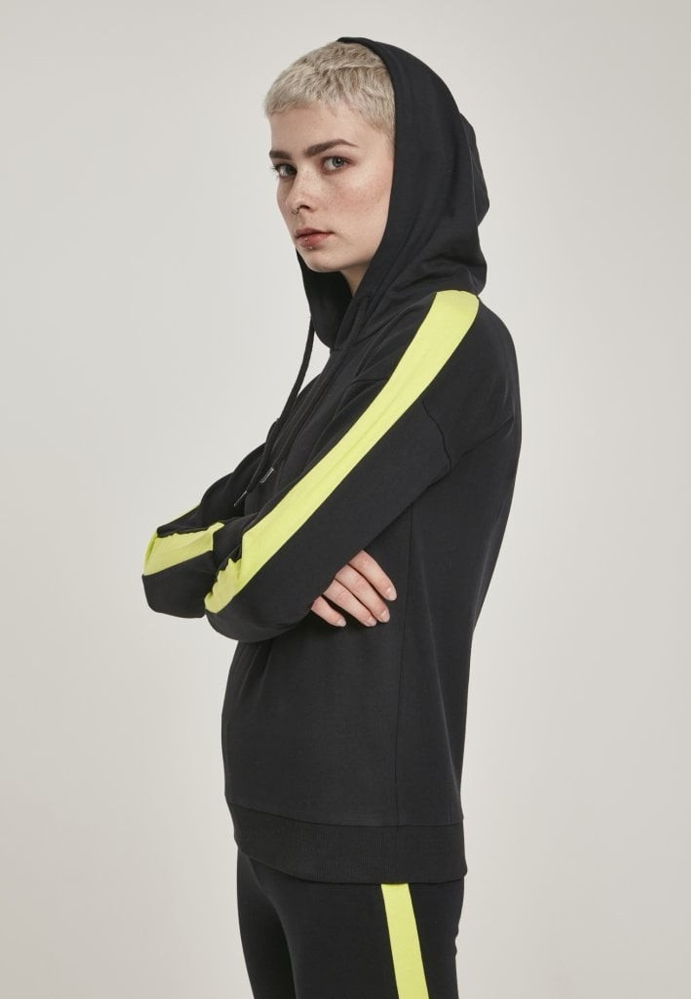 En svart luvtröja med en limefärgad rand i neon på armarna.