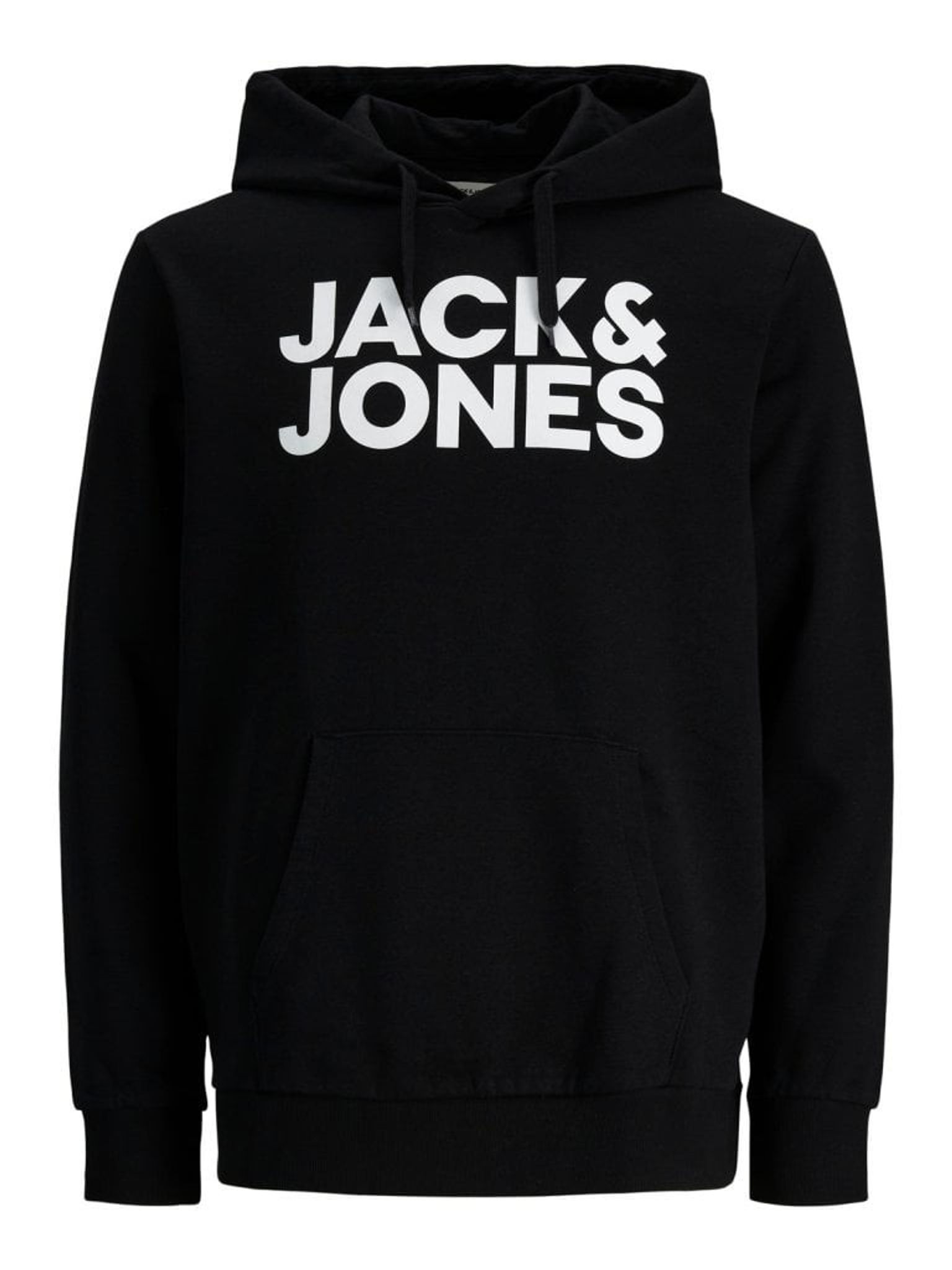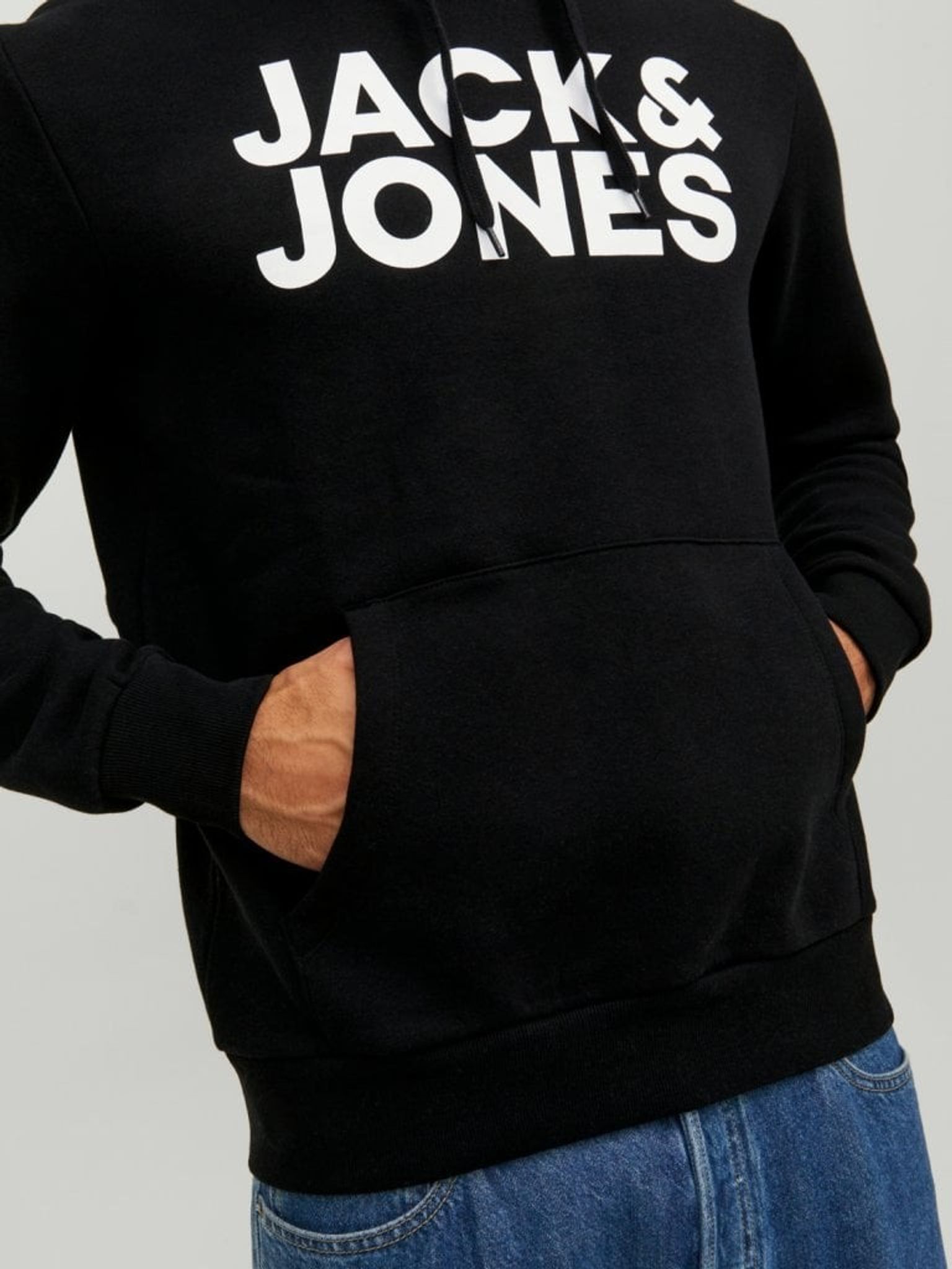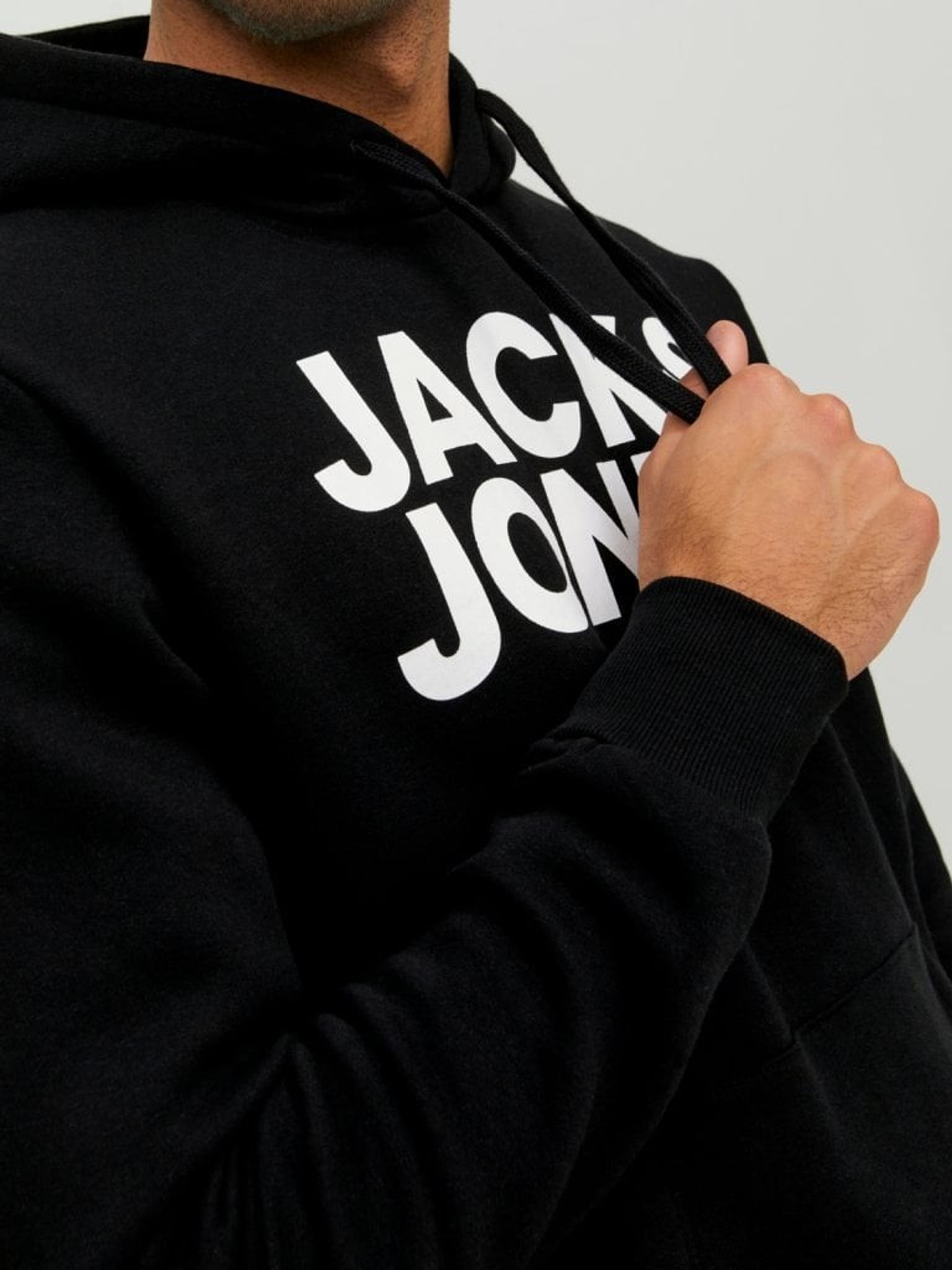 Den här svarta Jack and Jones logo hoodien för herr är tillverkad i en mjuk och borstad tyg med en len känsla på insidan. Hoodien har långa ärmar med en standard passform och en luva.