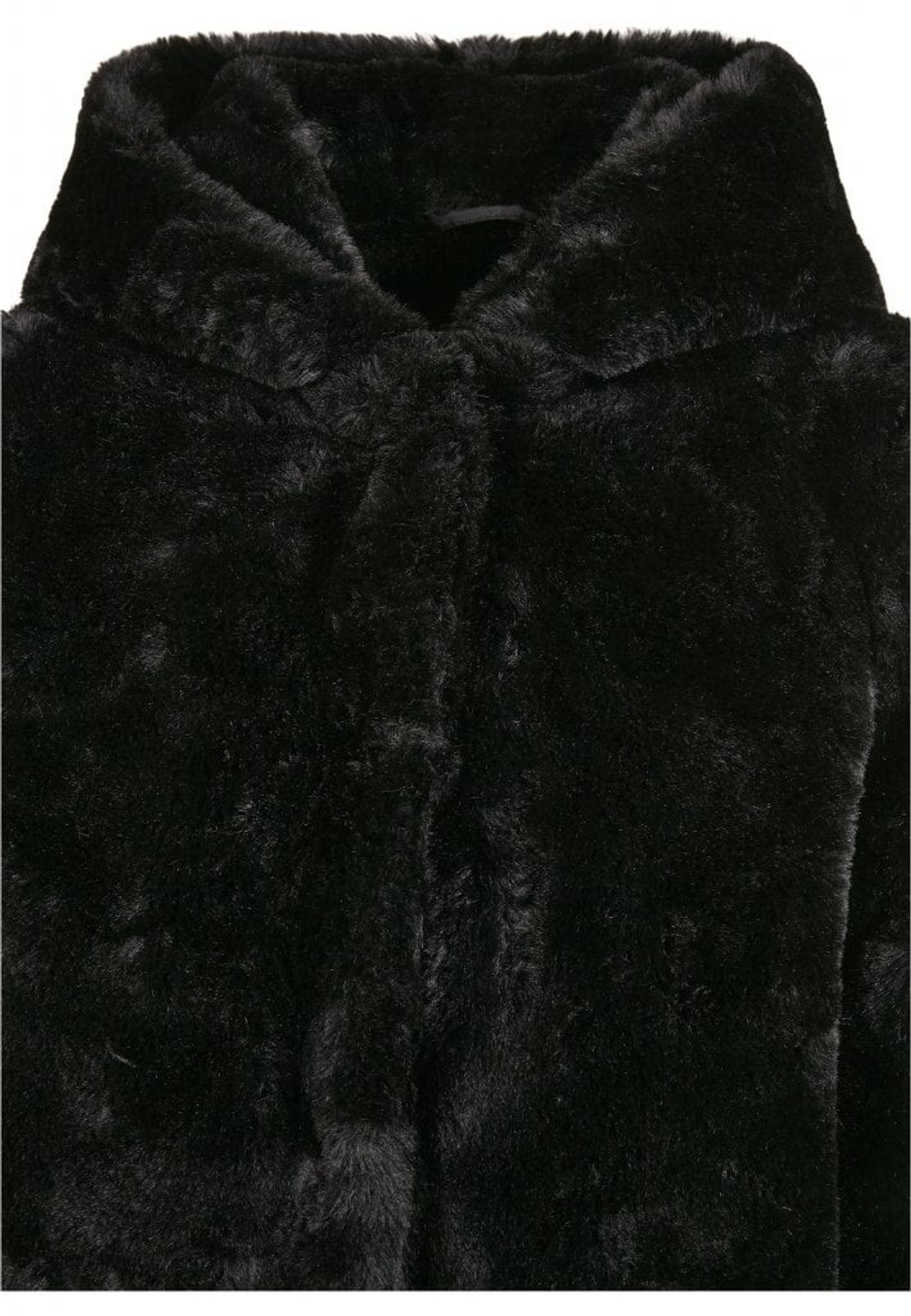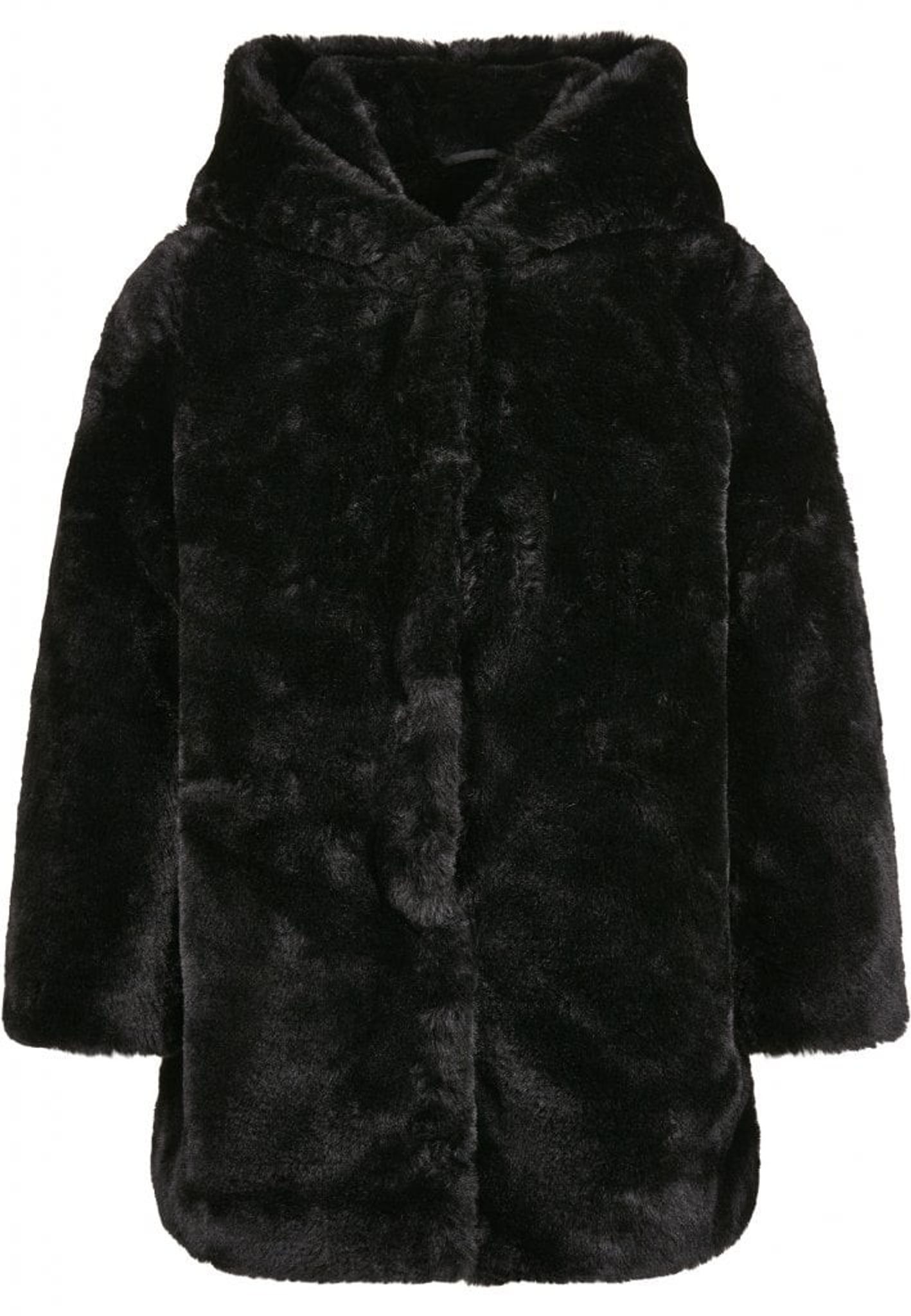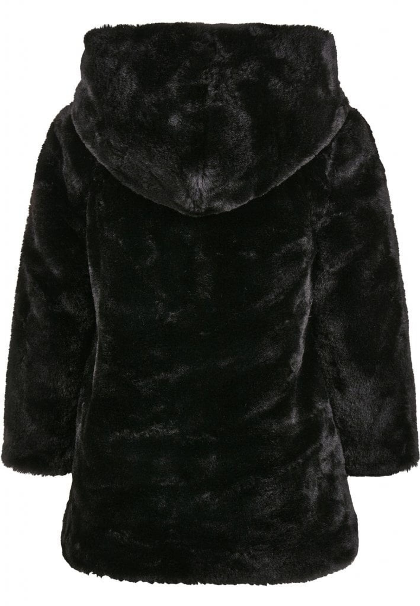 En svart kappa i mjuk och len konstpäls. Kappan har en huva som även den är försedd med den sköna pälsen. På insidan av jackan finns ett foder i lent polyestertyg.