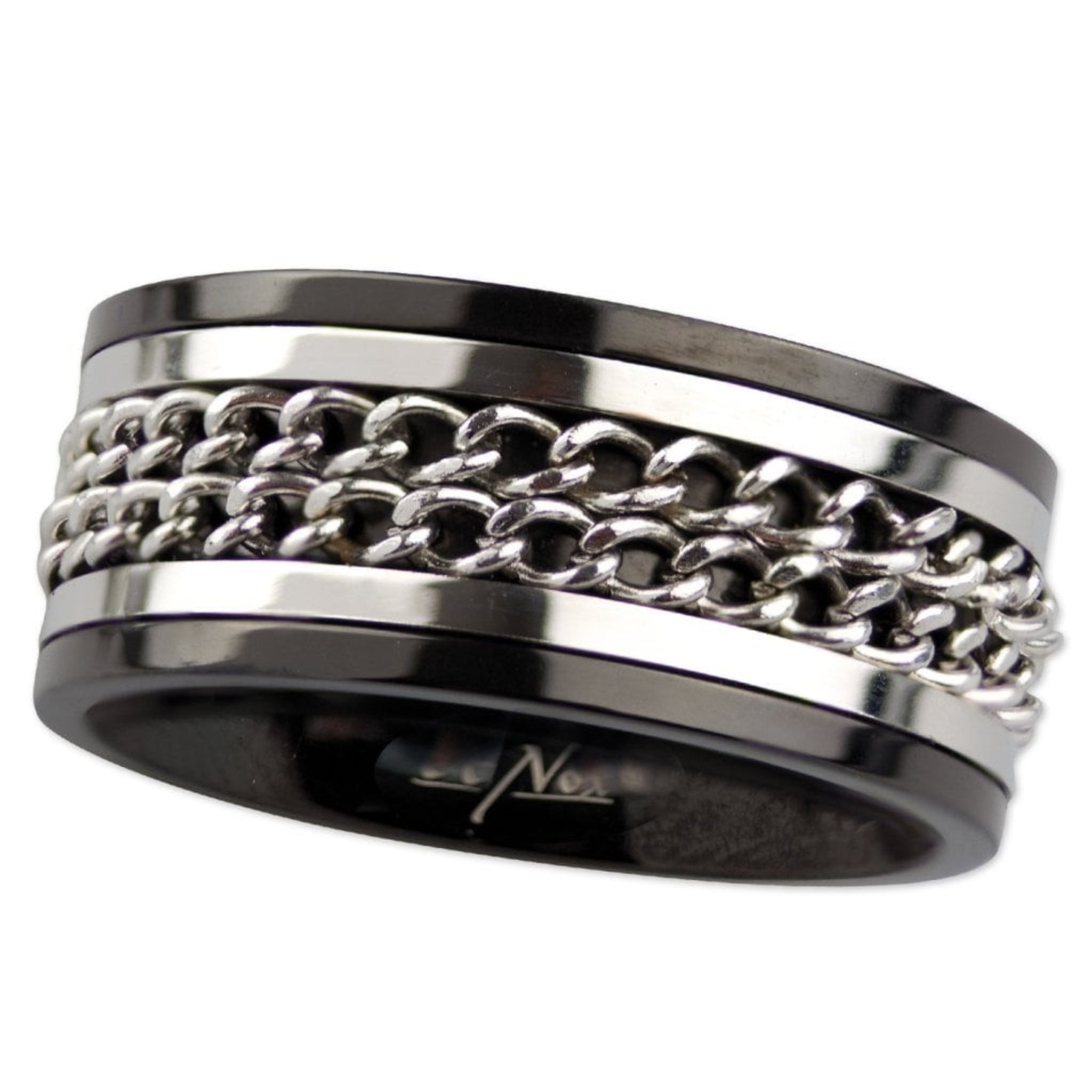 En blank kolsvart ring som bryts av med ett band av blank silver.