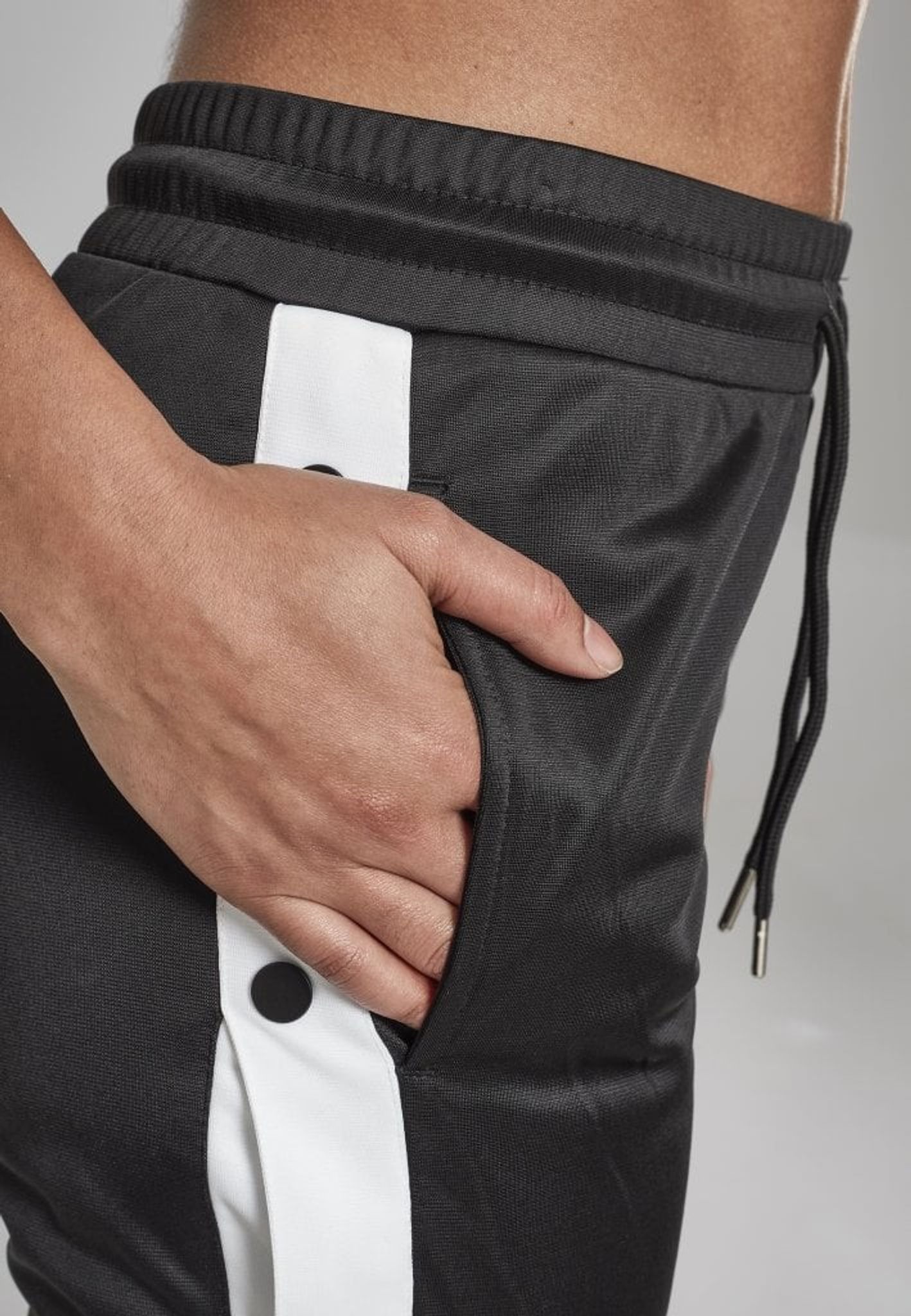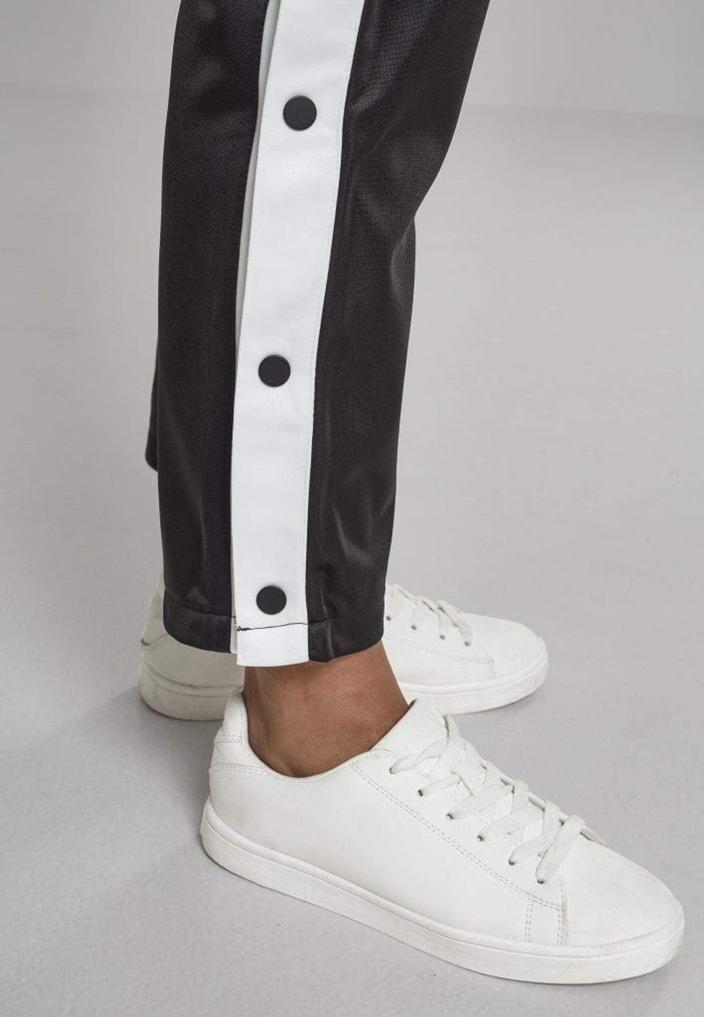 - Mönster: vit rand i sidan på byxan med svarta knappar
