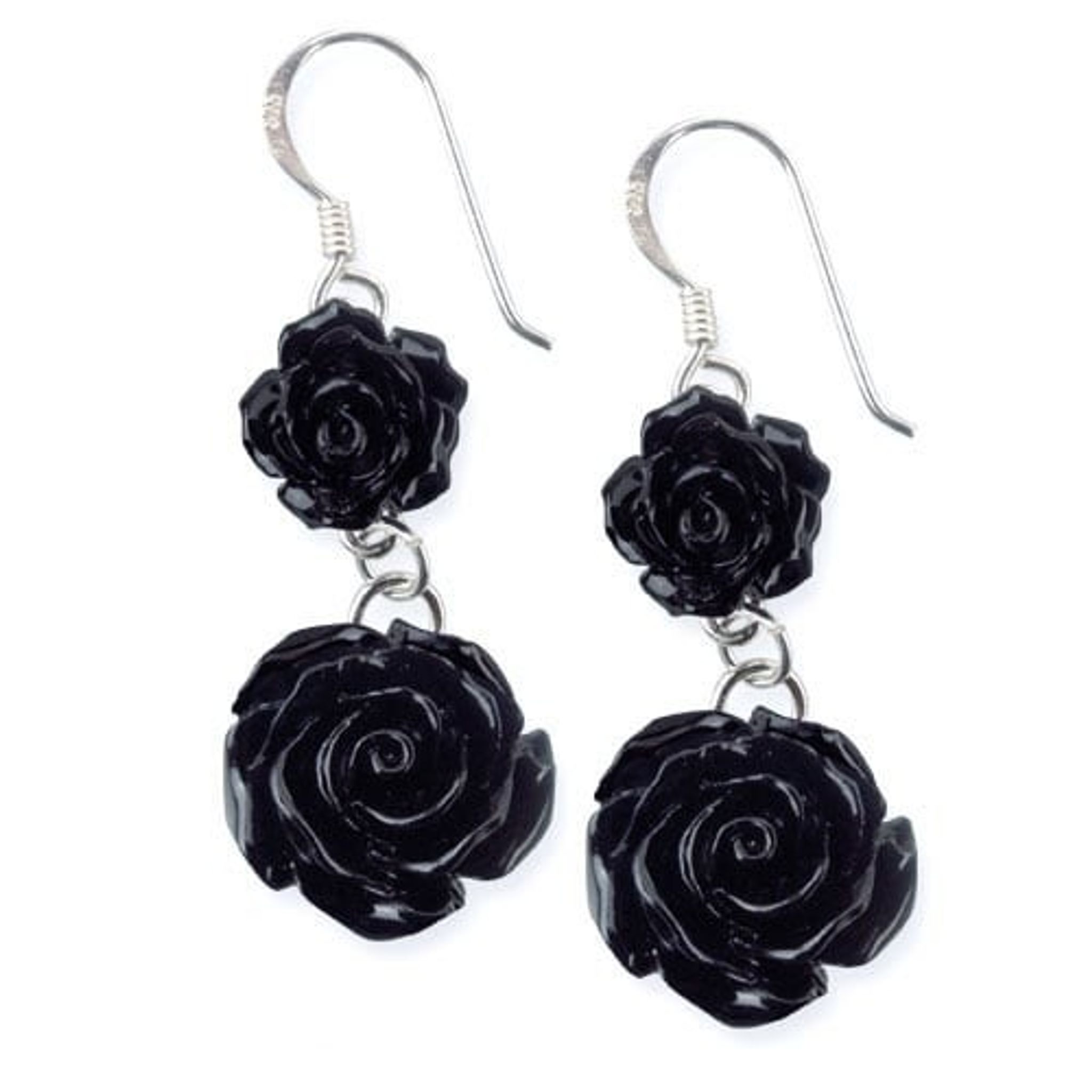 Underbara örhängen med stora svarta rosor. En mindre och en större ros är sammanlänkade i ett hänge.