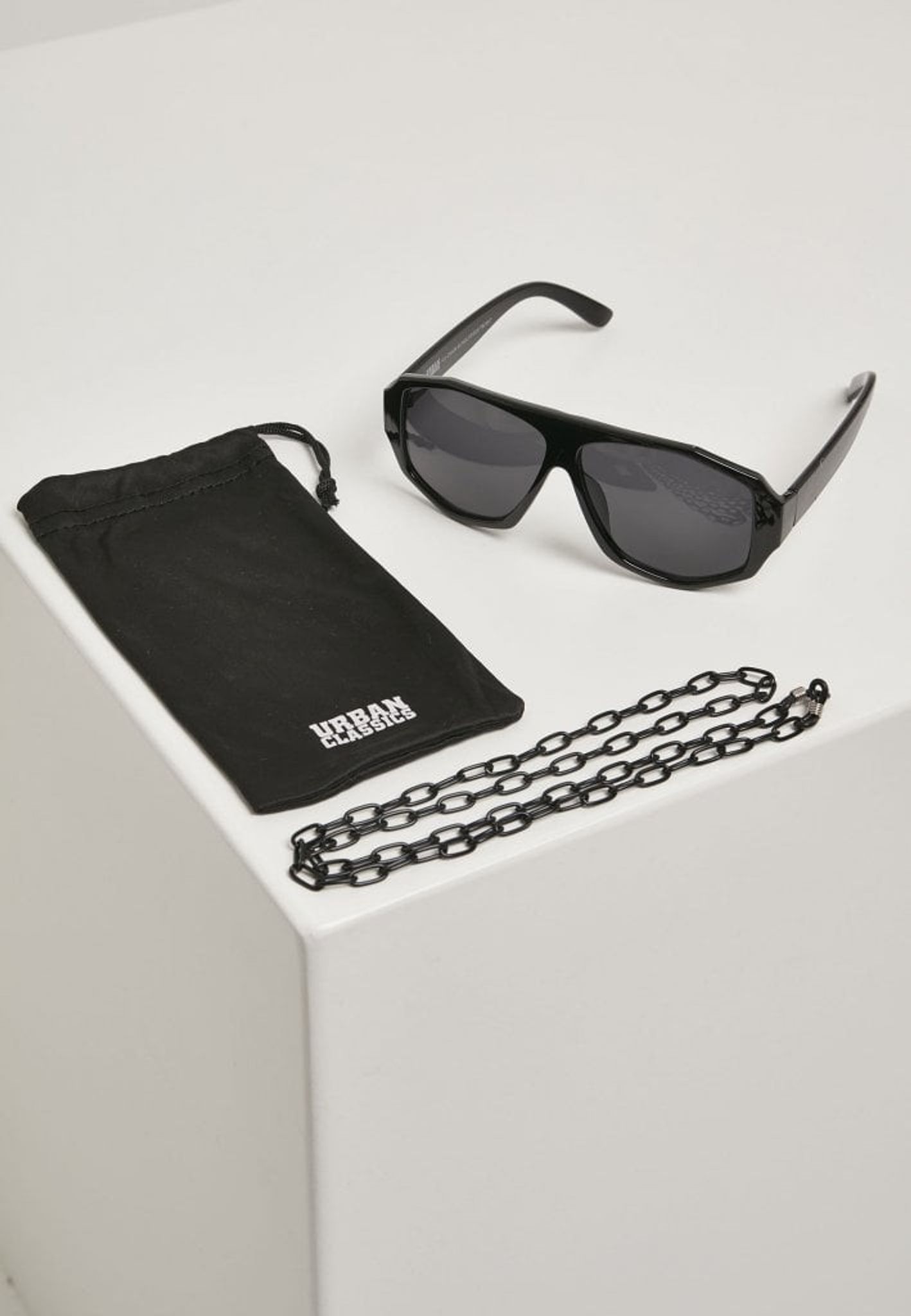 Till solglasögonen kommer även en kedja och en förvaringspåse.