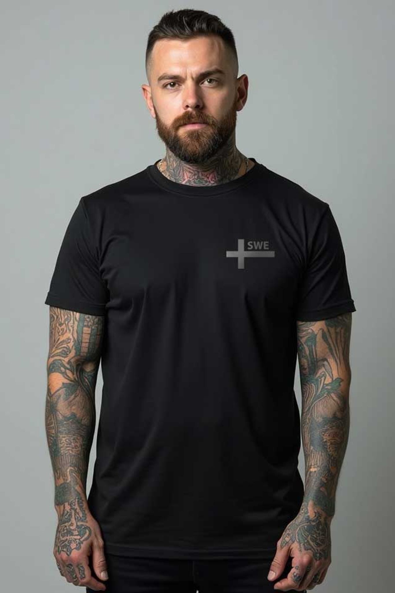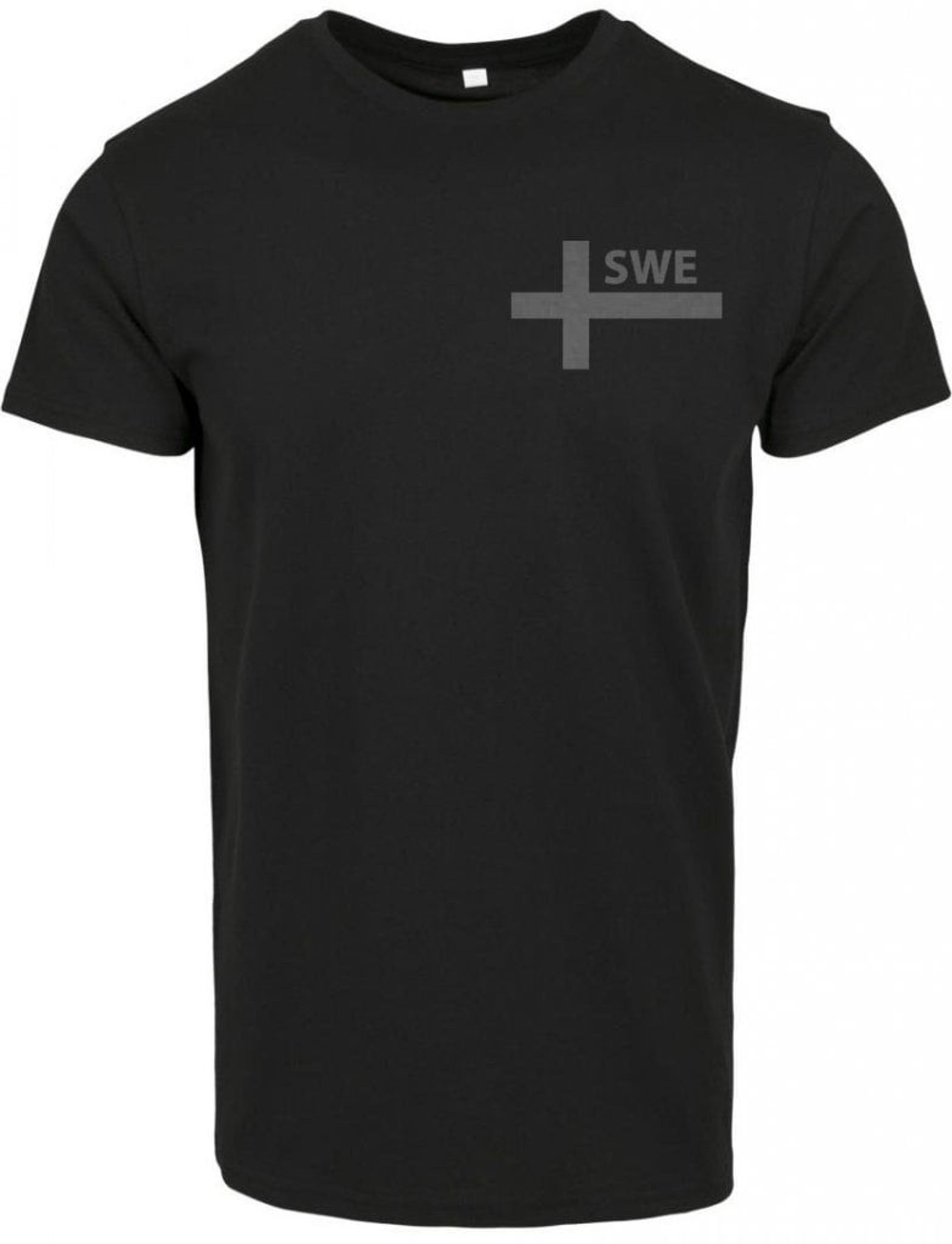En mjuk och bekväm svart t-shirt med en subtil grå version av korset från den svenska flaggan, tillsammans med de matchande bokstäverna "SWE".