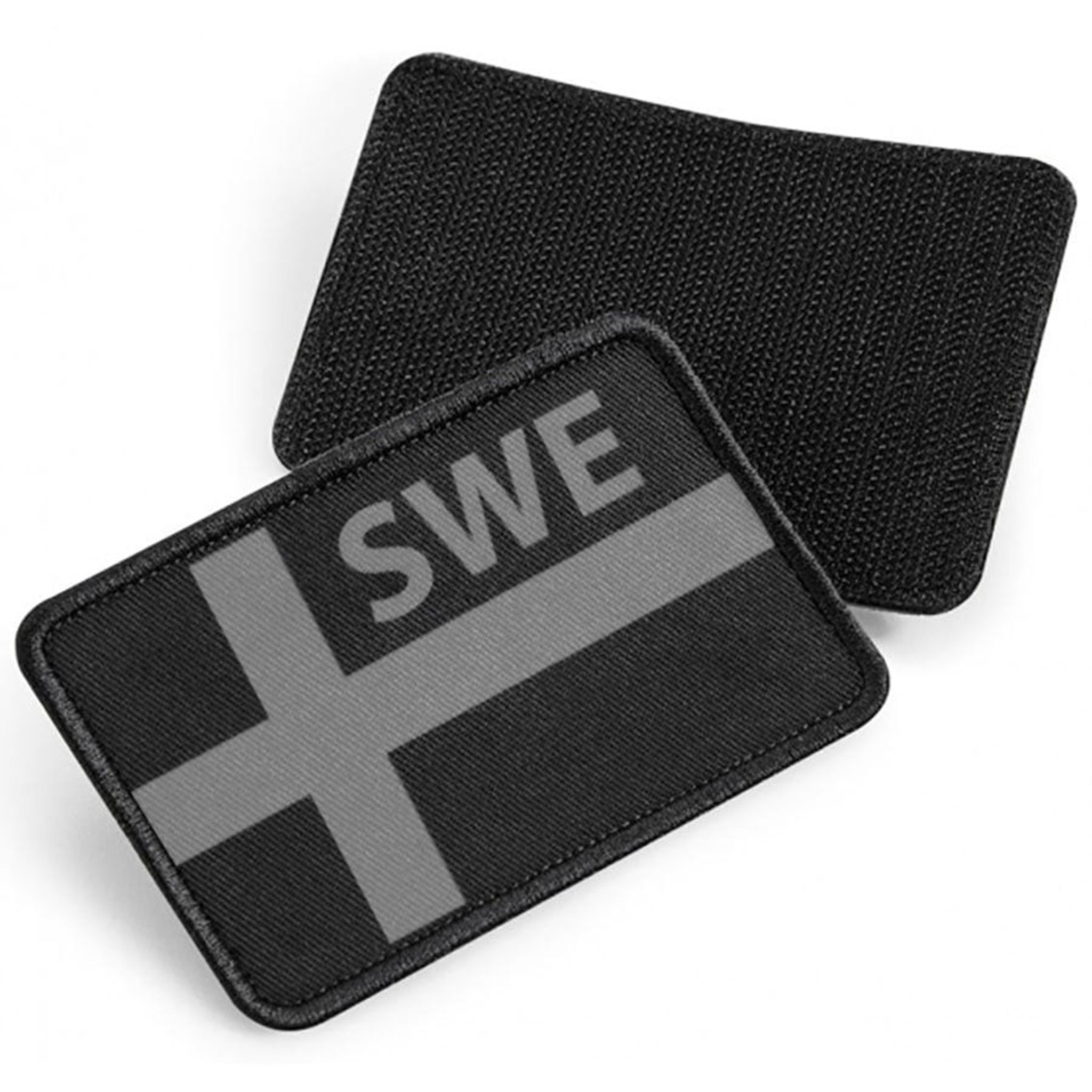 En riktigt snygg tygpatch med svenska flaggan i grått tillsammans med texten SWE i ett av flaggans fönster.