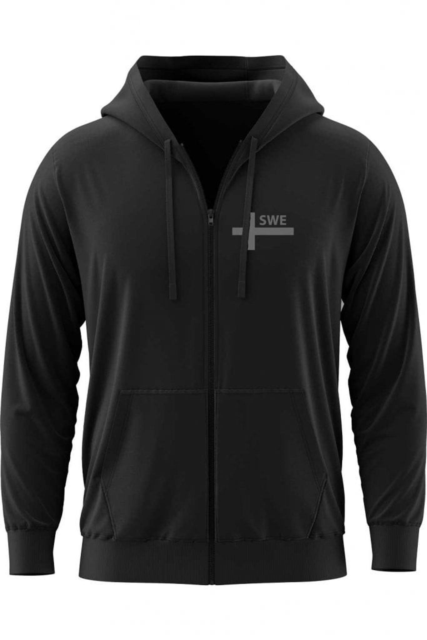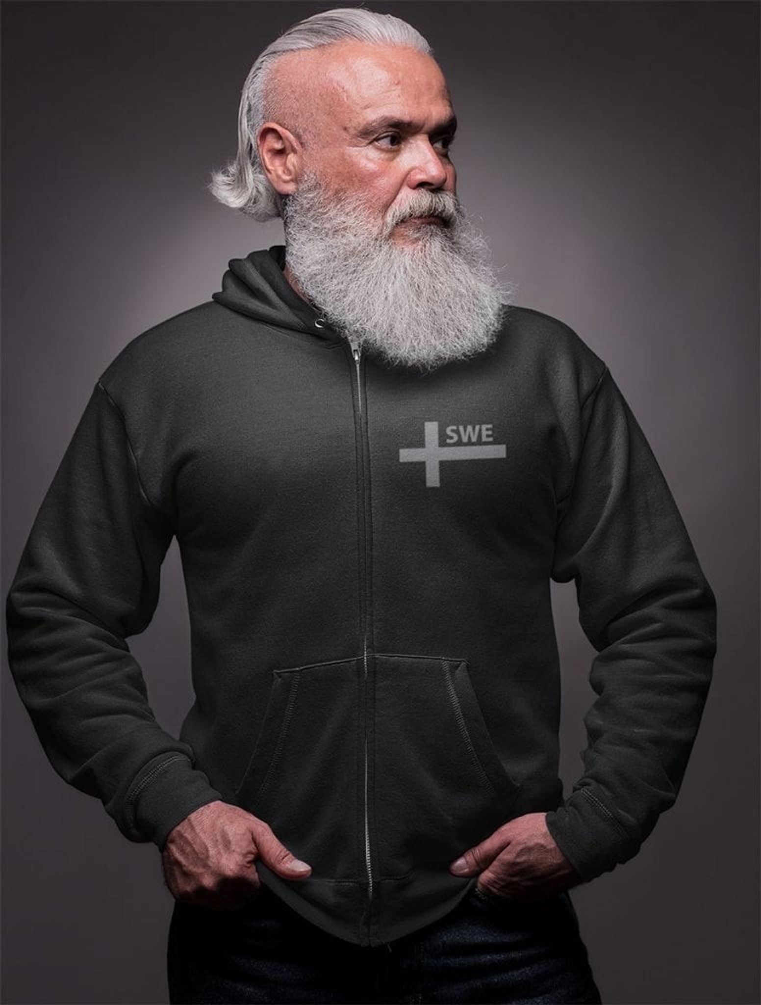 Här har du en riktigt mjuk och skön zip hoodie med en diskret grå version av korset från Sveriges flagga tillsammans med texten SWE.
