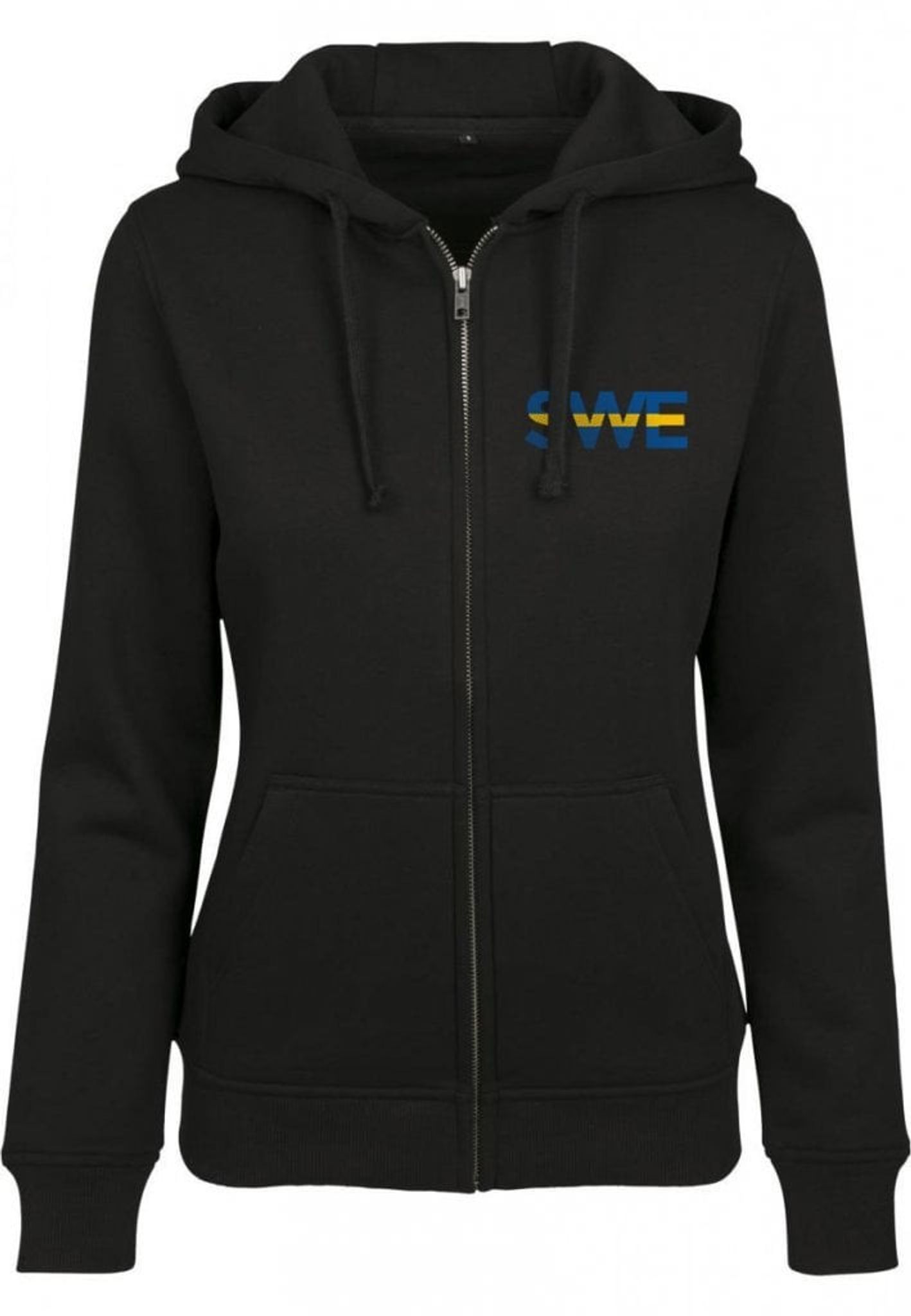 Svart ziphoodie med "SWE" i svenska flaggans färger tryckt på bröstet.