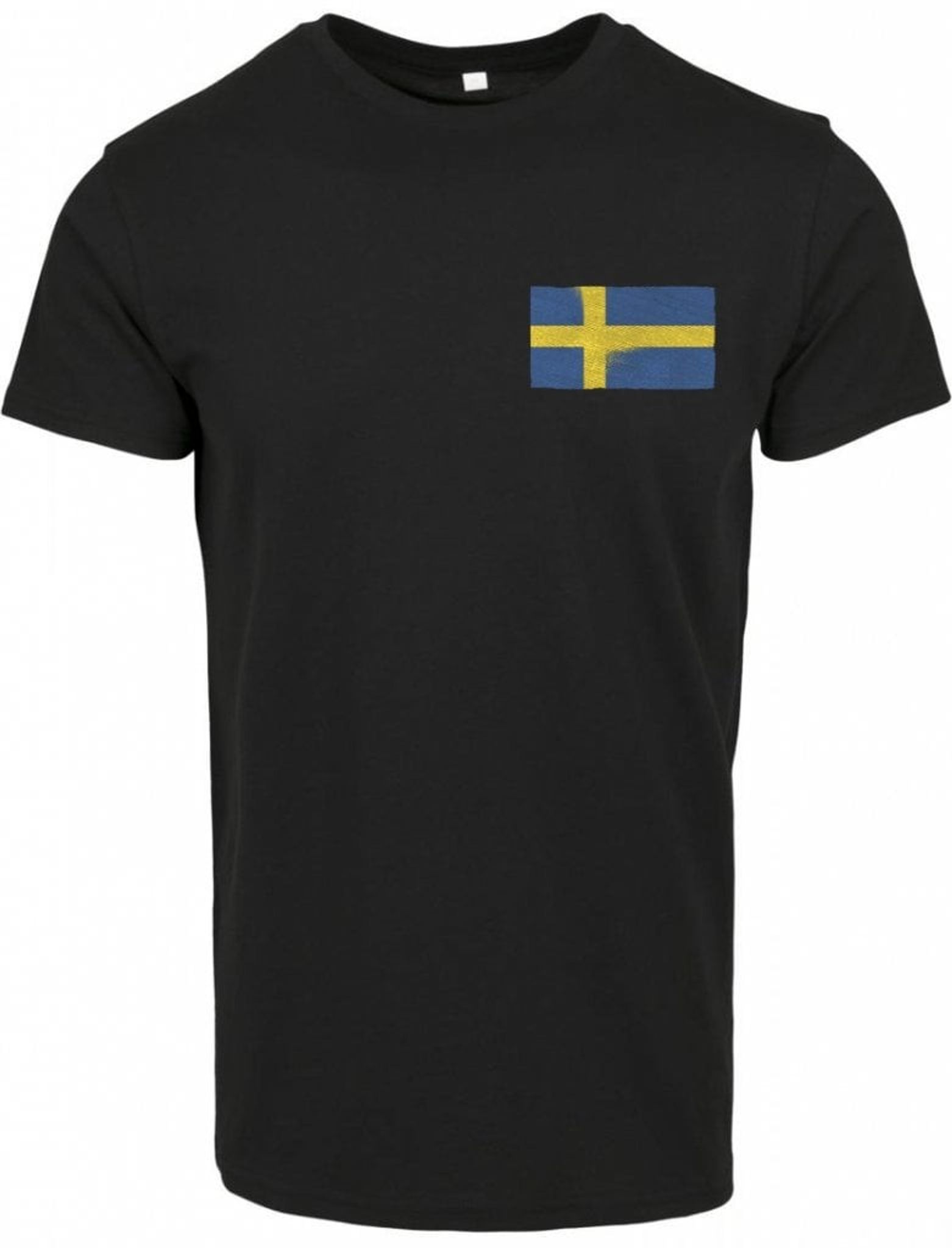 En skön svart T-shirt med en sliten version av den svenska flaggan tryckt på bröstet.
