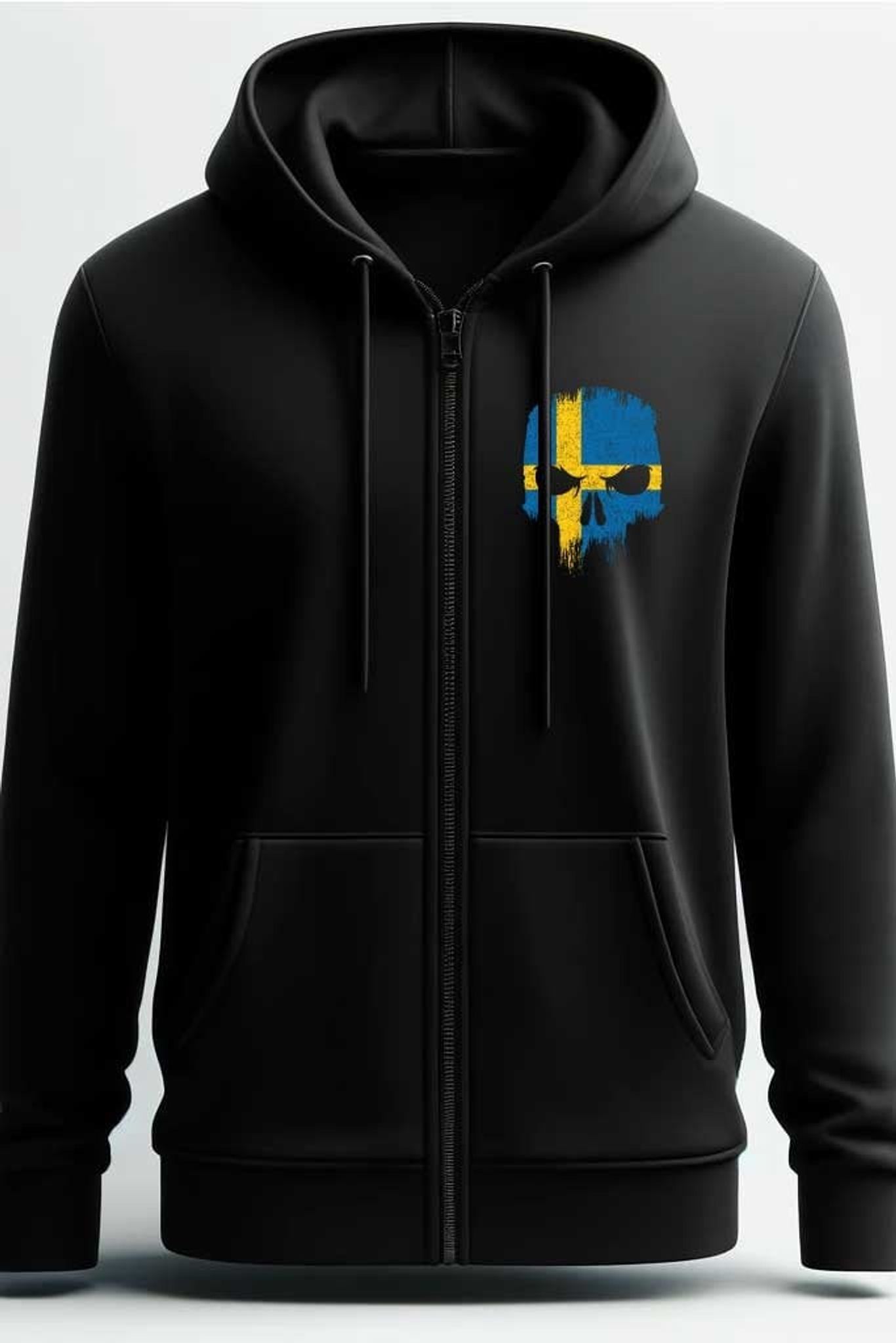 Denna svarta ziphoodie är designad för dig som vill kombinera komfort och en stil som sticker ut. På vänstra sidan av bröstet finns ett tryck av en dödskalle, designad i den svenska flaggans blå och gula färger.