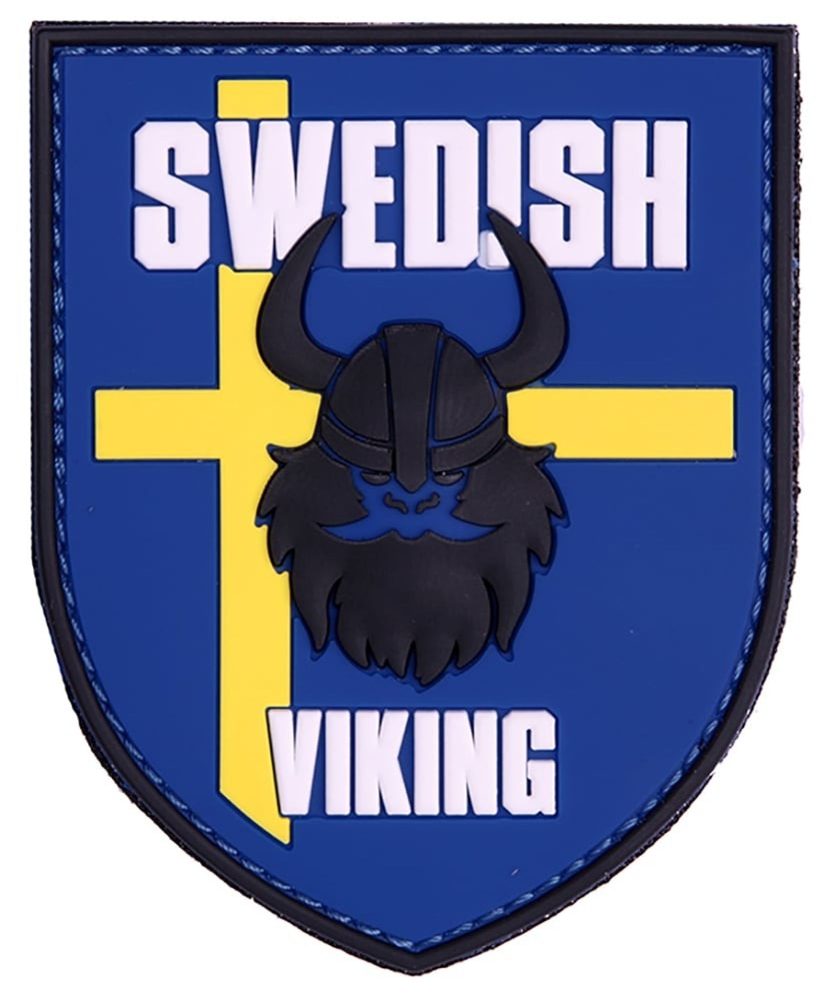 En vapensköld med svenska flaggan, en stor svart viking och texten "Swedish Viking" i vitt. Patchens baksida är försedd med kardborreband (hakar) som gör den möjlig att fästa på ryggsäckar, jackor med mera som har paneler med kardborreband (öglor).