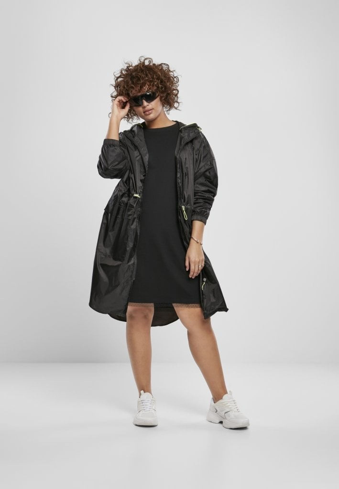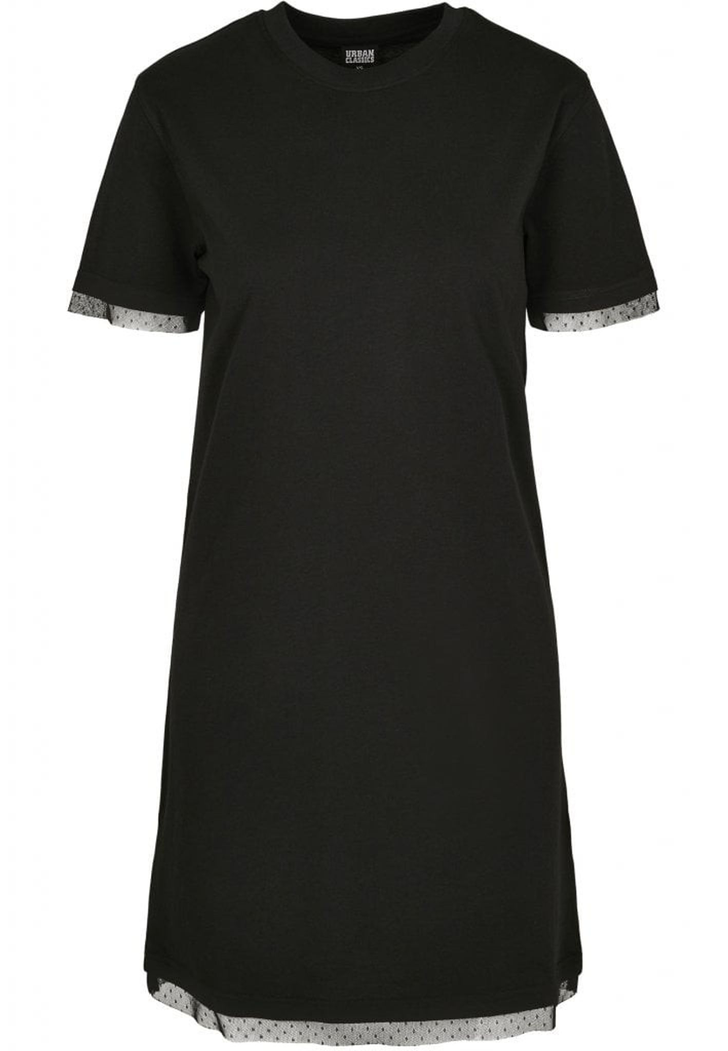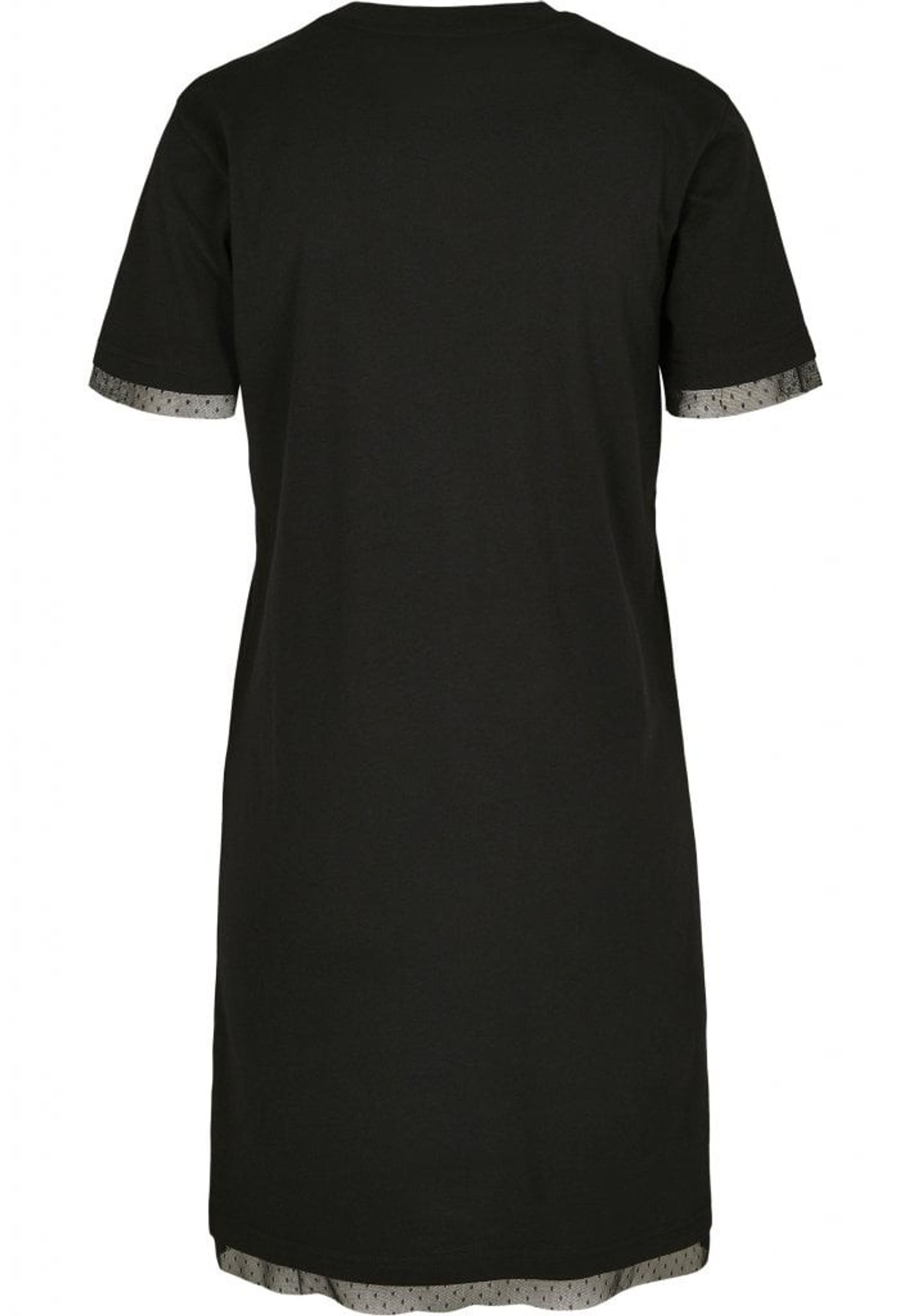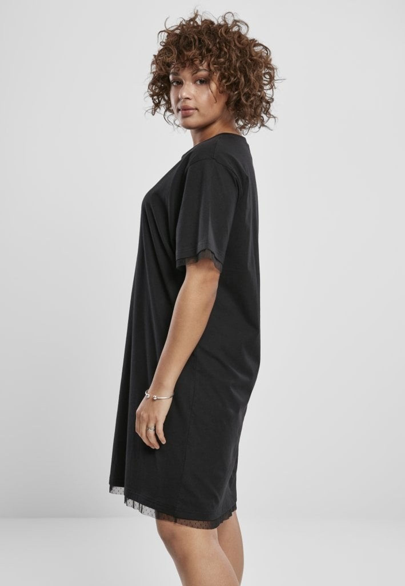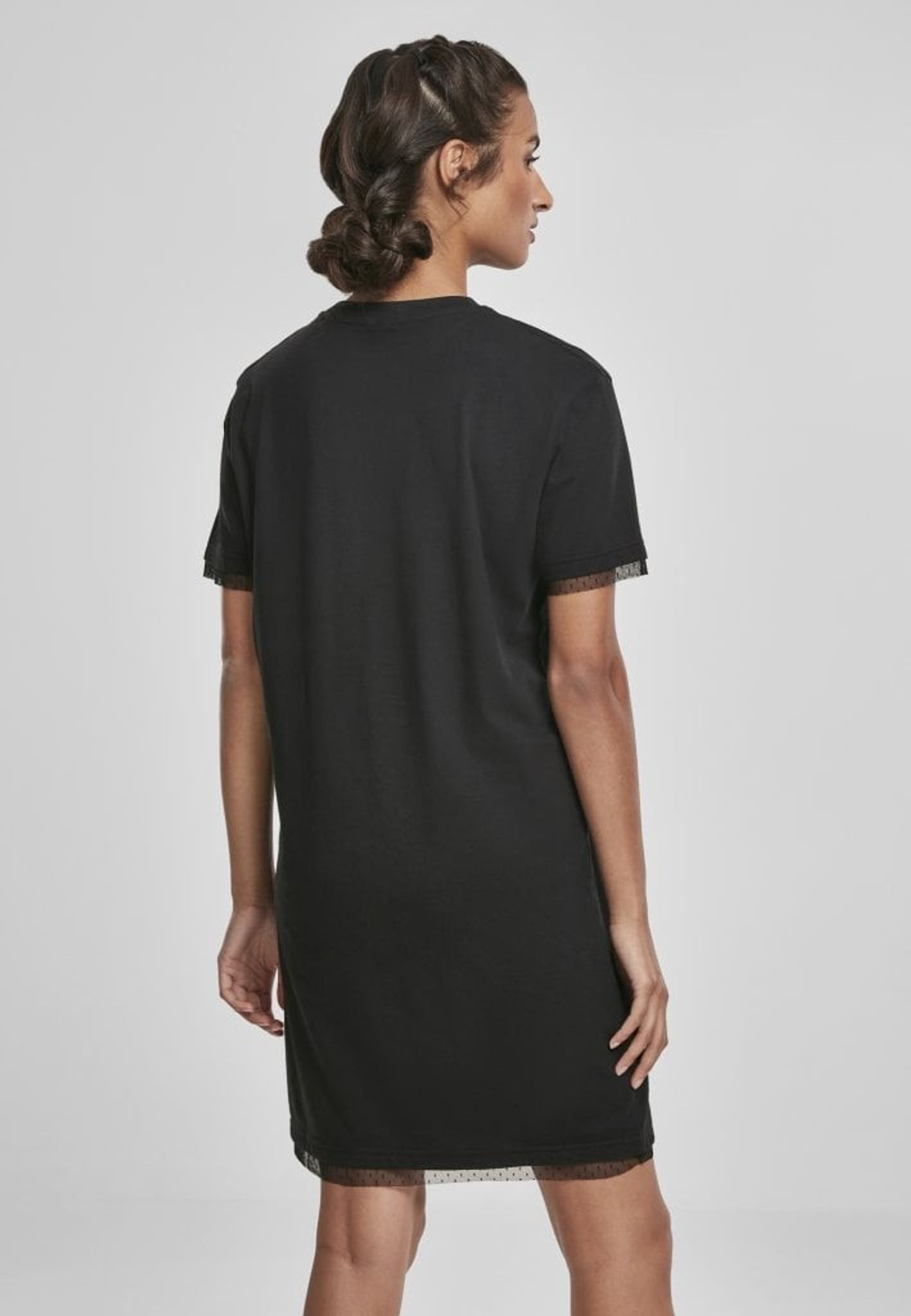 Modellen är extra vid och nederkanten på klänningen har en spets.