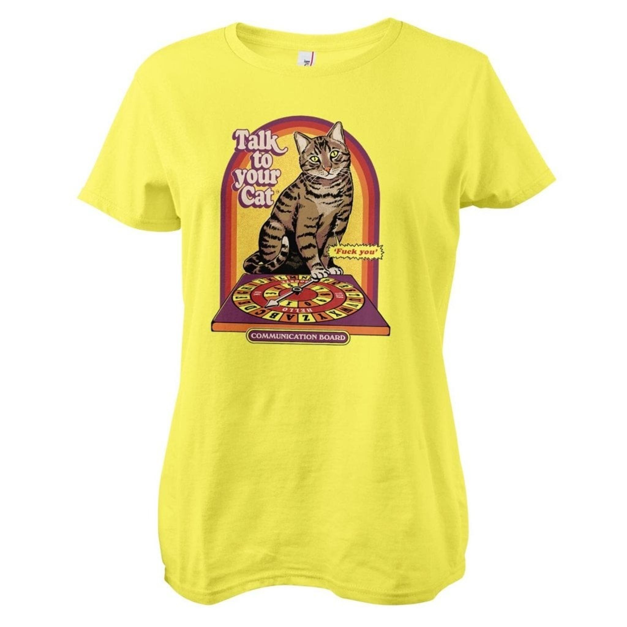 Denna t-shirt har en rolig och ironisk illustration från Steven Rhodes som föreställer en katt sittandes ovanpå en ouijabräda, designad för att likna en kommunikationstavla. Katten uttrycker sitt missnöje med en pratbubbla som lystet säger "Fuck you". En humoristisk tolkning av katters ofta oberäkneliga och självständiga natur som garanterat kommer att få dig att le.